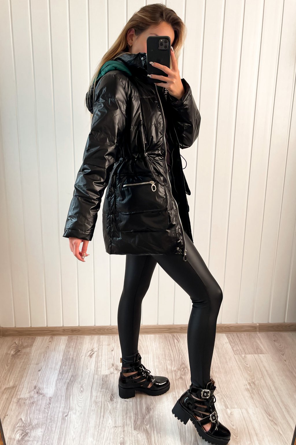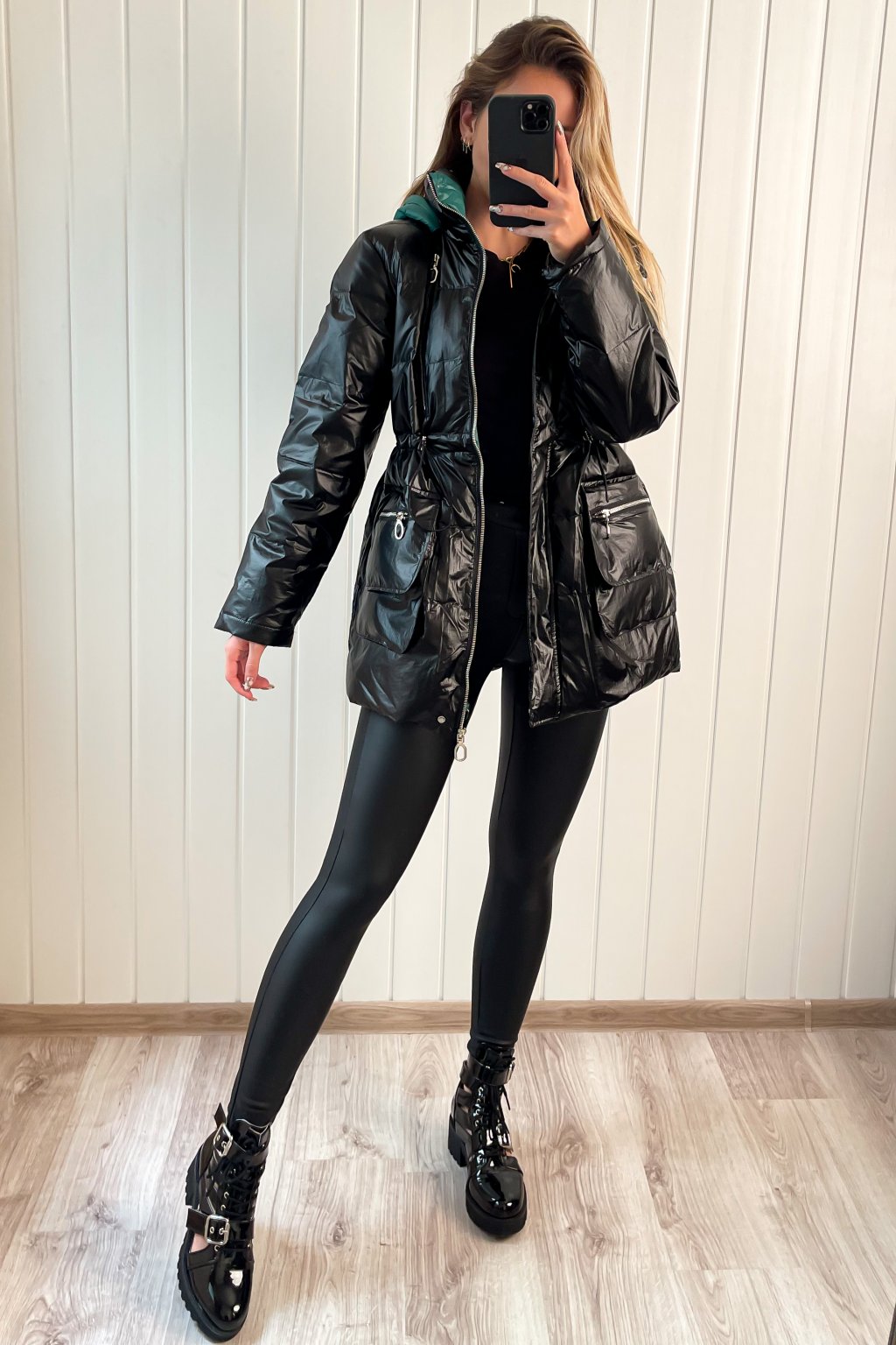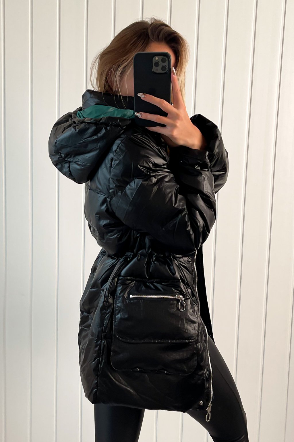 Lesklá prešívaná bunda čierna