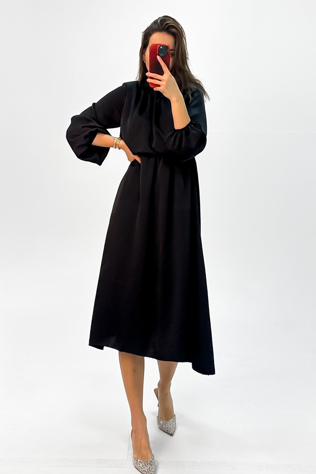 Lesklé elegantné šaty v s dlhým puff rukávom s gumou v páse a riaseným vŕškom. Opasok nie je súčasťou produktu.