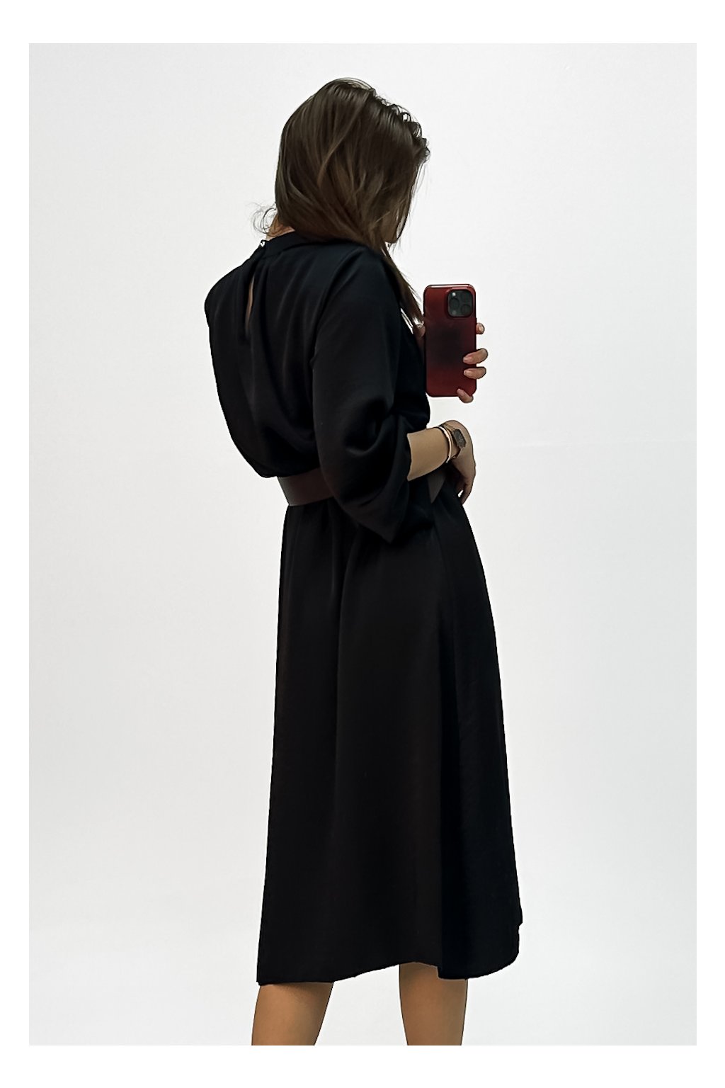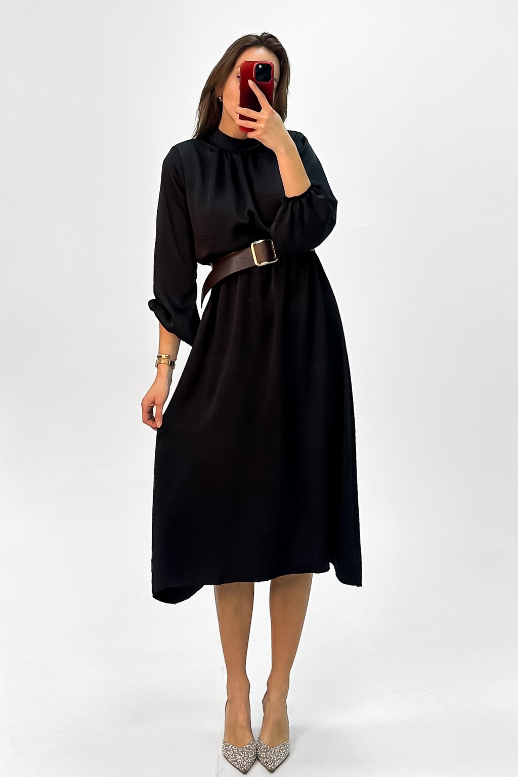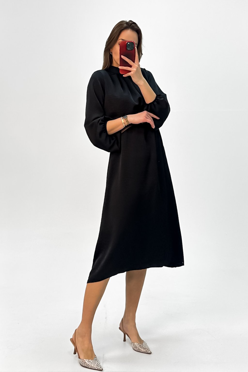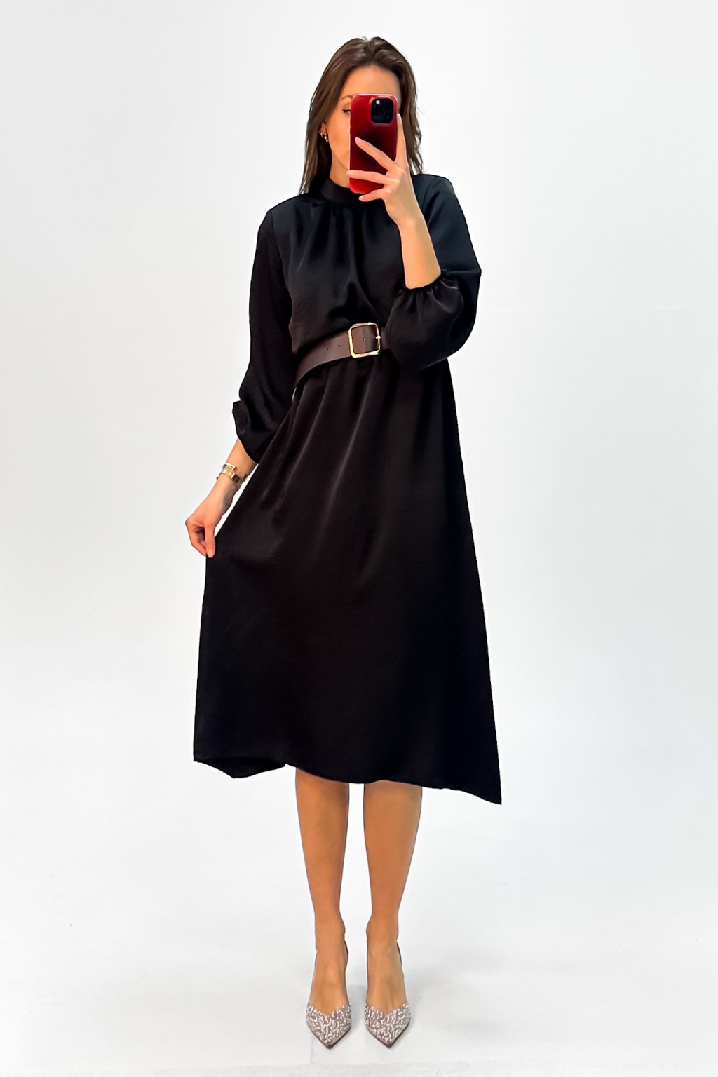 Lesklé elegantné šaty v s dlhým puff rukávom s gumou v páse a riaseným vŕškom. Opasok nie je súčasťou produktu.