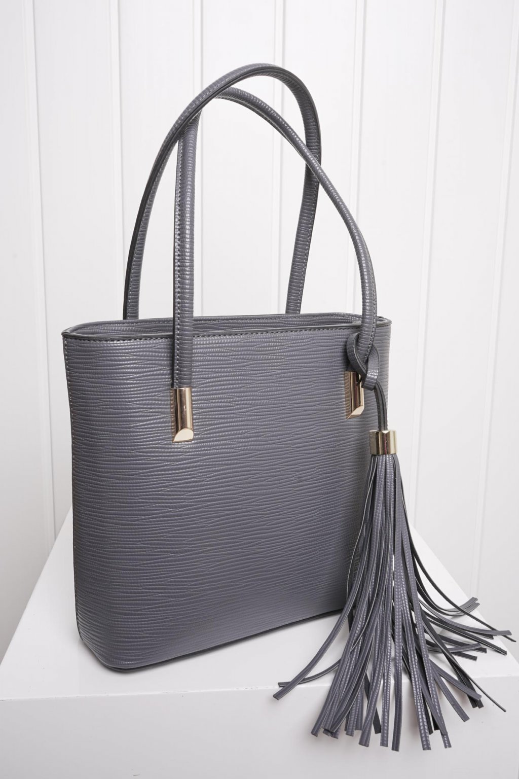 Šedá kabelka zo vzorovanej napodobeniny kože so zlatými kovaniami rúčok a pridaným strapcovým príveskom.