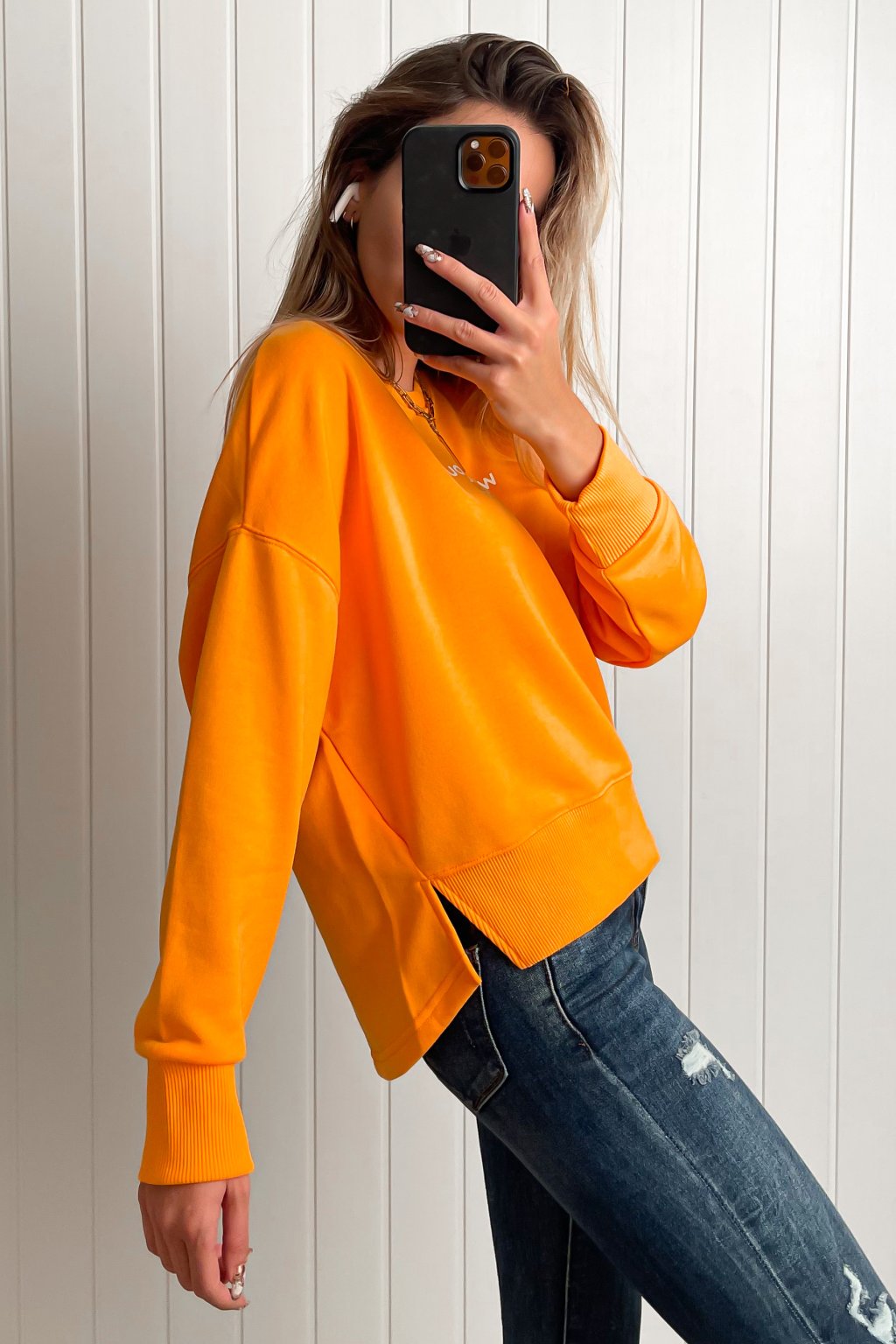 Bavlnená mikina s nápisom "who is your stylist" a rozparkami na bokoch, zadna strana jemne predĺžená.