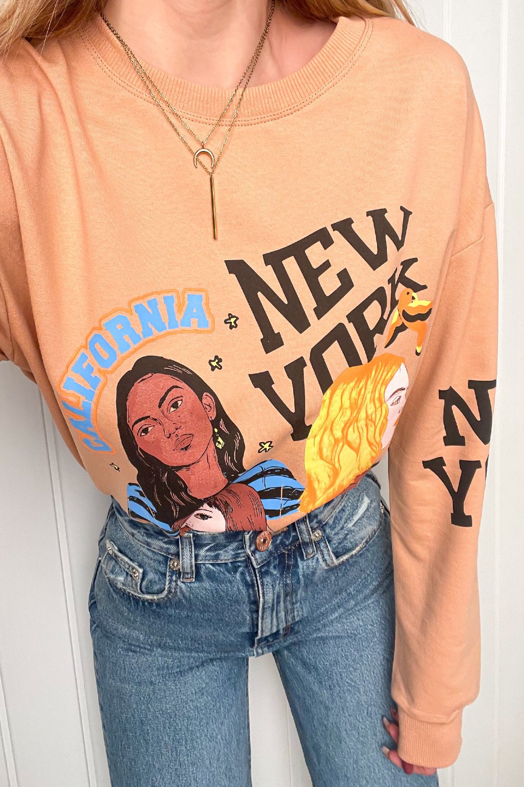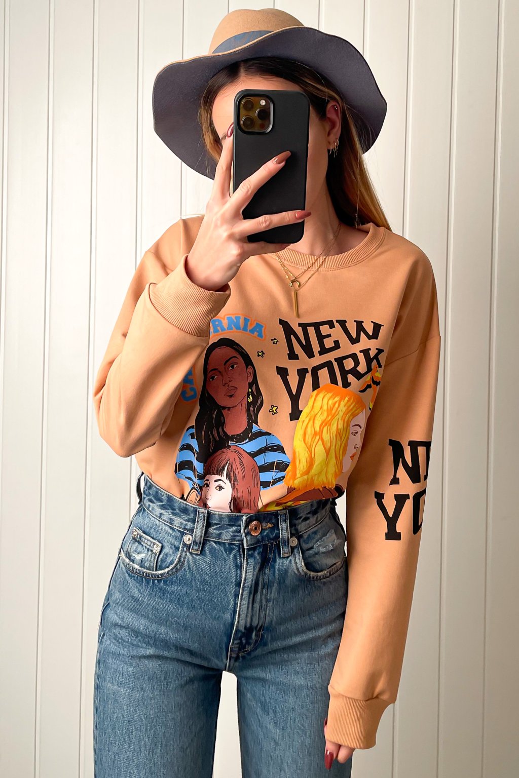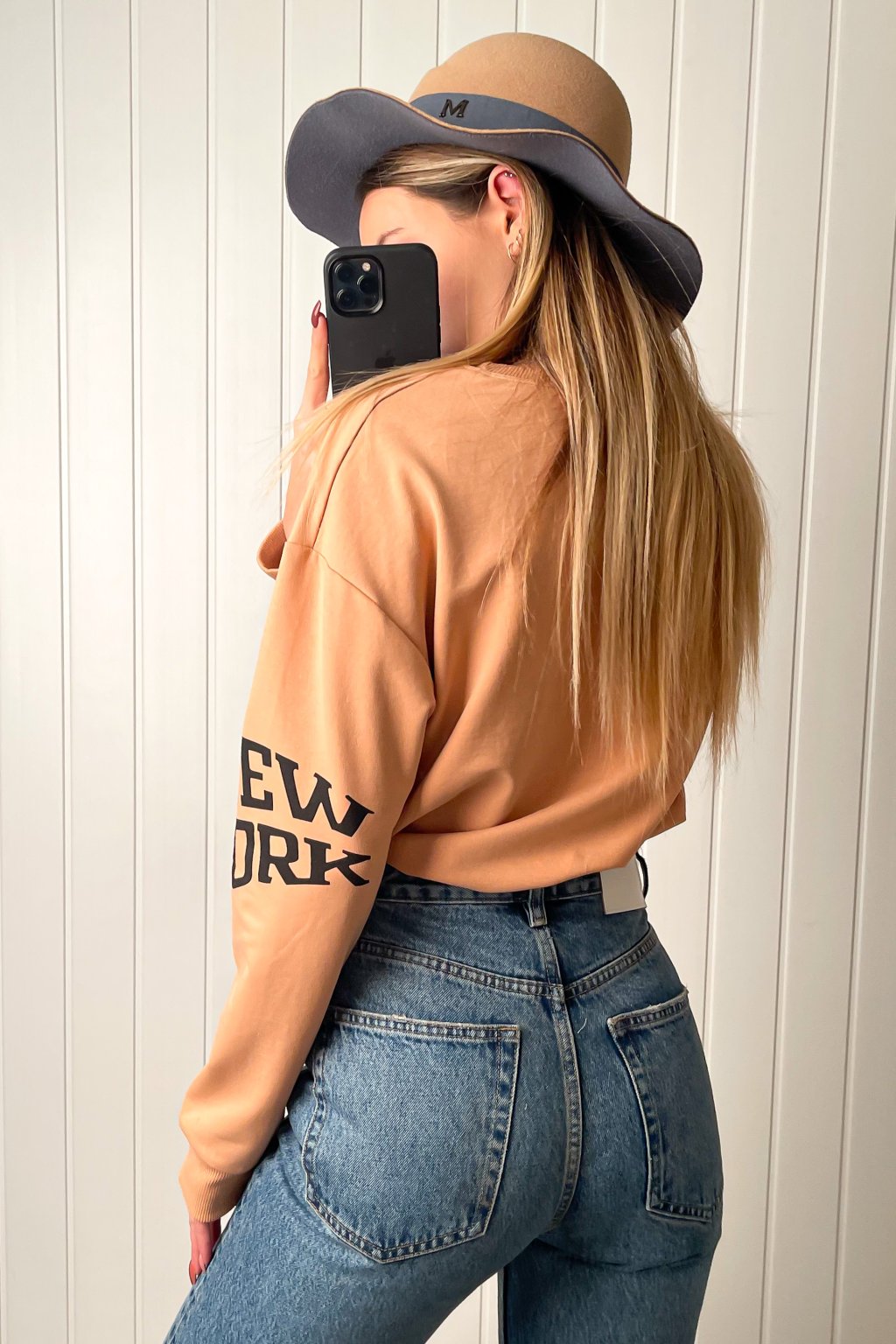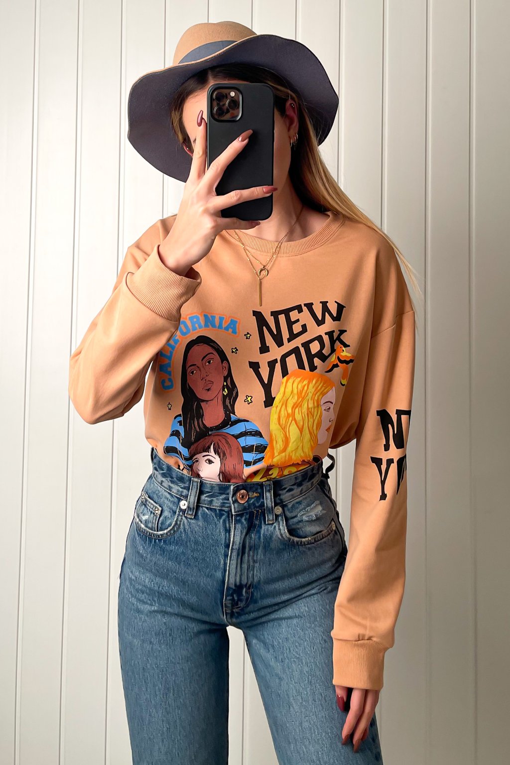 Béžová mikina v oversize strihu bez spodného patentu s potlačou.
