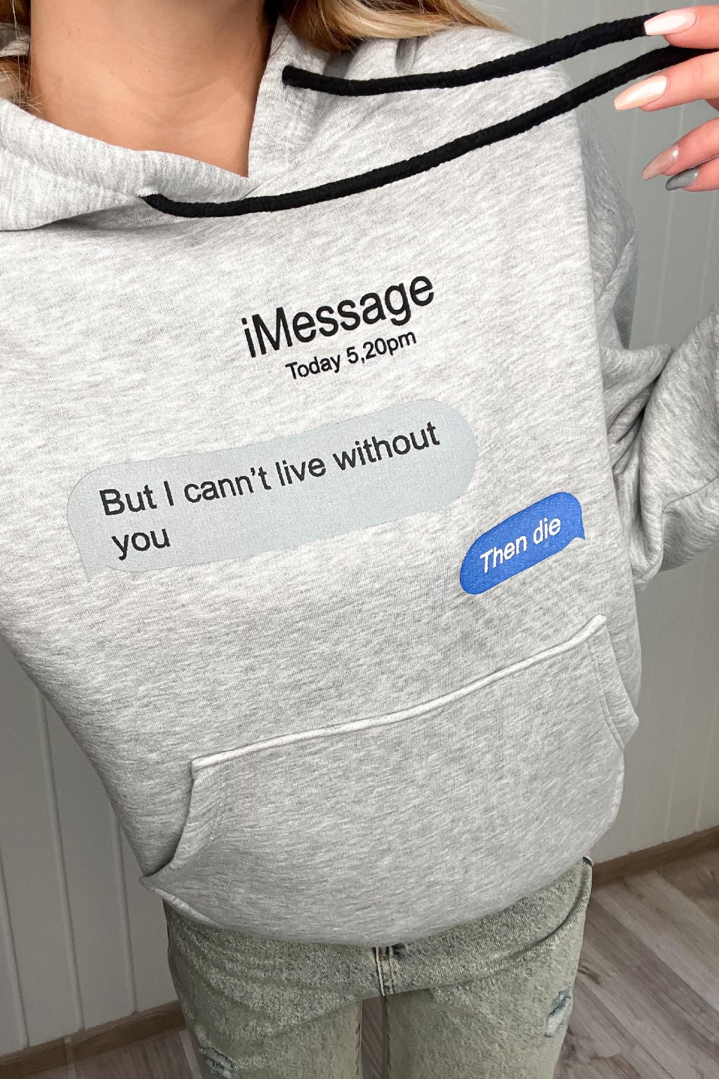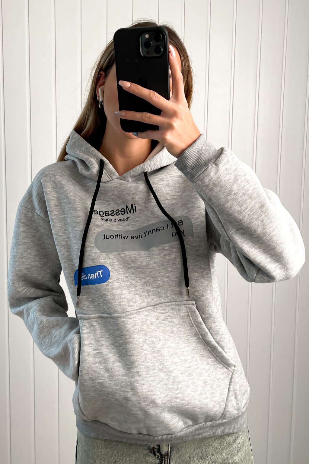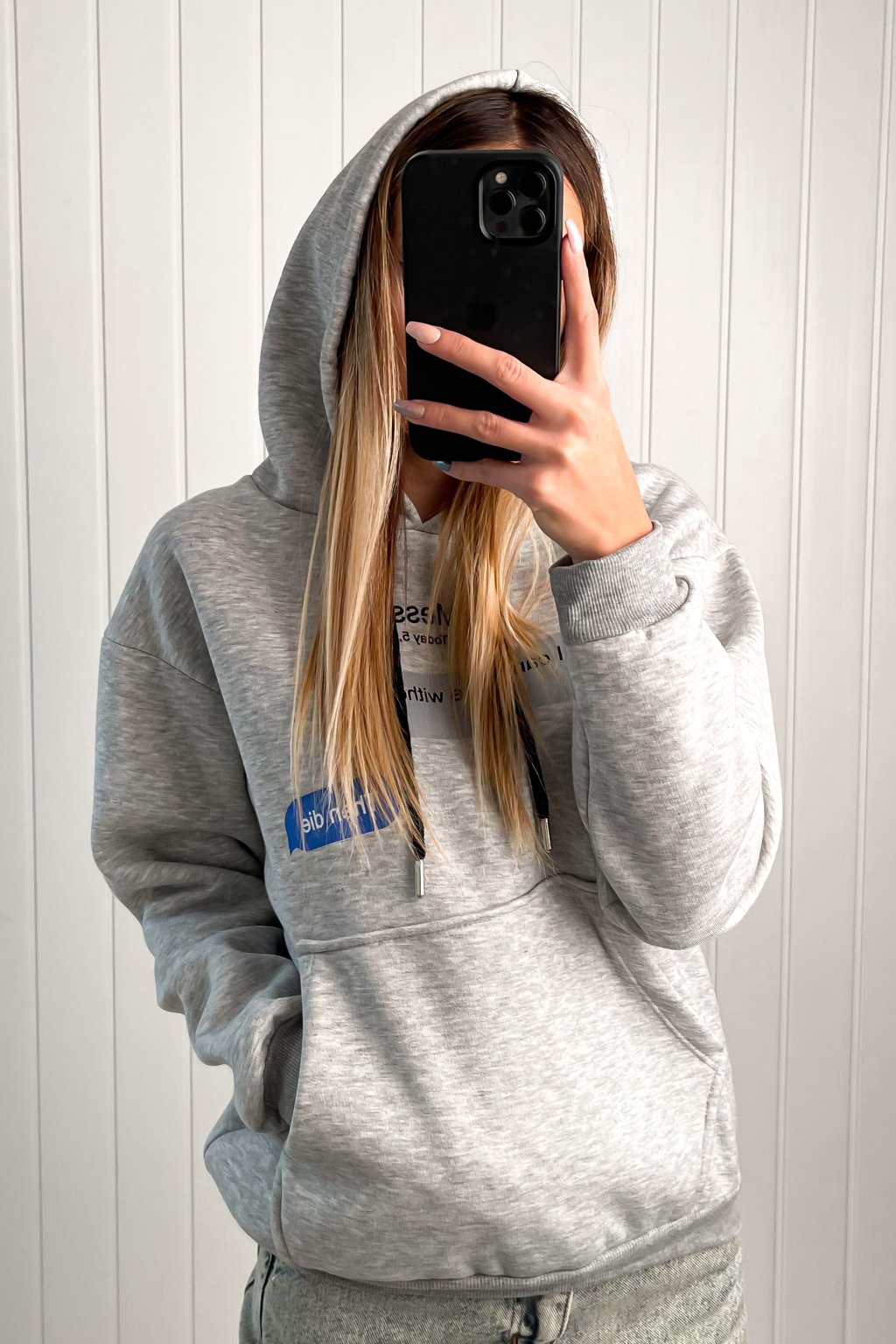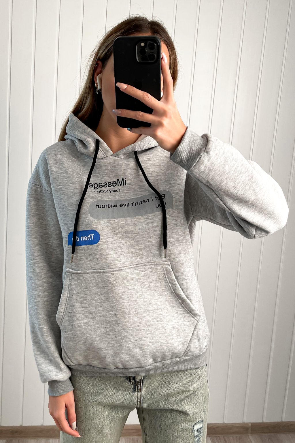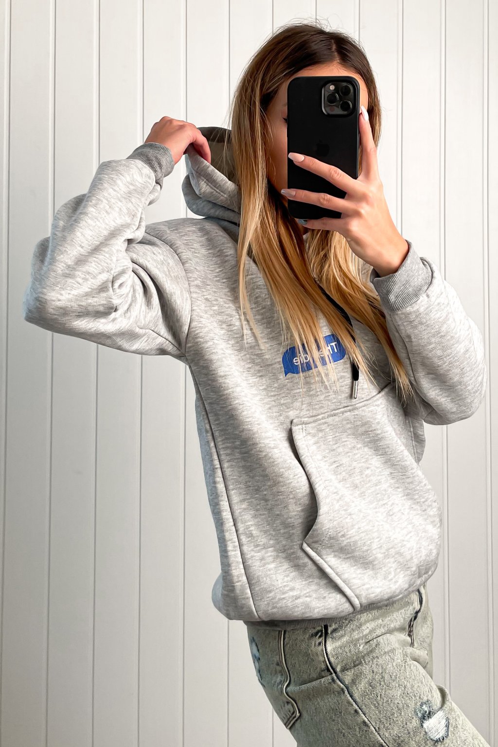 Zateplená sivá mikina s kapucňou a stredovým vreckom.
