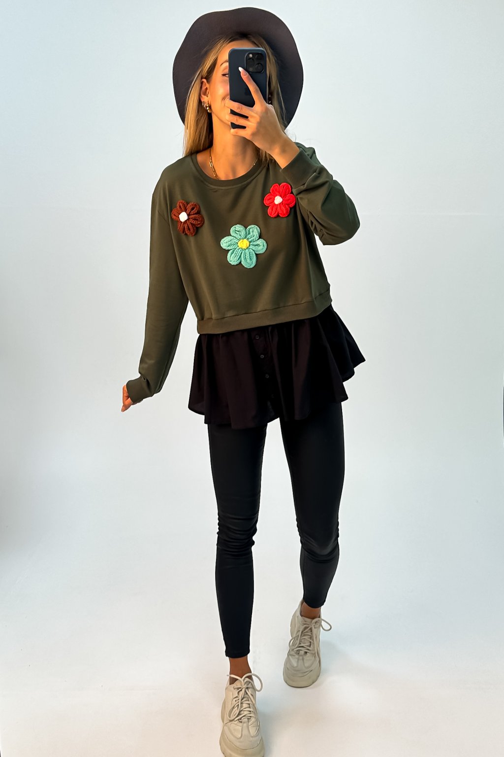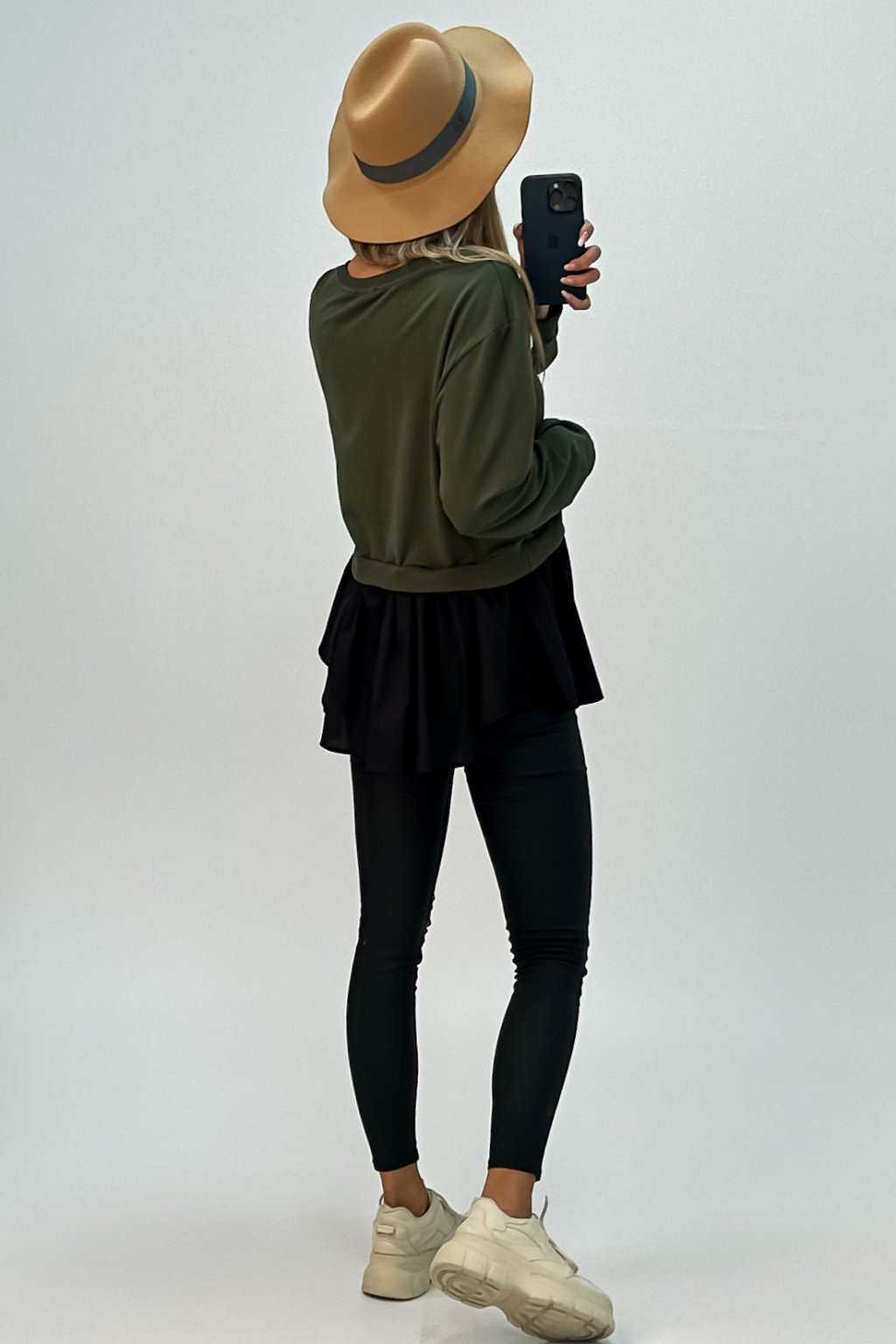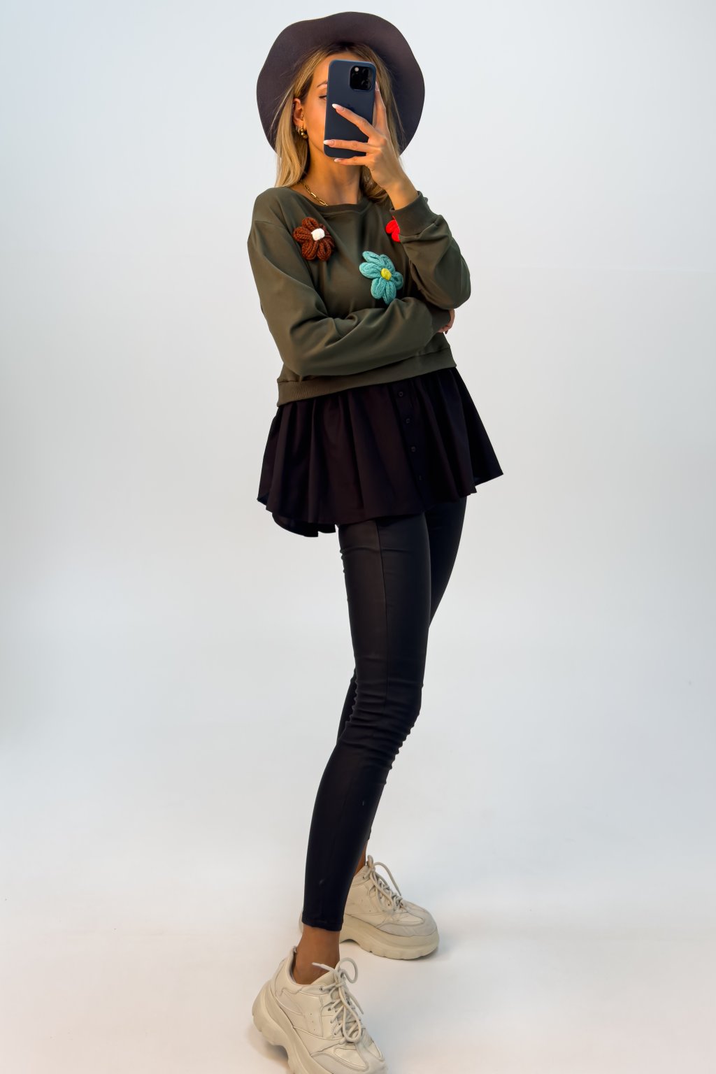 Mikinka vo voľnom strihu ukončená nariasenou košeľou na gombiky.