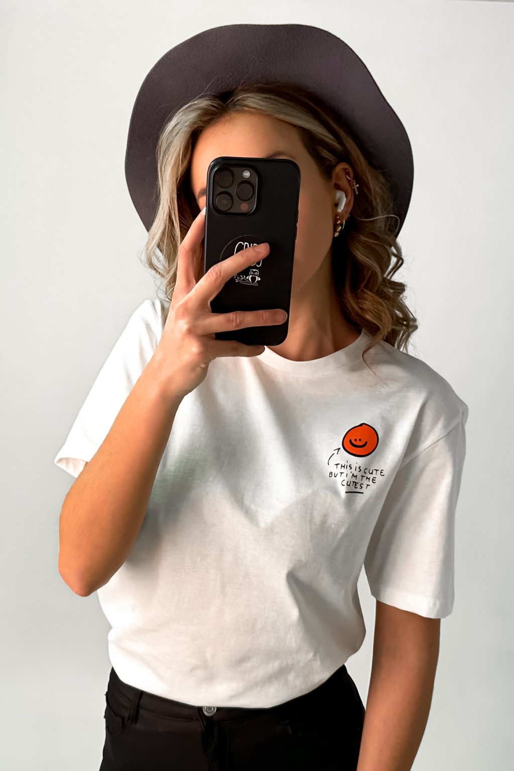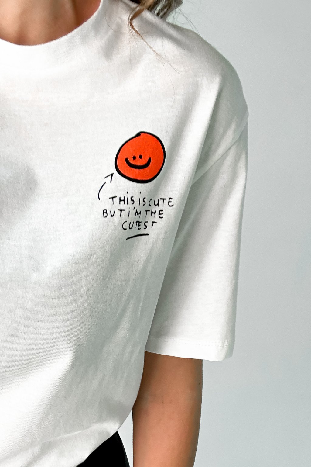 Biele tričko zo 100%nej bavlny s farebnou potlačou a textom "this is cute but I'm the cutest".