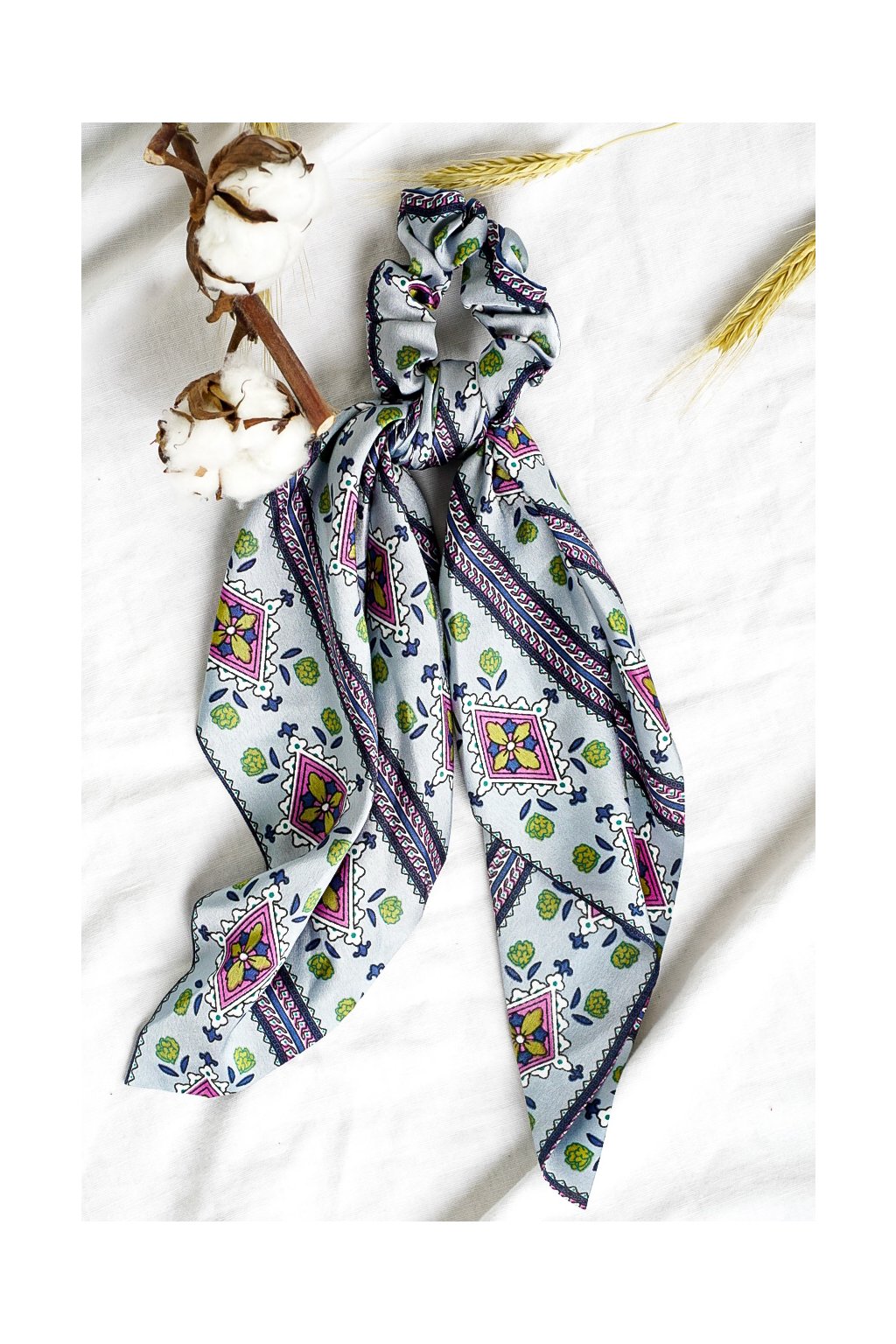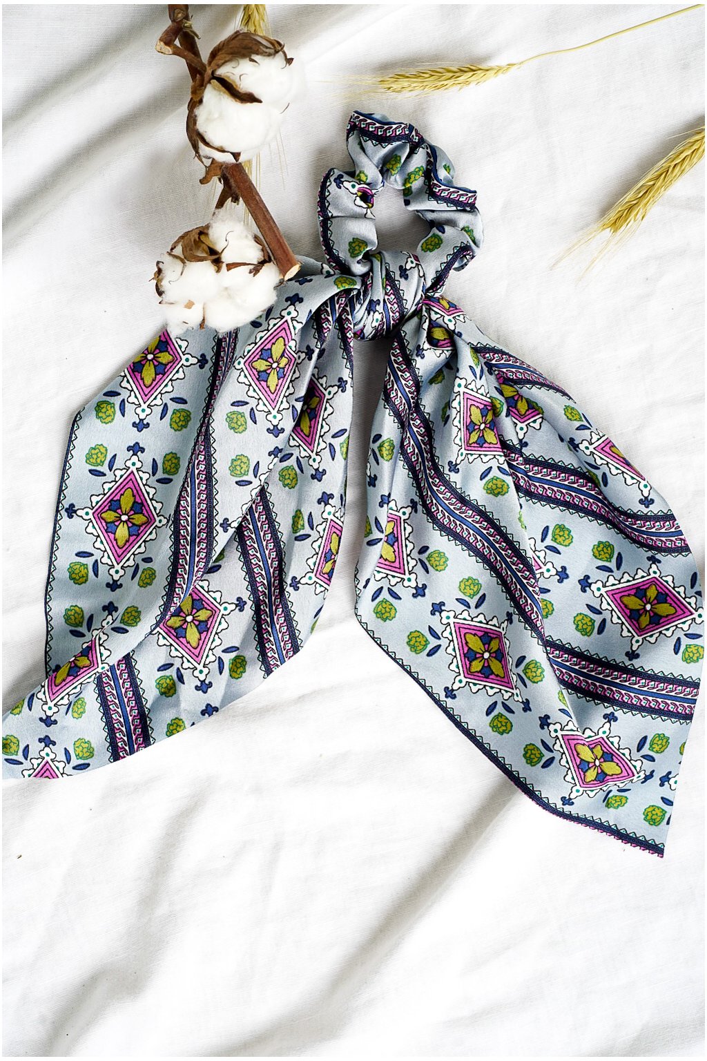 Veľká retro gumička do vlasov z modrej saténovej látky s farebnou potlačou a dlhou odoberateľnou mašľou.