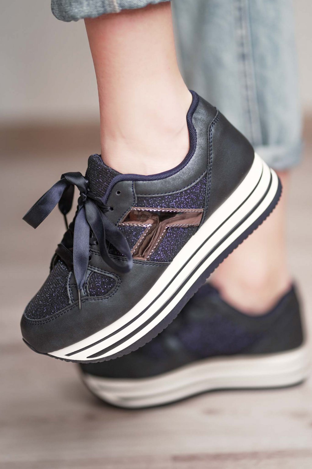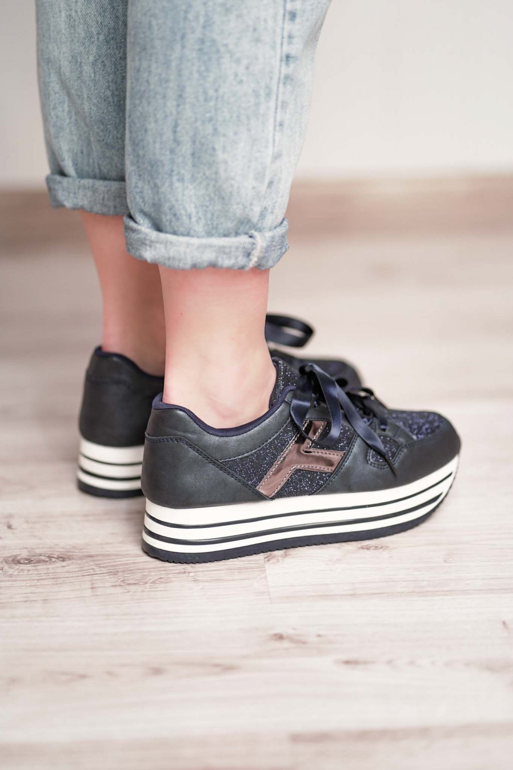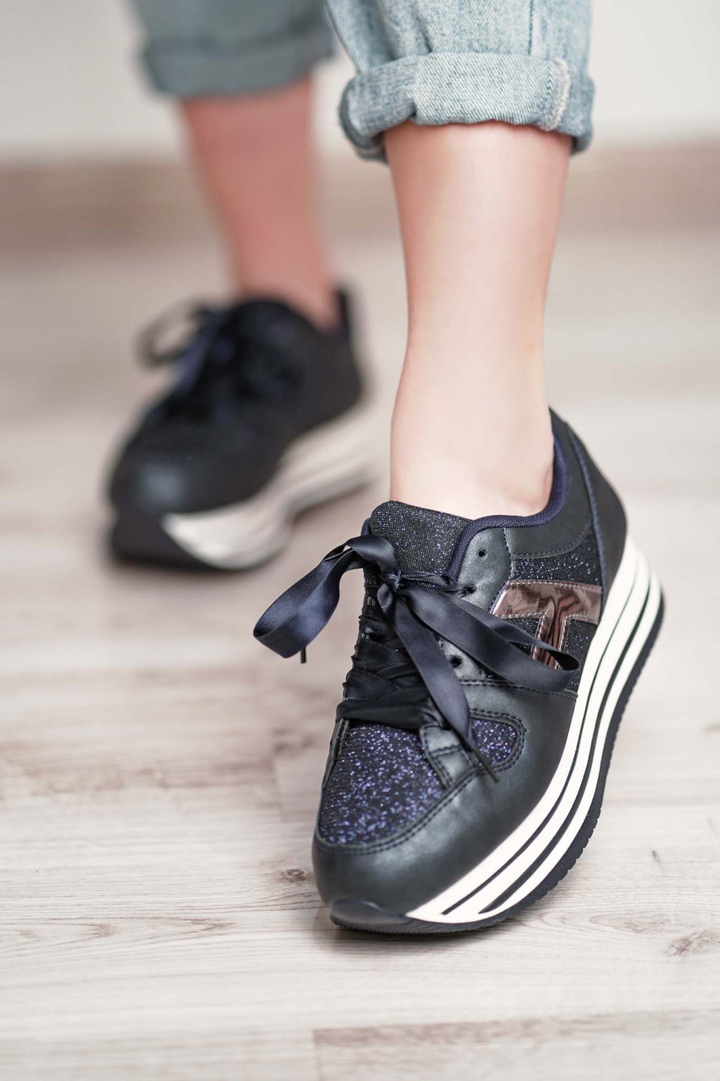 Tmavomodré tenisky z trblietavej imitácie kože na 4 centimetrovej prúžkovanej platforme so zdvihnutou špičkou zdobené metalickým prúžkom a viazaním na modrú stuhu.