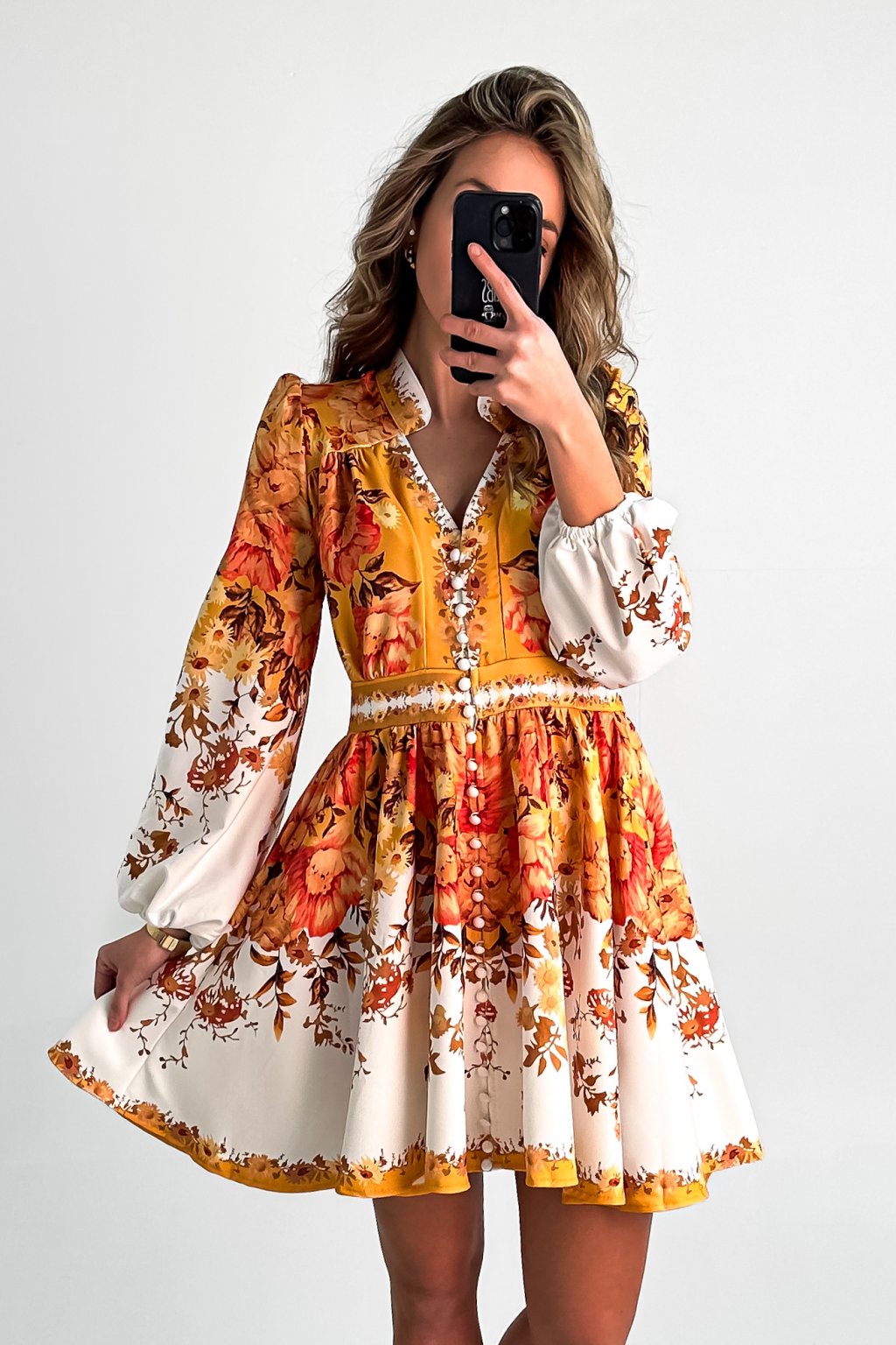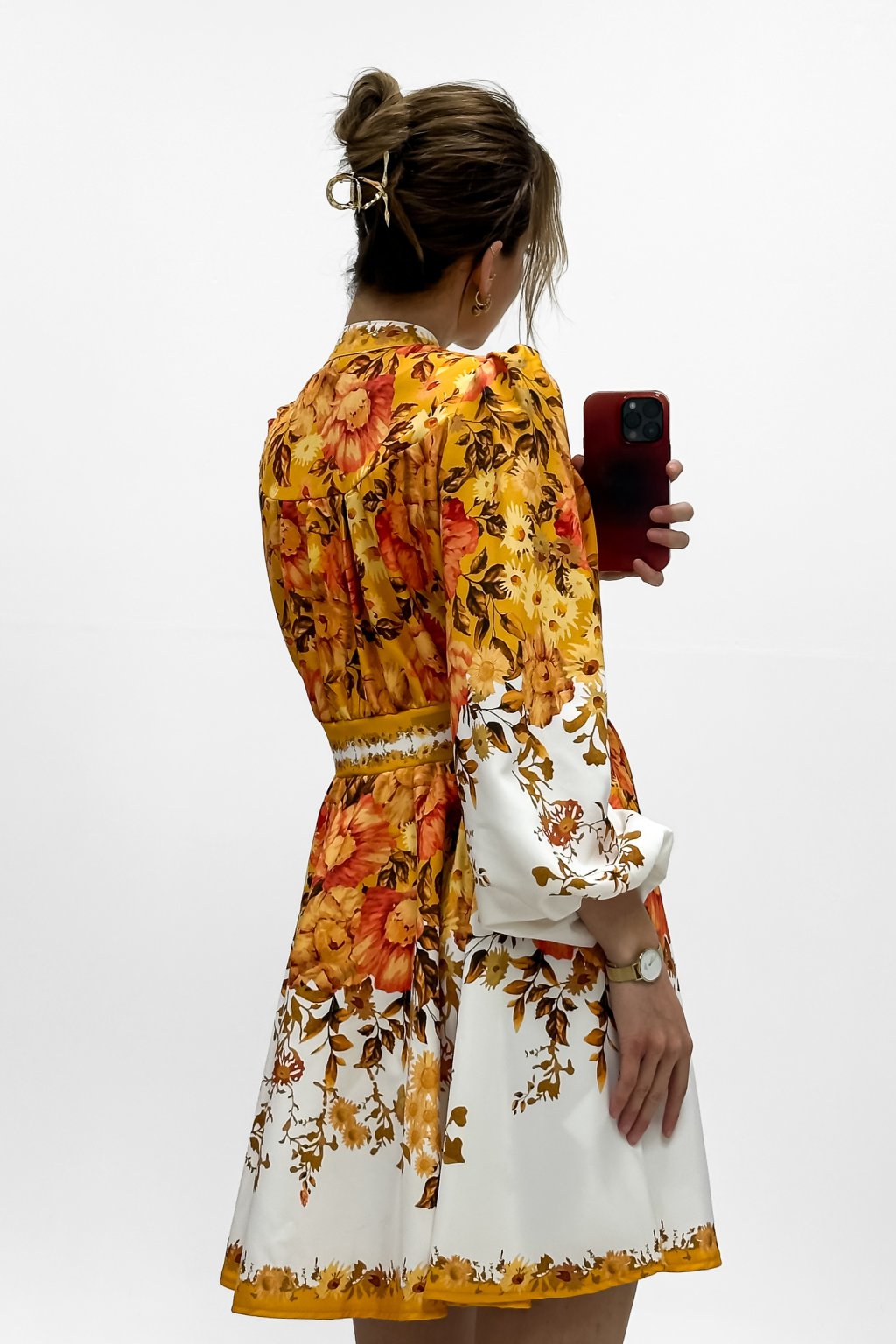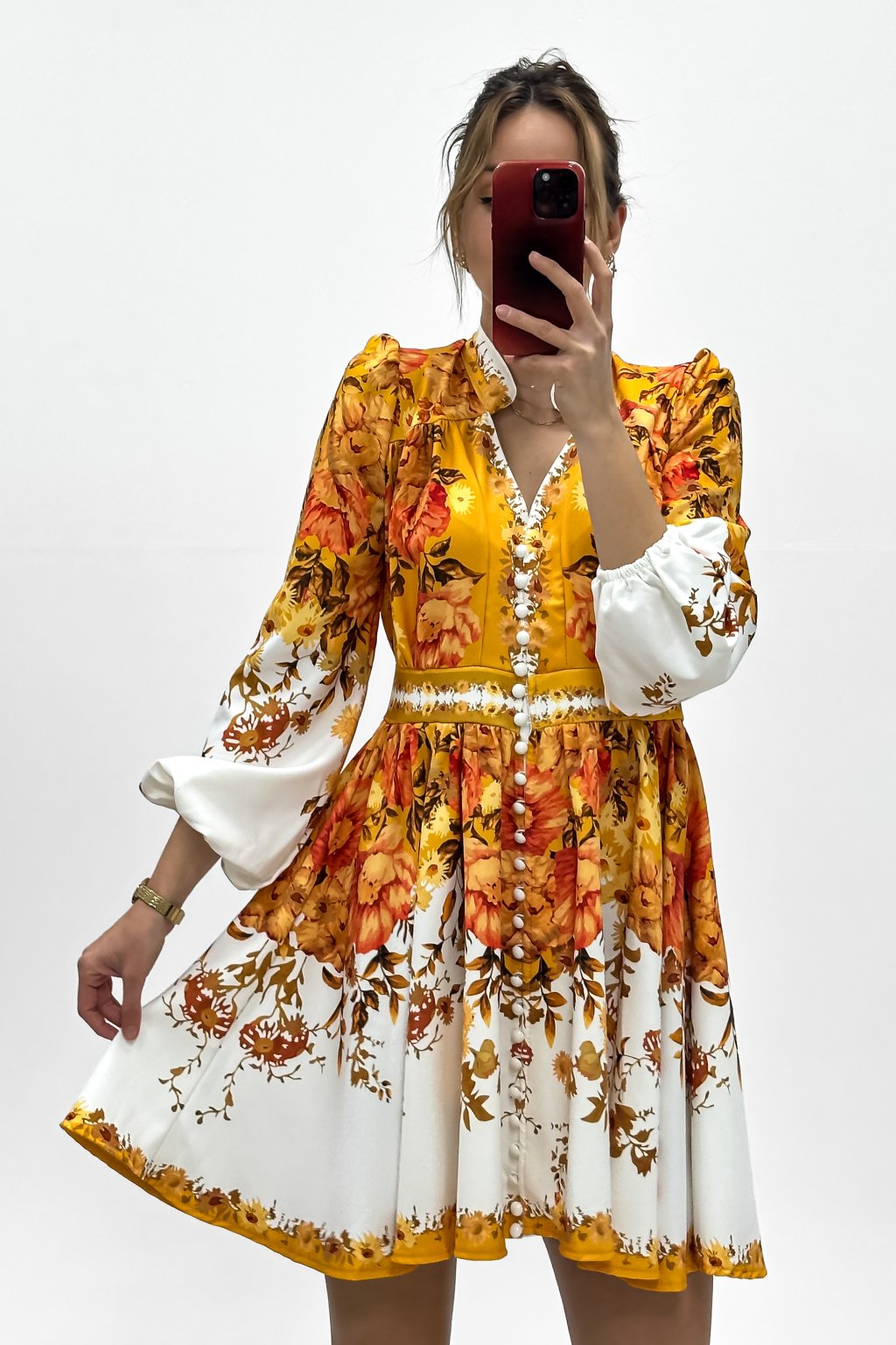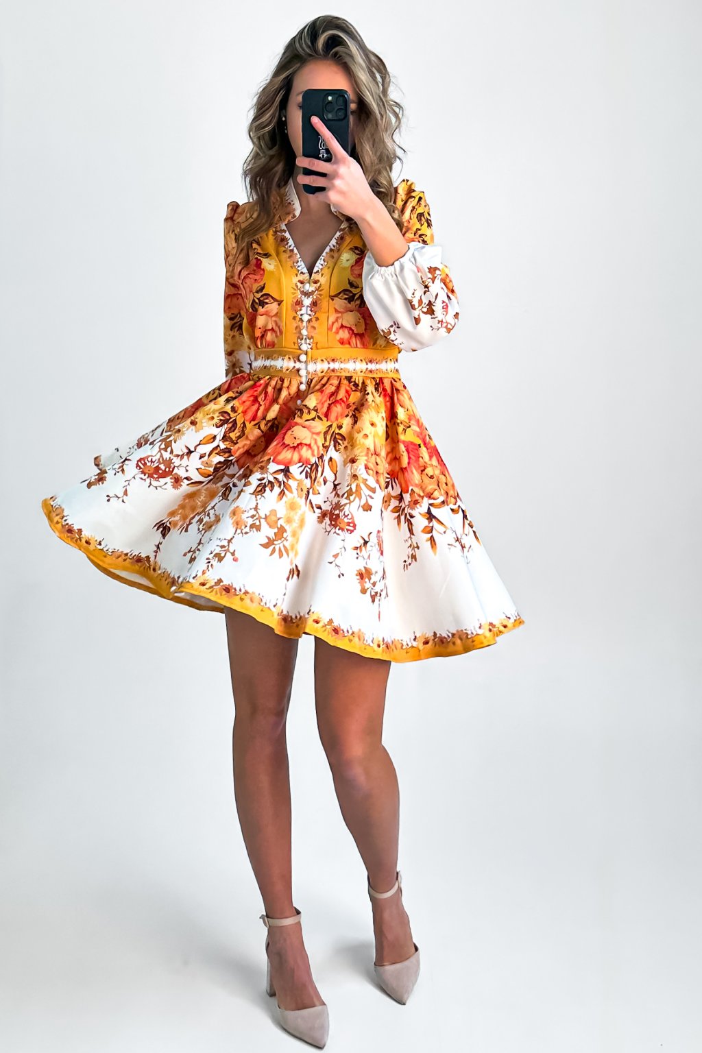 Oranžovo-biele kvetinové spoločenské šaty v A-strihu s puff rukávmi