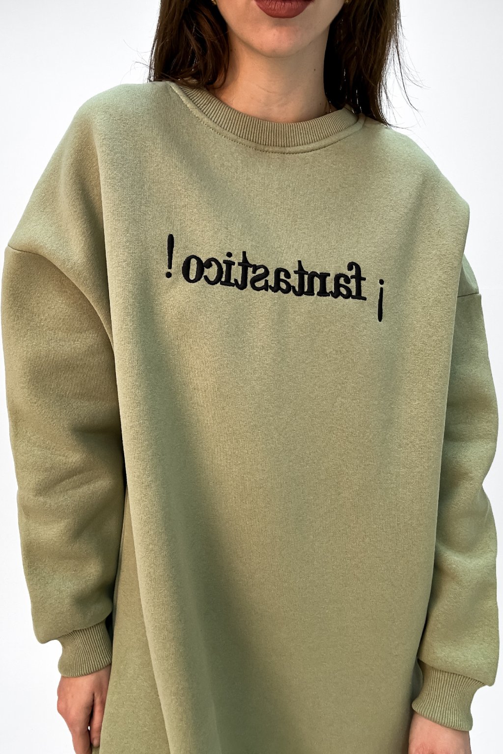Zateplená oversize dlhá mikina s vyšívaným nápisom " Bonjour Madame ". Možne nosiť aj ako šaty.