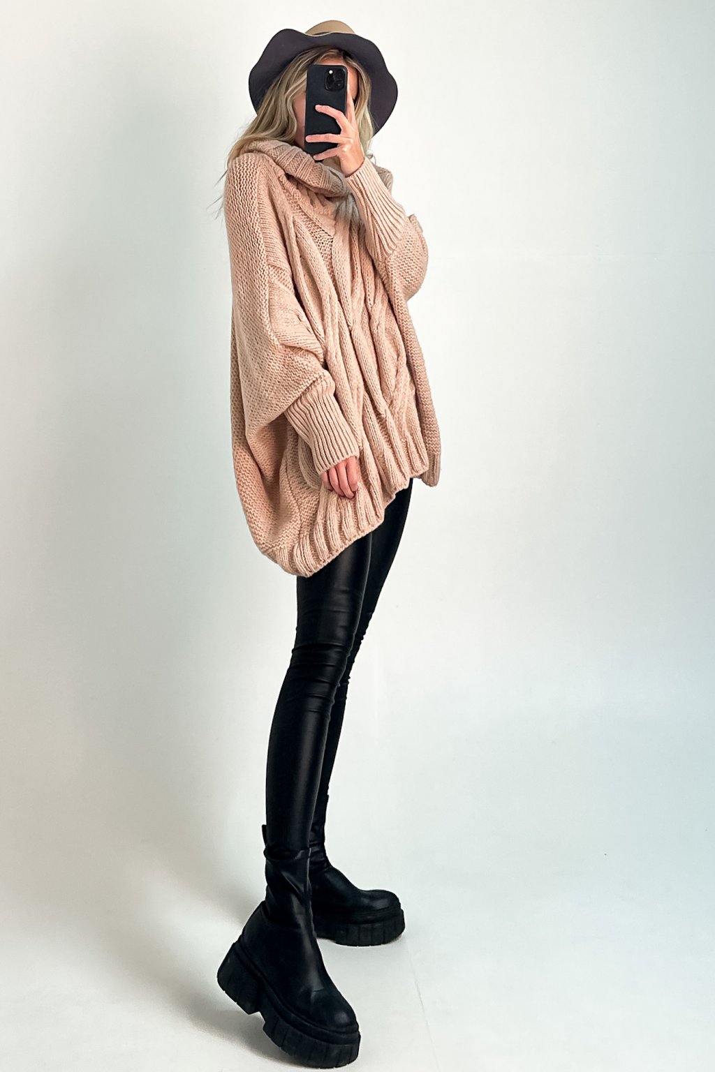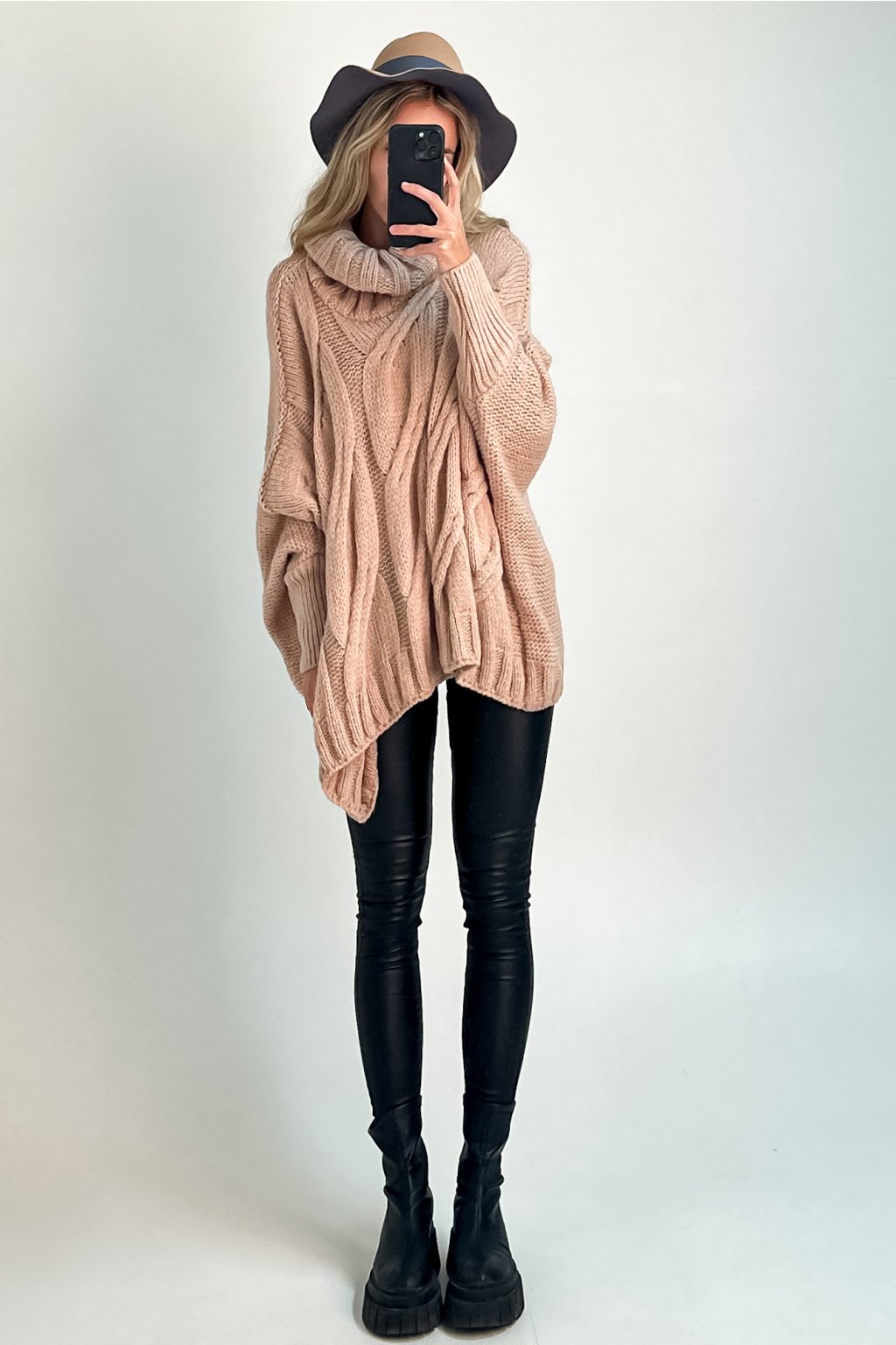 Predĺžený sveter s rolákom v oversize strihu s netopierími rukávmi z hrejivého príjemného materiálu.
