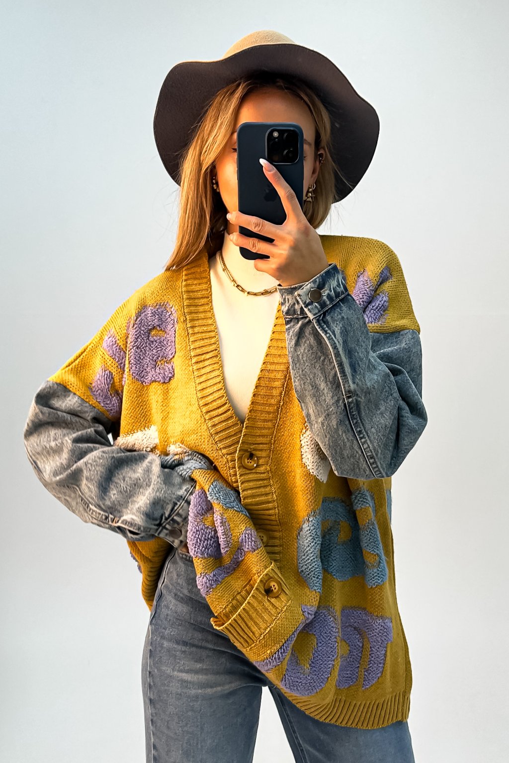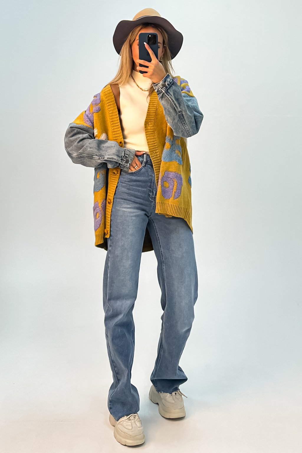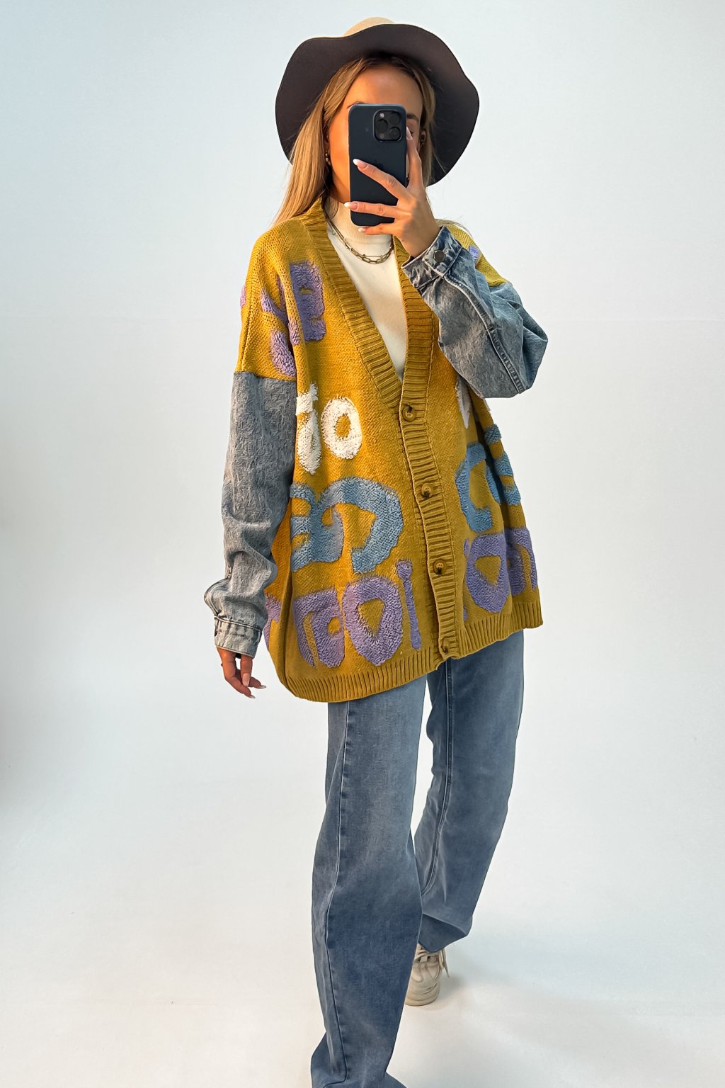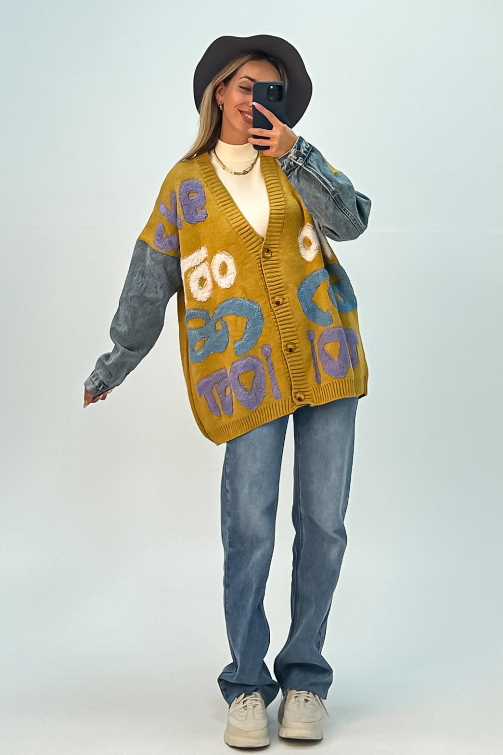 Sveter so zapínaním na gombíky a džísovými rukávmi vo voľnom strihu.