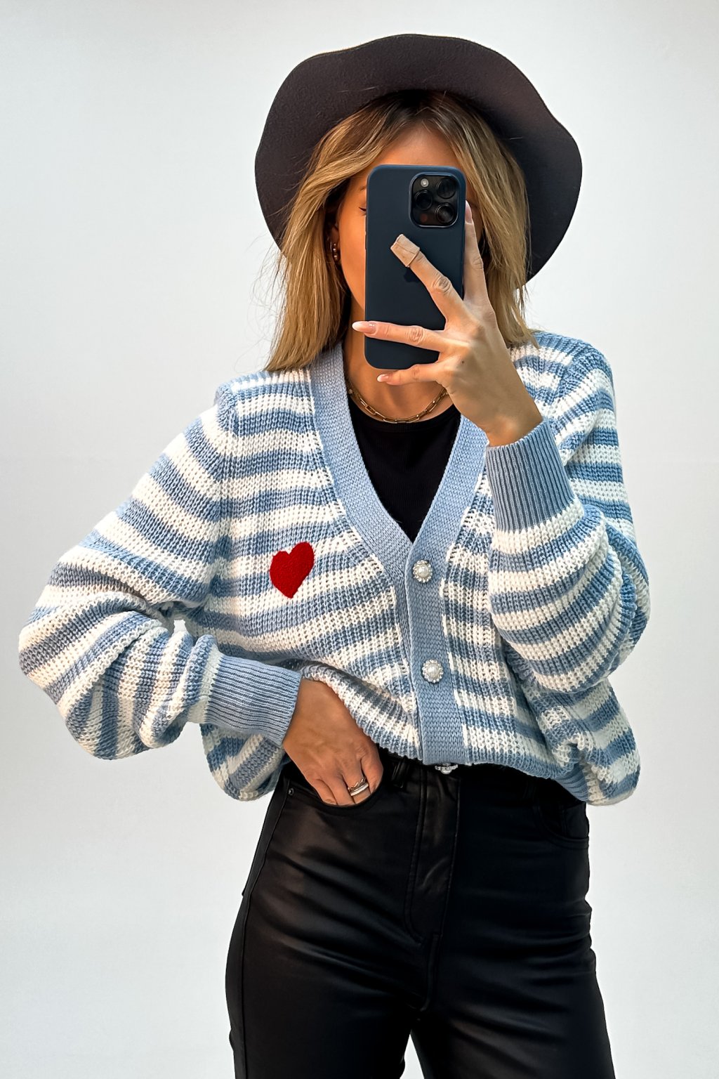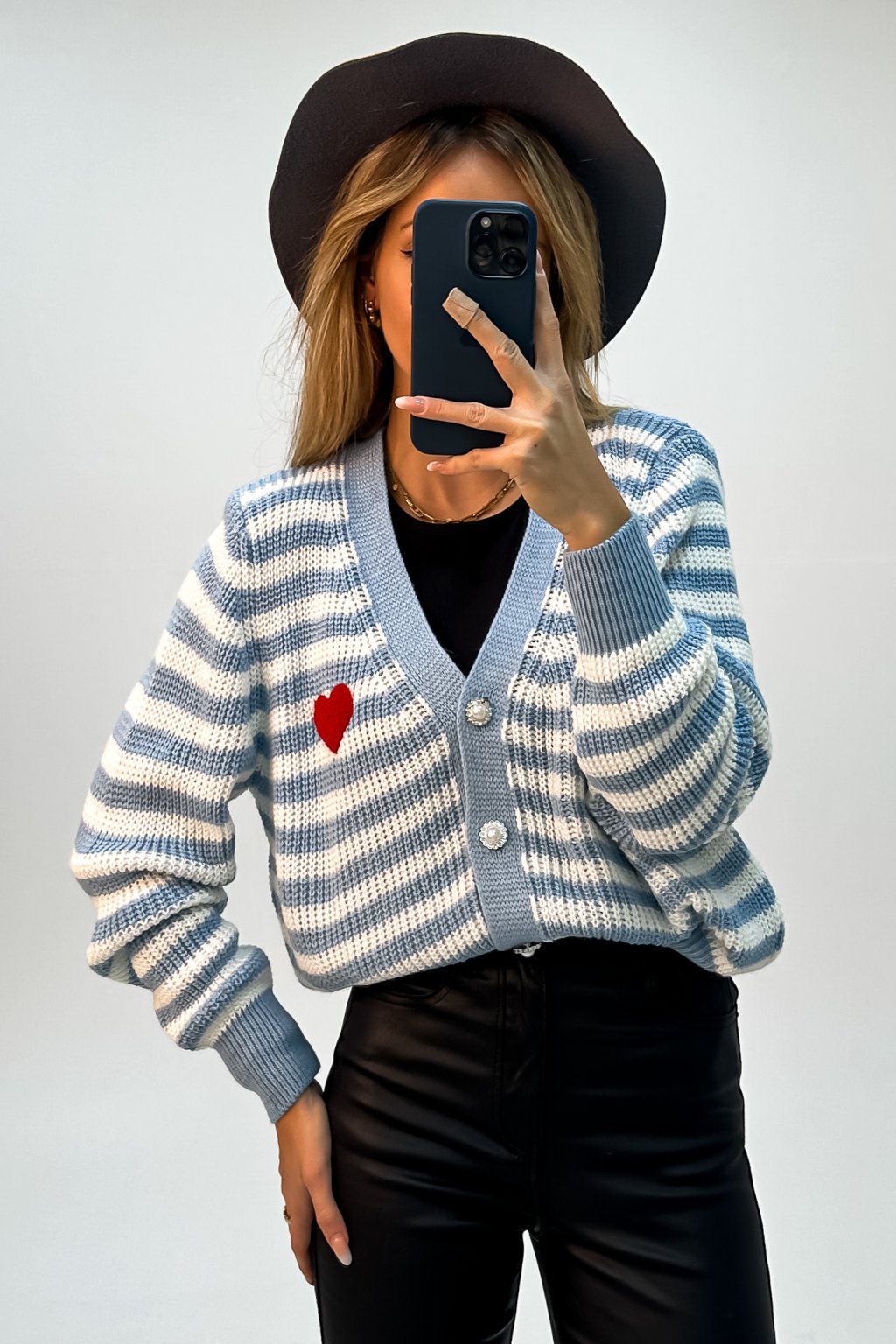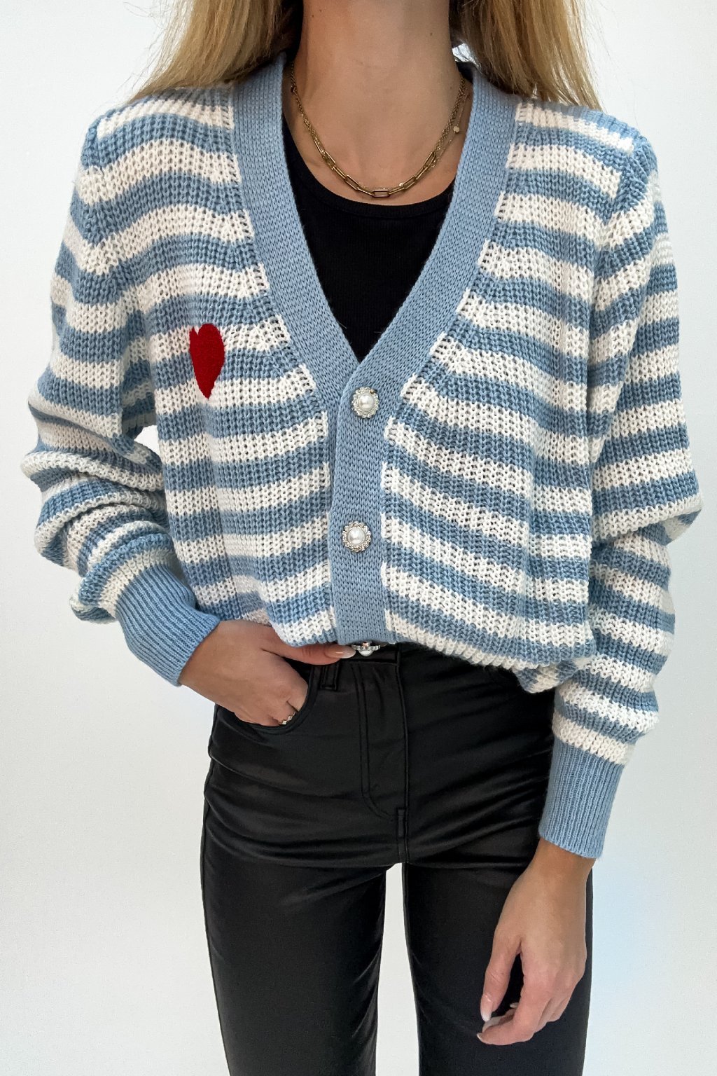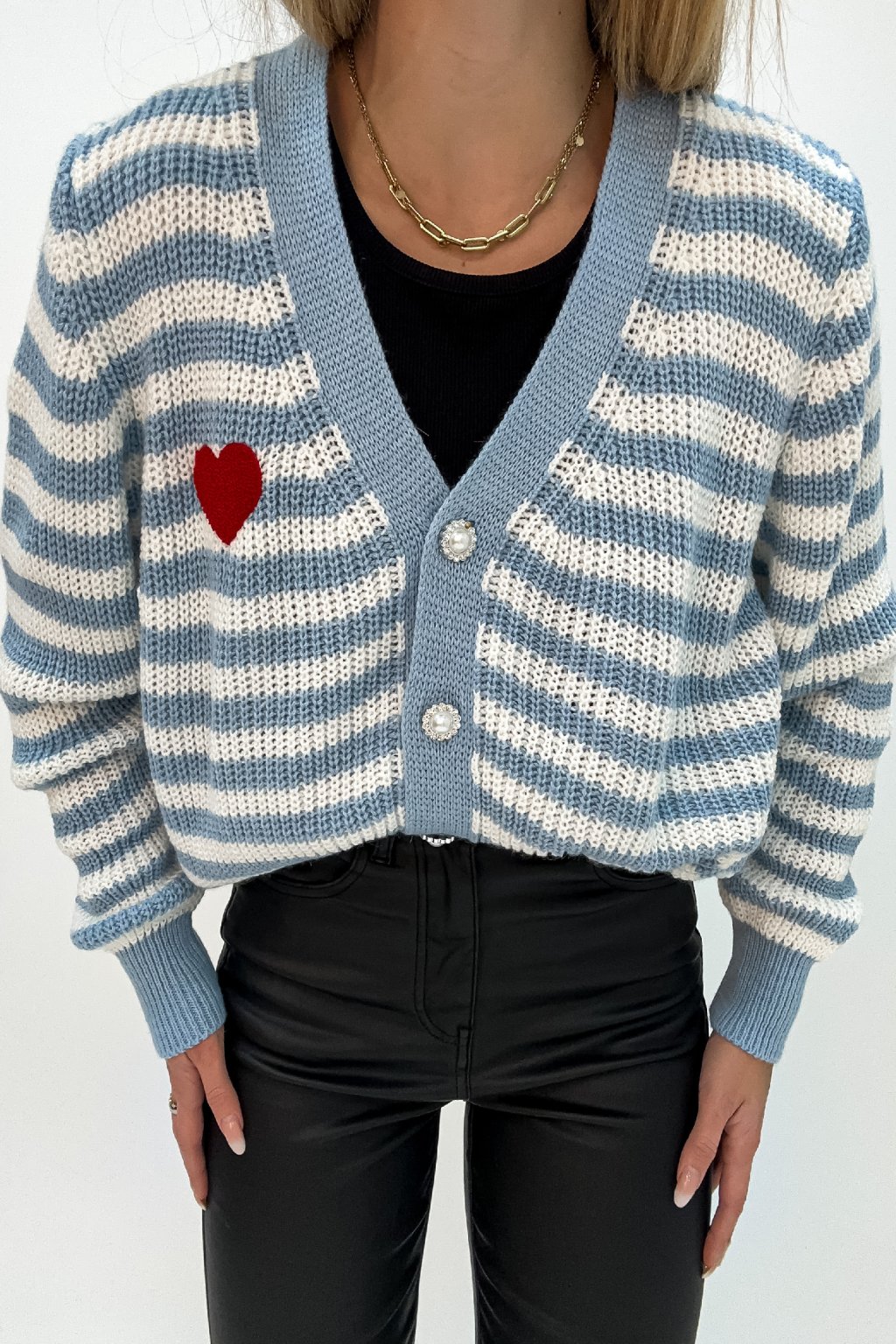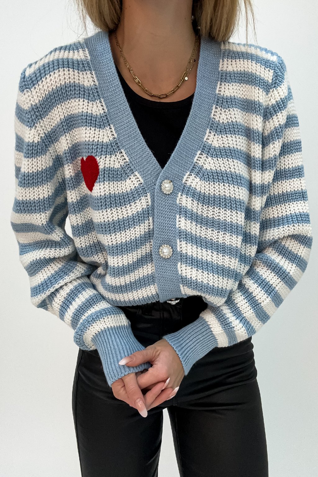 Pásikavý kardigán na zapínanie so srdiečkom modrý