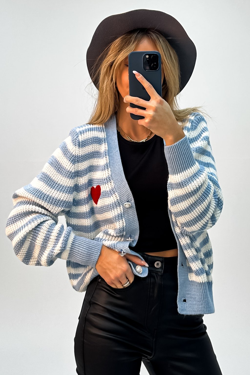 Krátky sveter na zapínanie zapadne do outfitu na chladnejšie večery.