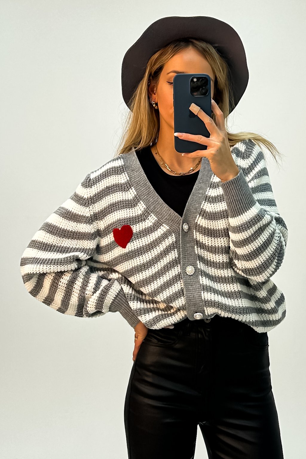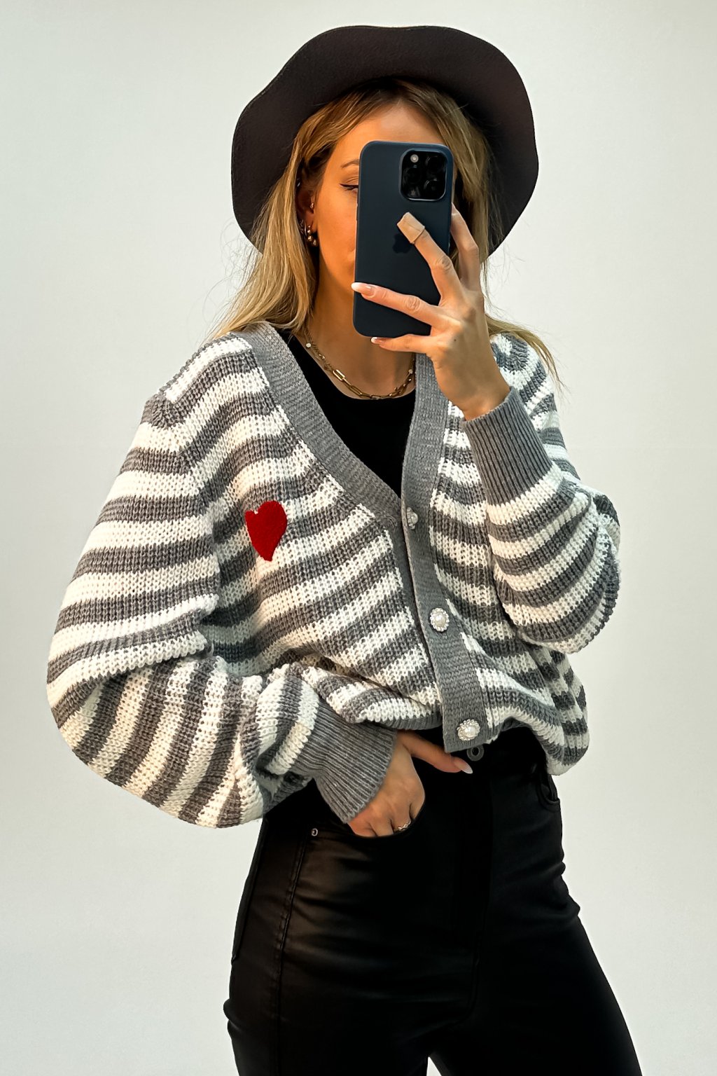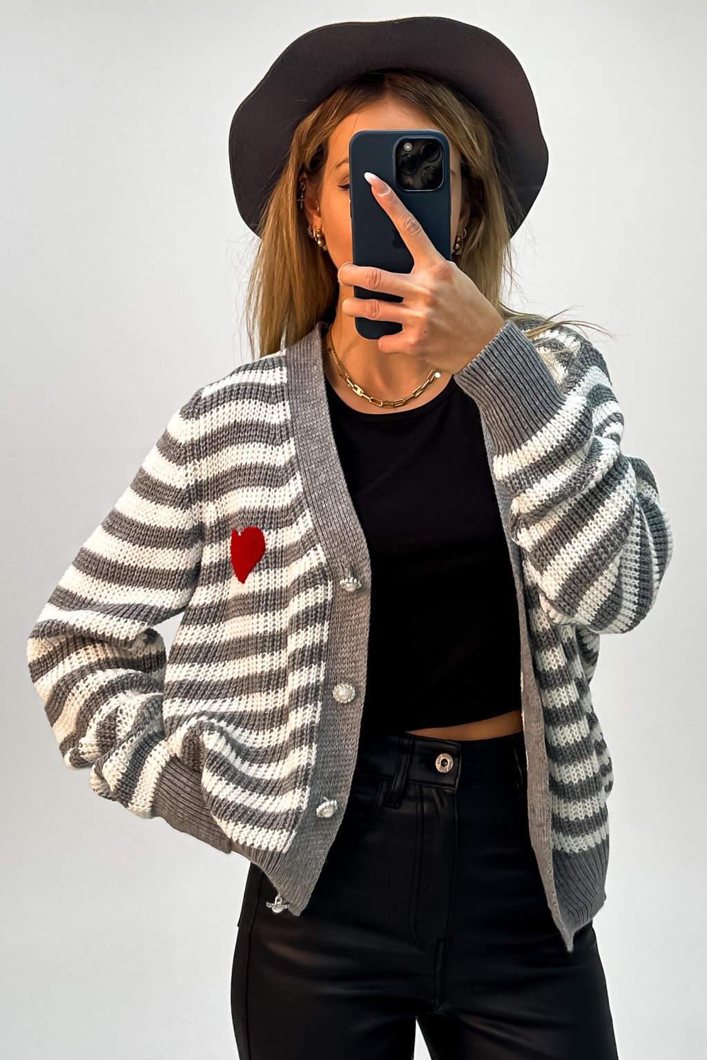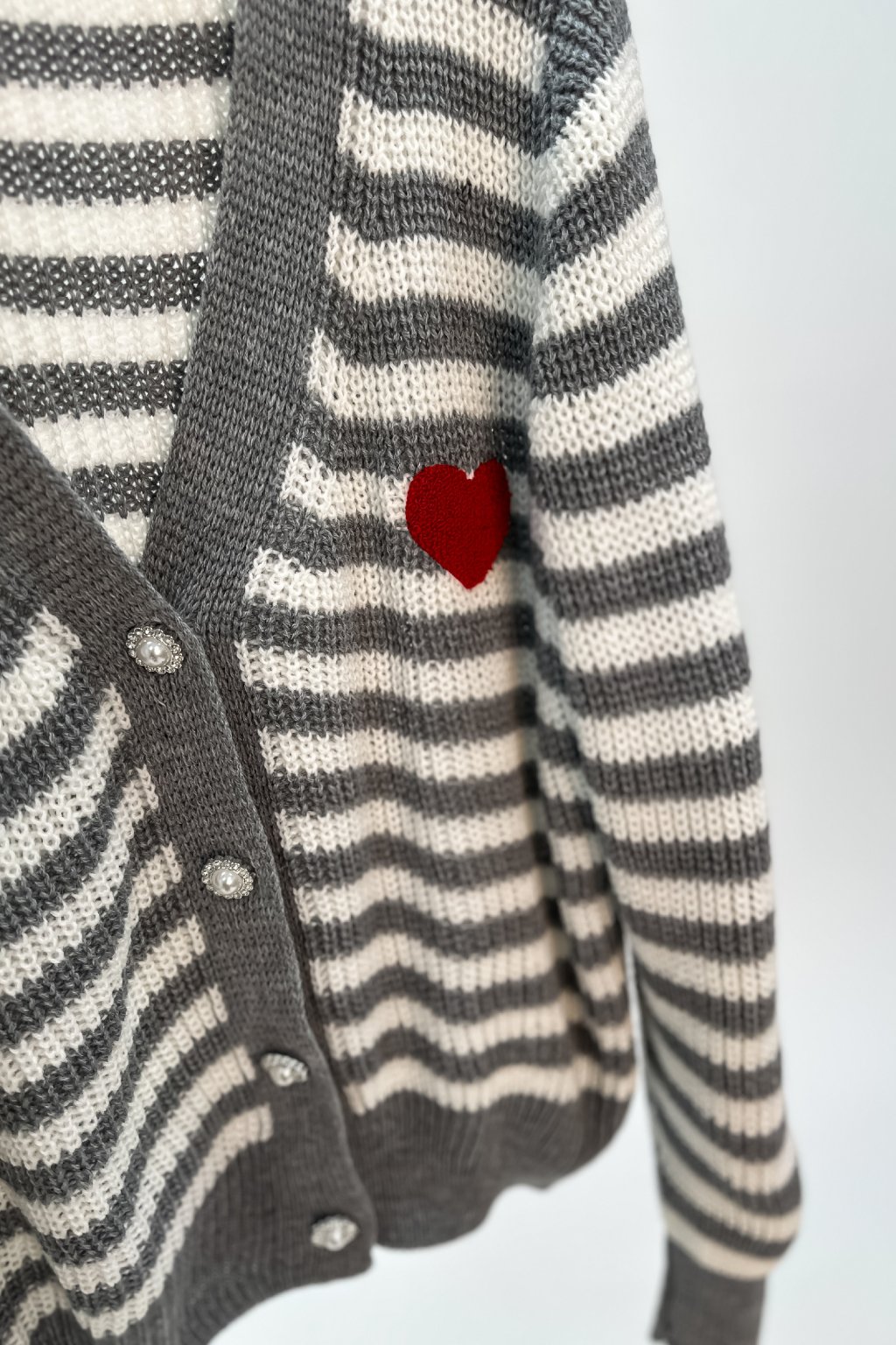 Pásikavý kardigán na zapínanie so srdiečkom sivý