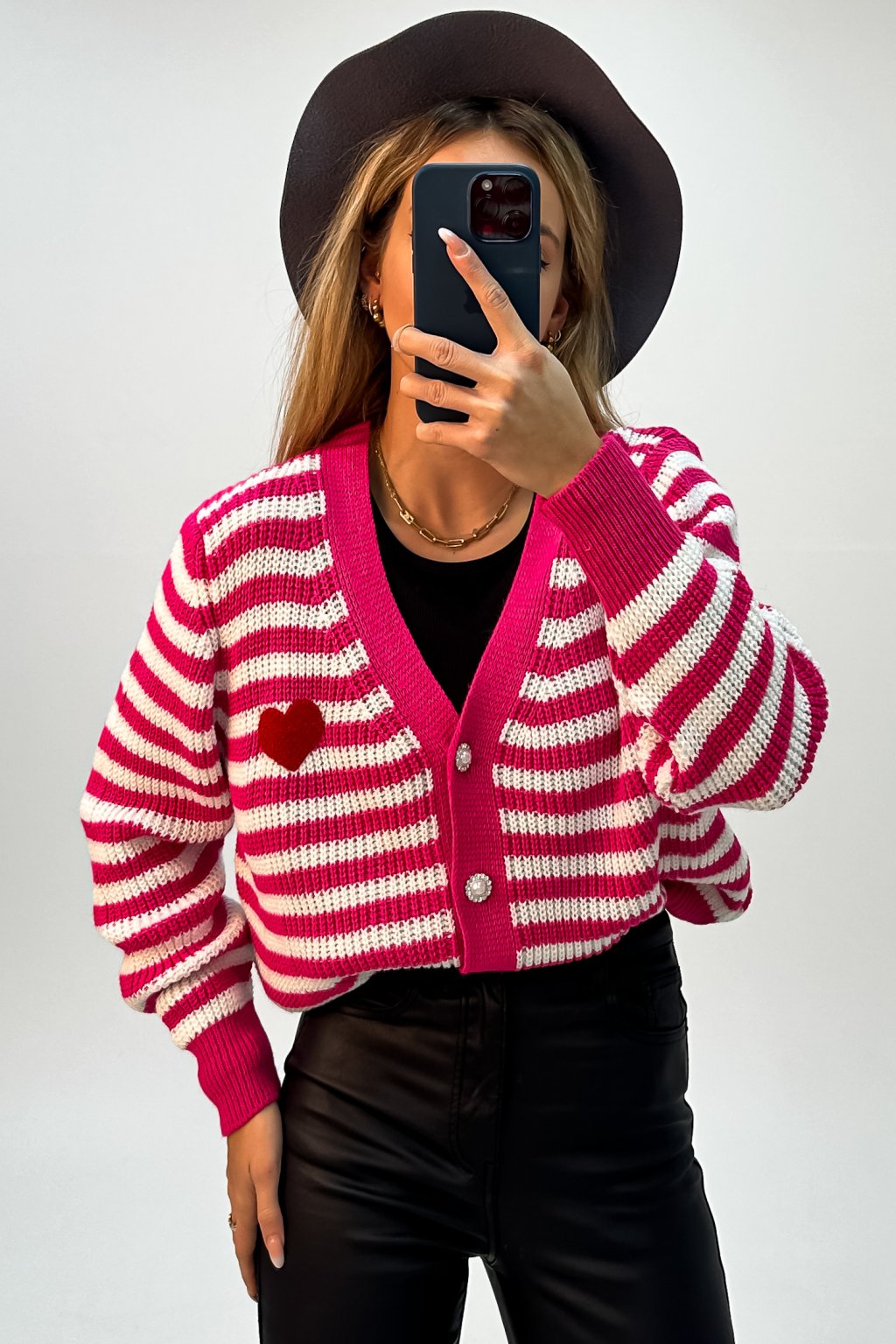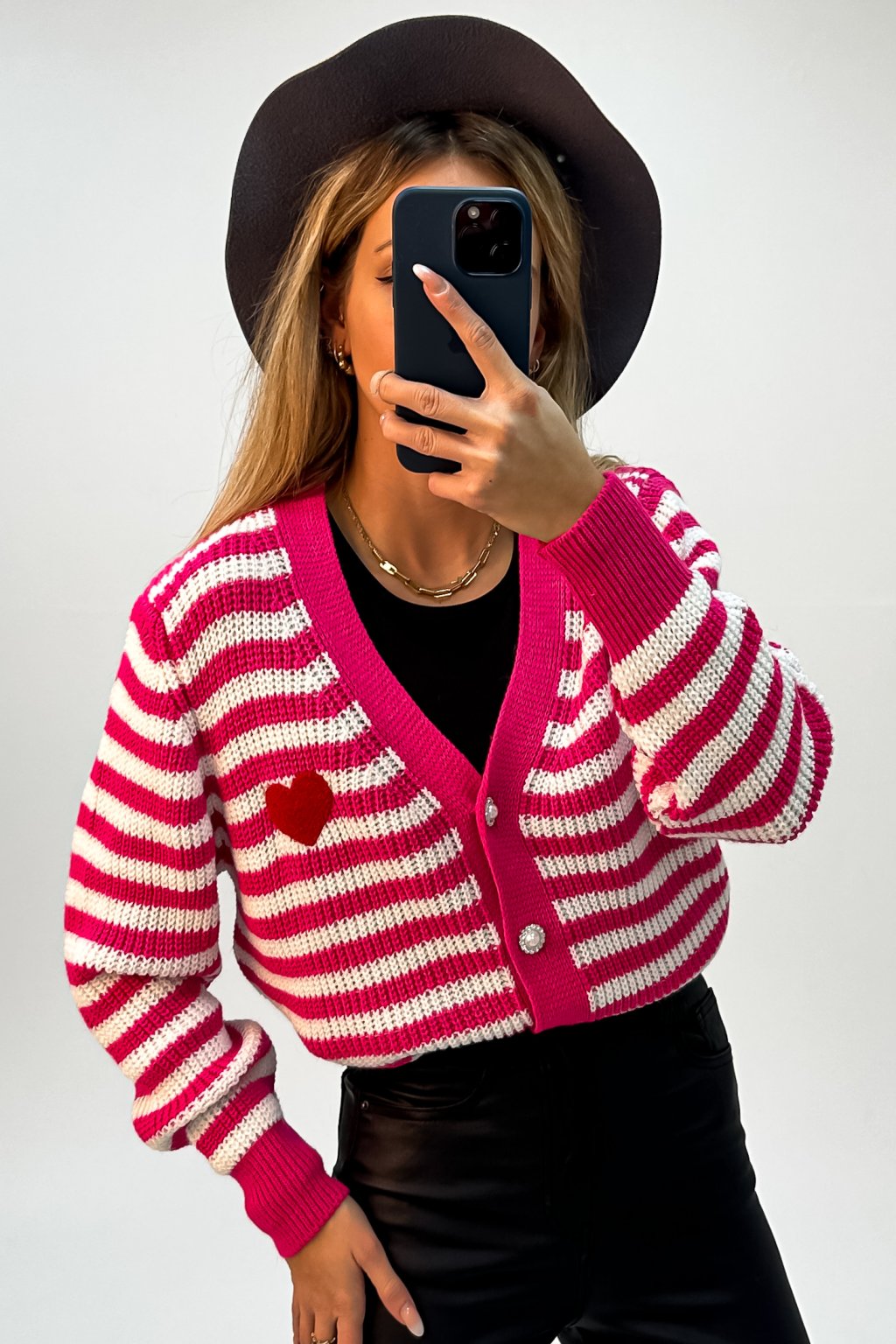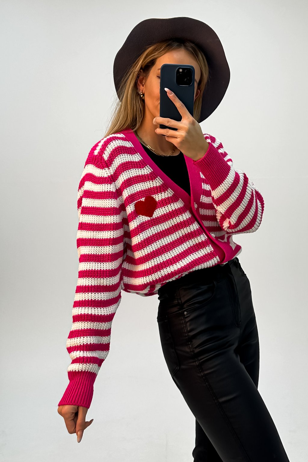 Pásikavý kardigán na zapínanie so srdiečkom cyklamenový