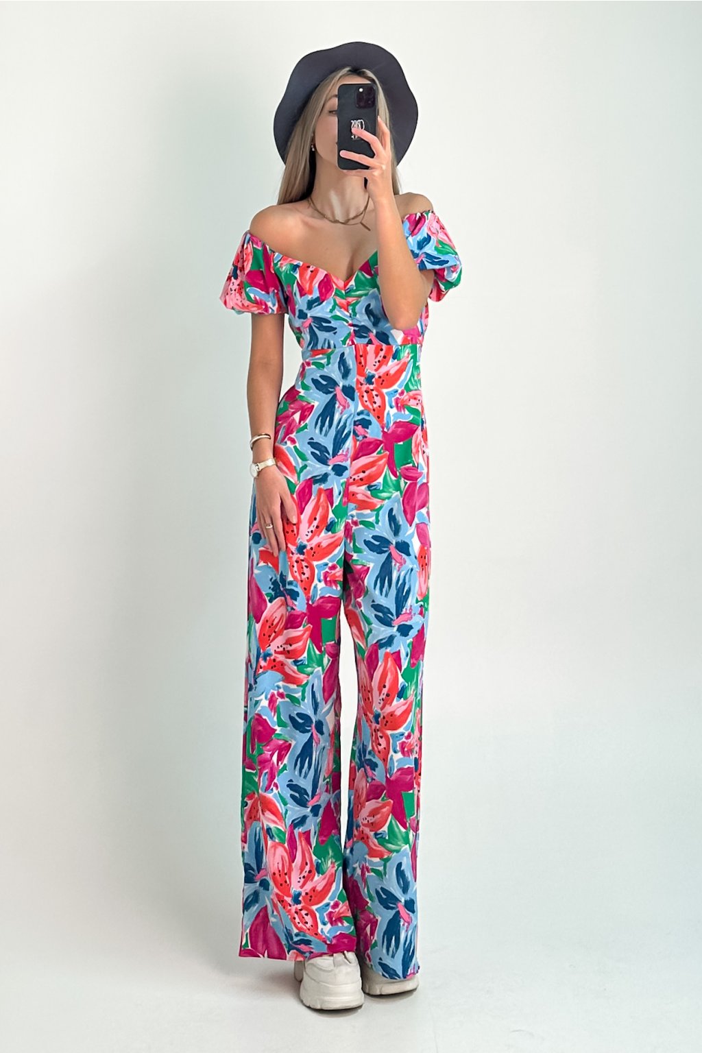 Ľahký dlhý letný overál s riasením v dekolte a puff rukávmi na gumičku, čo umožňuje nosiť rukávy aj spustené cez ramená. So stuhou v páse, ktorá zvírazní pás a vytvaruje postavu.