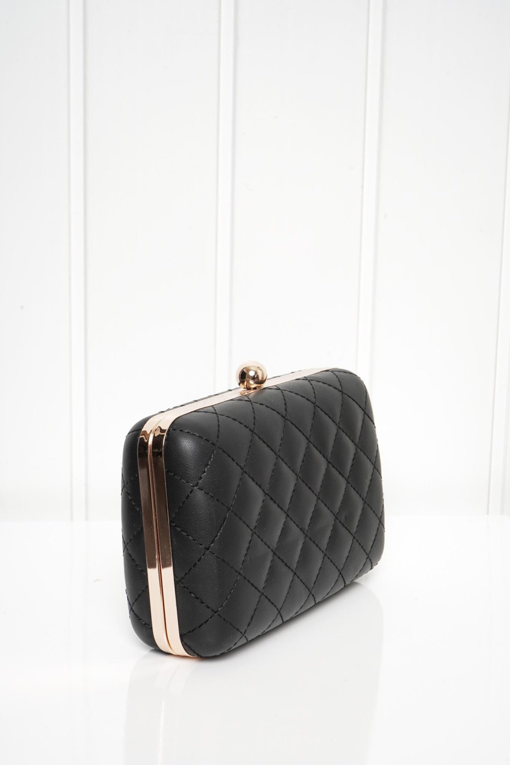 Kufríková plesová kabelka z čiernej prešívanej imitácie kože so zlatým lemom, zapínaním a odopínateľnou retiazkou.