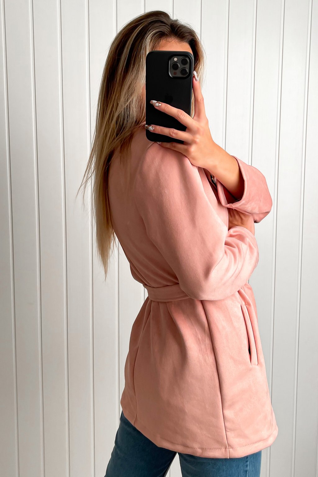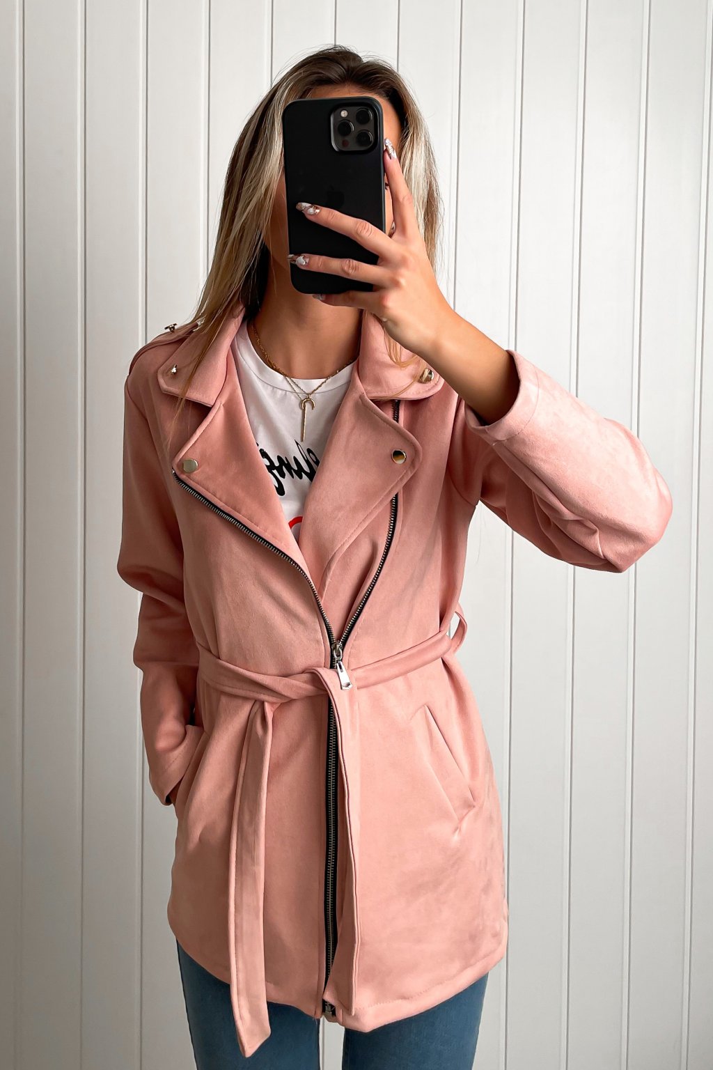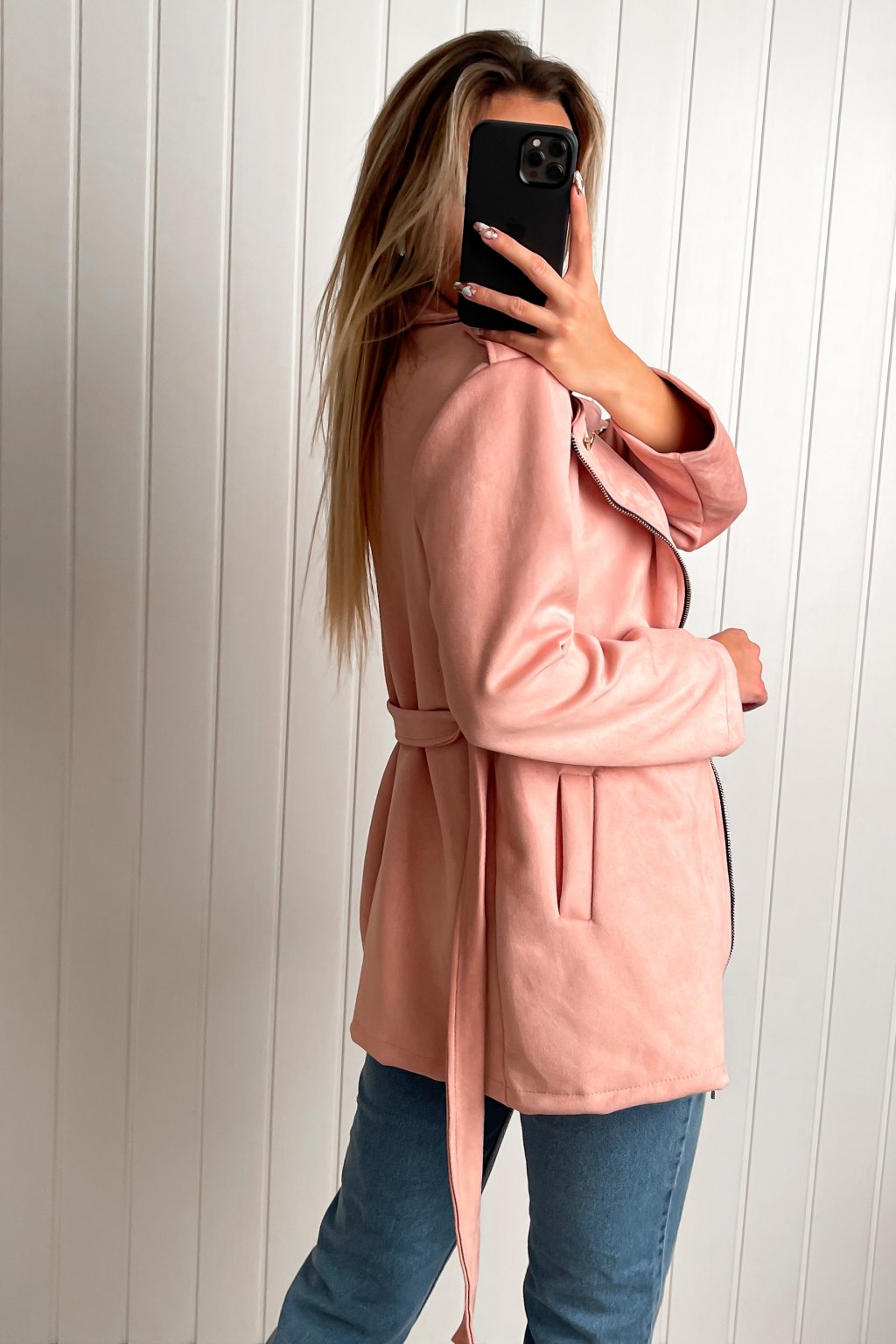 Prechodný kabátik so zapínaním na zips a opaskom.