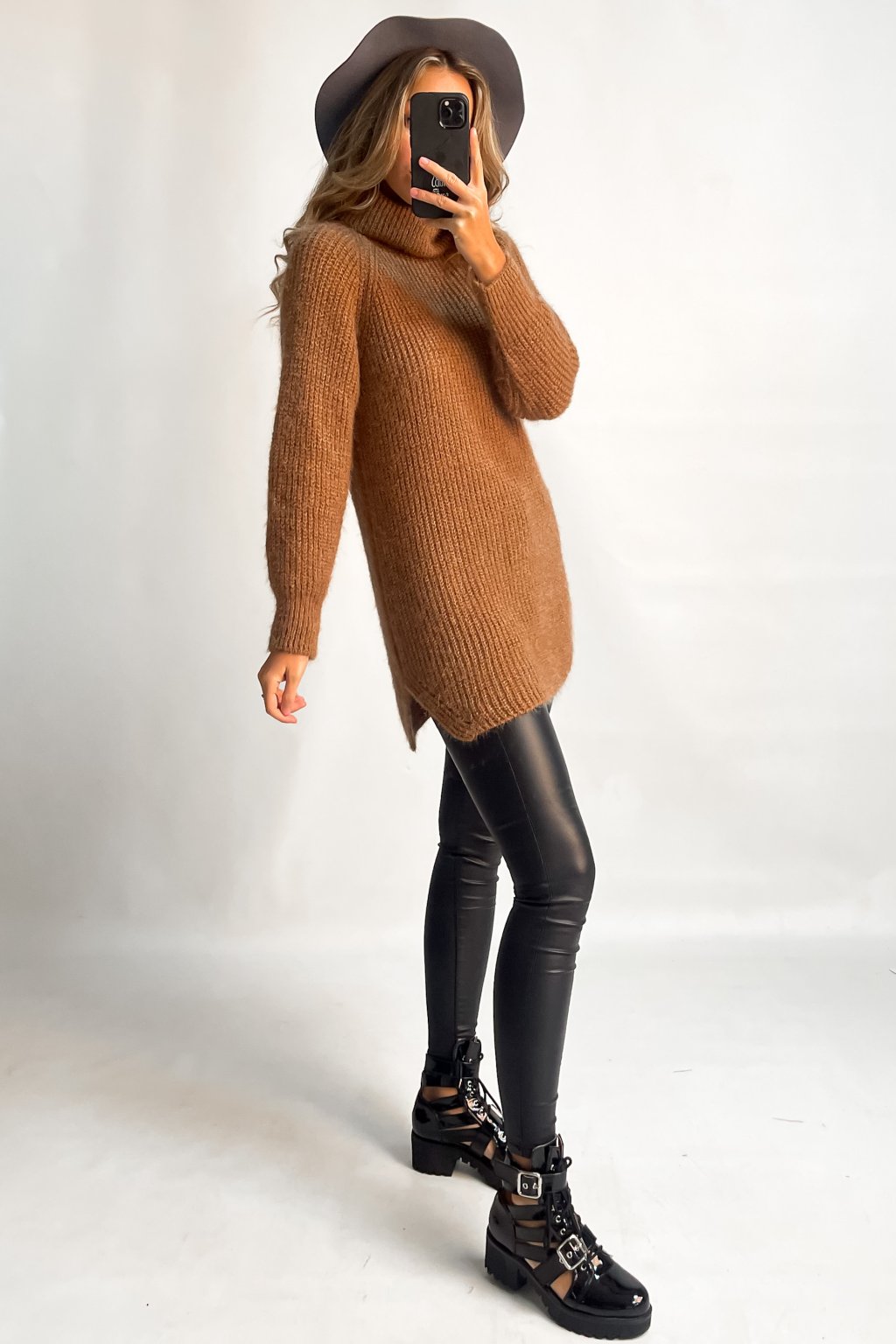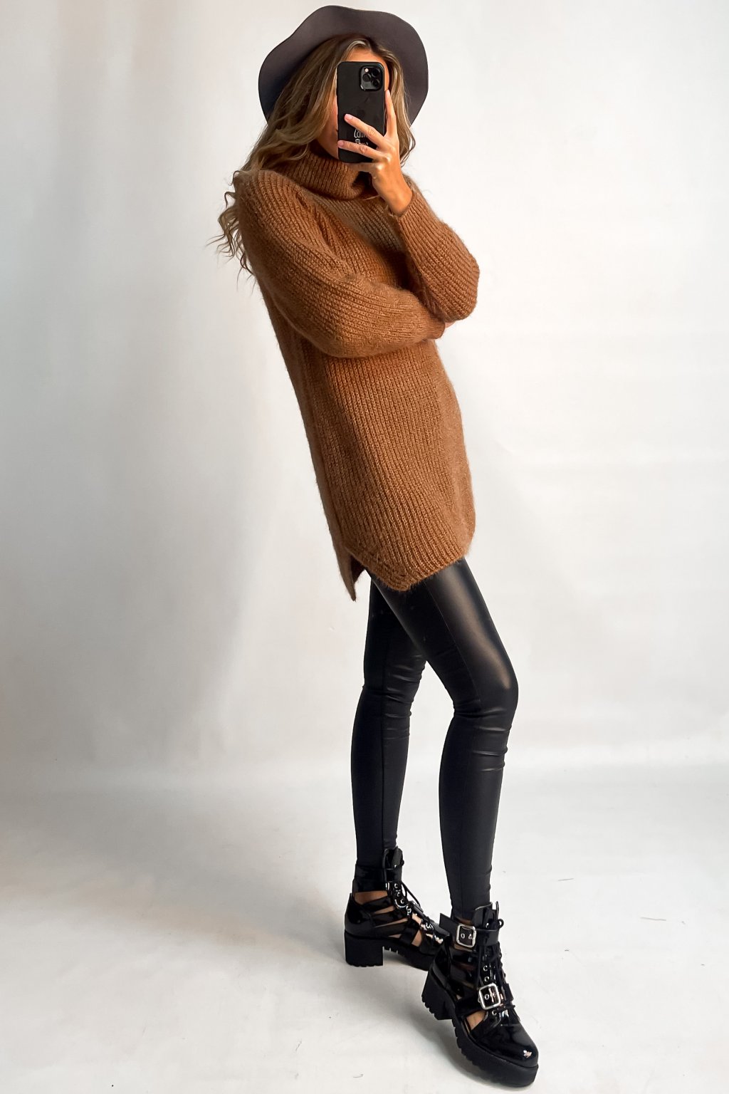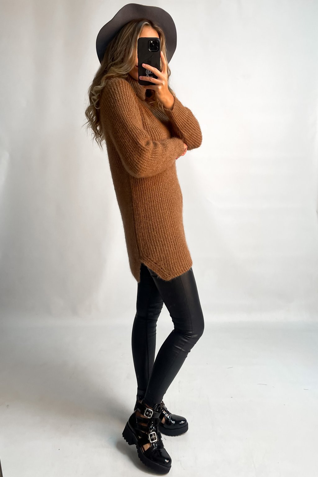 Predĺžený rolákový sveter s rozparkami na bočných stranách.