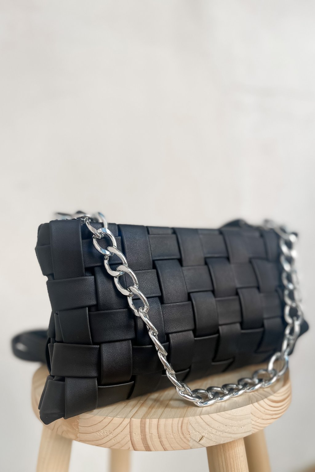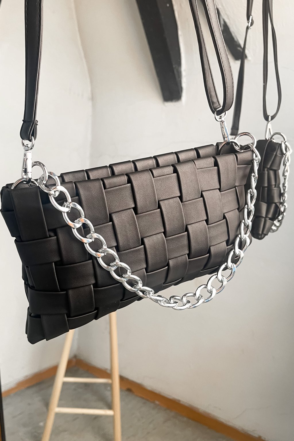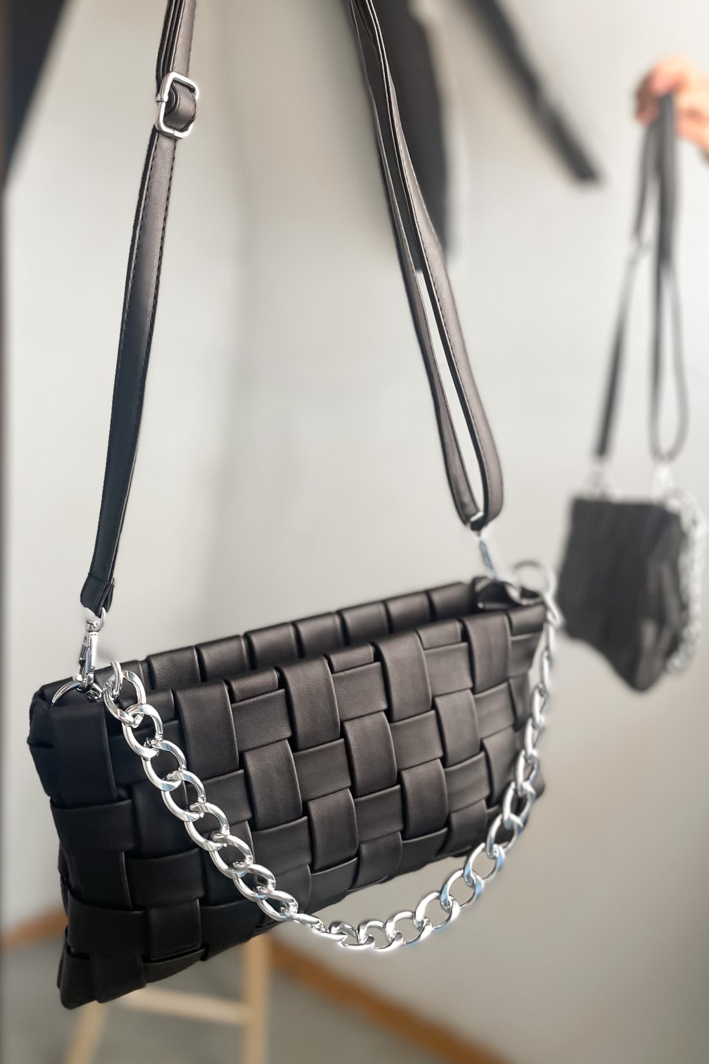 Čierna crossbody kabelka vyrobená z imitácie kože s remienkom cez rameno a retiazkou do ruky.