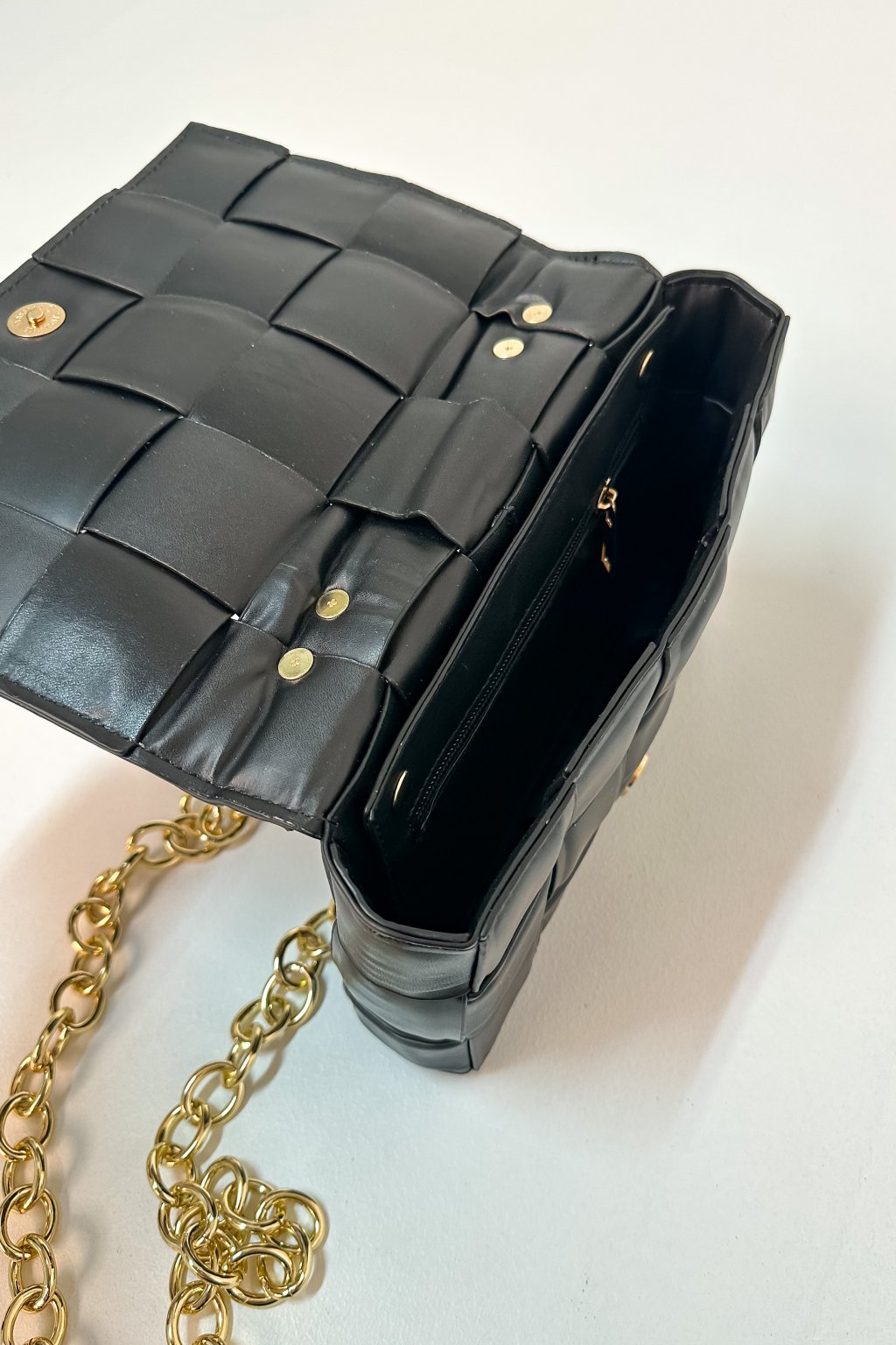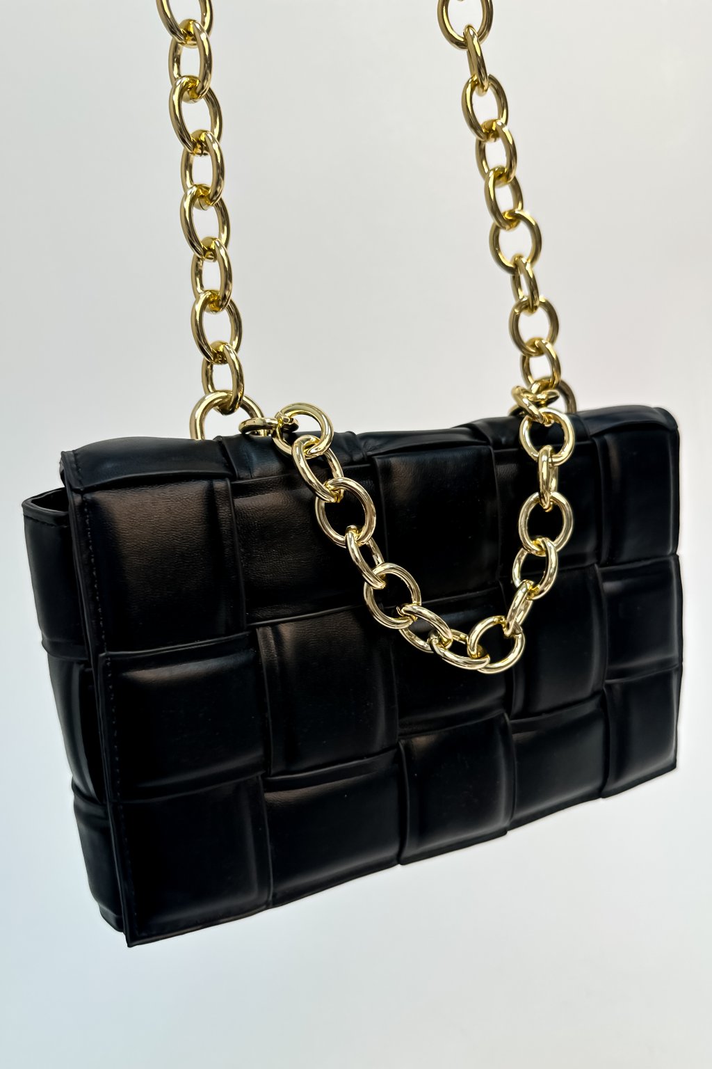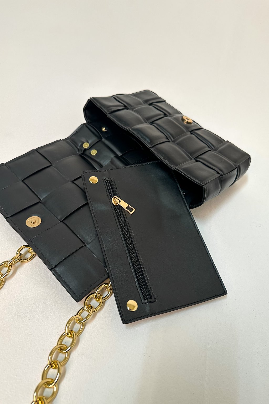 Čierna crossbody kabelka vyrobená z imitácie kože s remienkom z reťaze cez rameno a do ruky. Vnútro obsahuje odopánateľný ukladací priestor