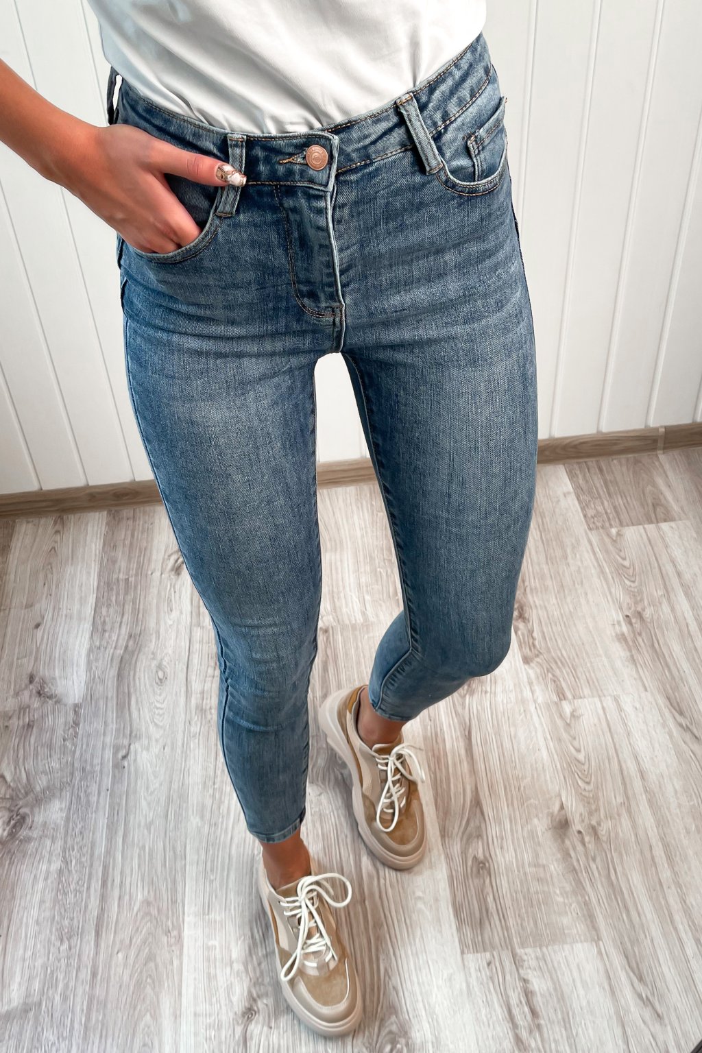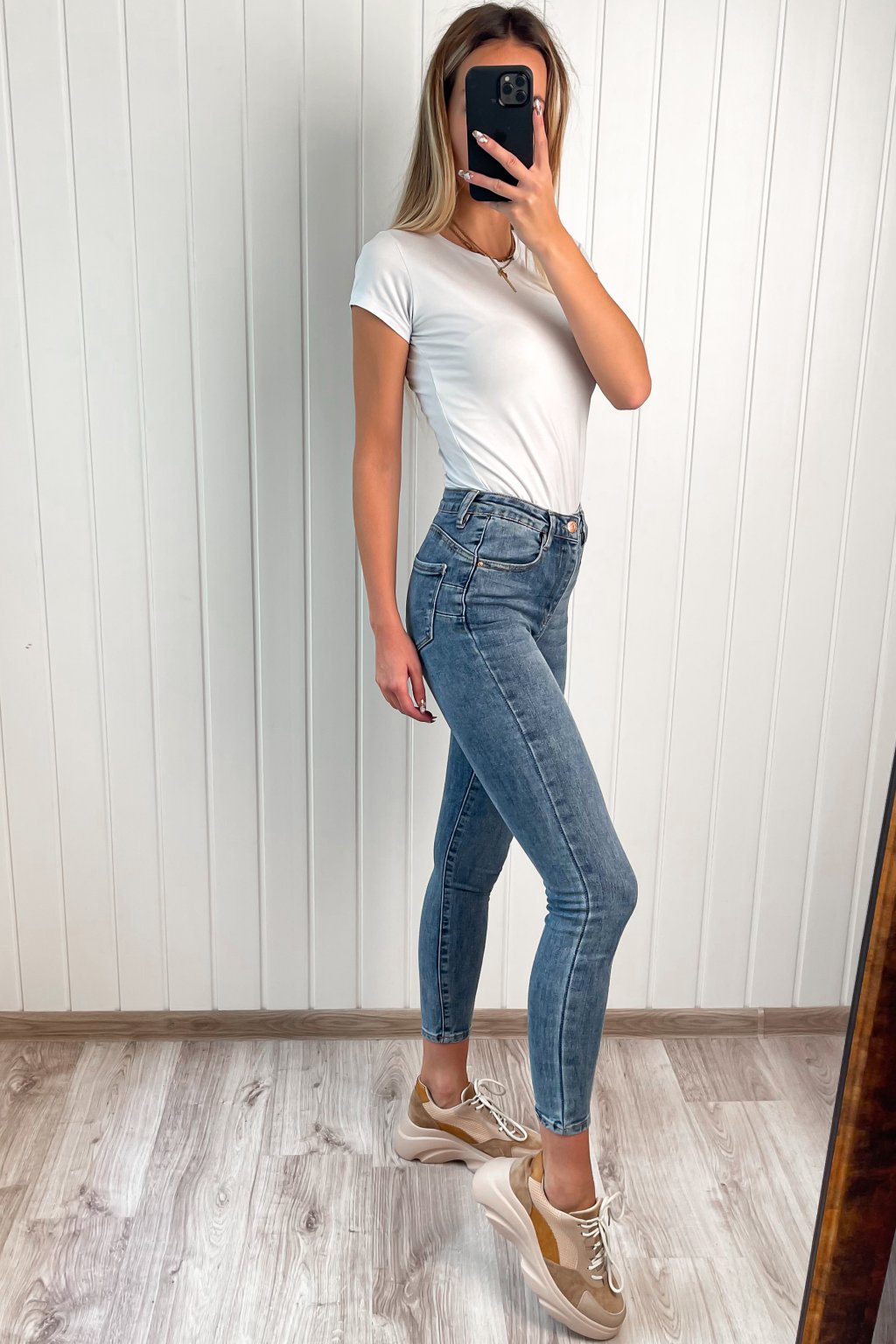 Svetlo modré rifle s tvarovaním na zadnej strane pre push up efekt.