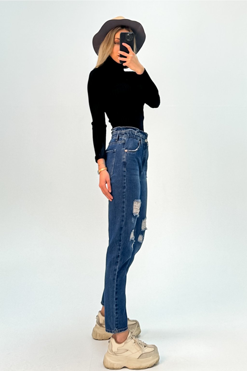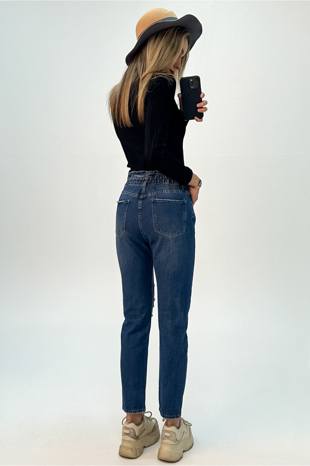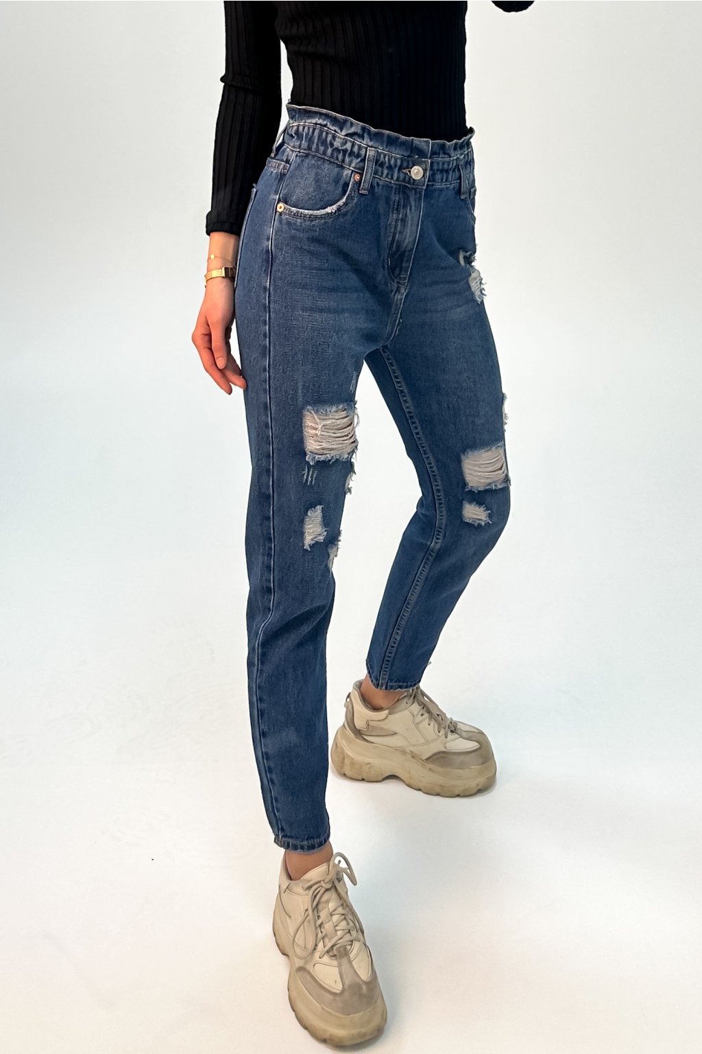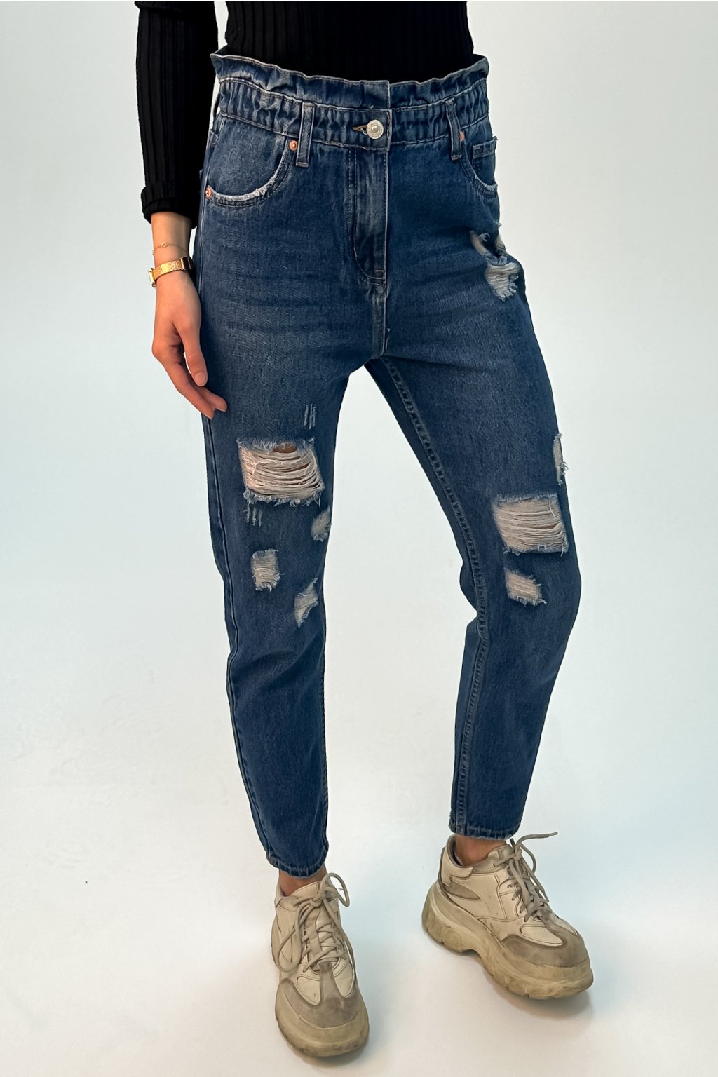 Tmavo-modré potrhané rifle s vysokým pásom vo voľnom mom strihu s pohodlnou gumou v páse a zapínaním na zips a gombík.