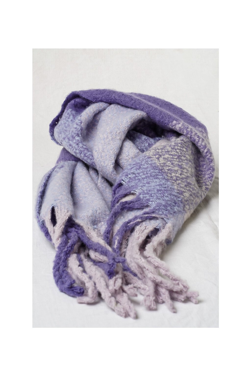Dlhý viacfarebný kombinovaný šál v modrých tónoch z mäkkého príjemného materiálu na dotyk.