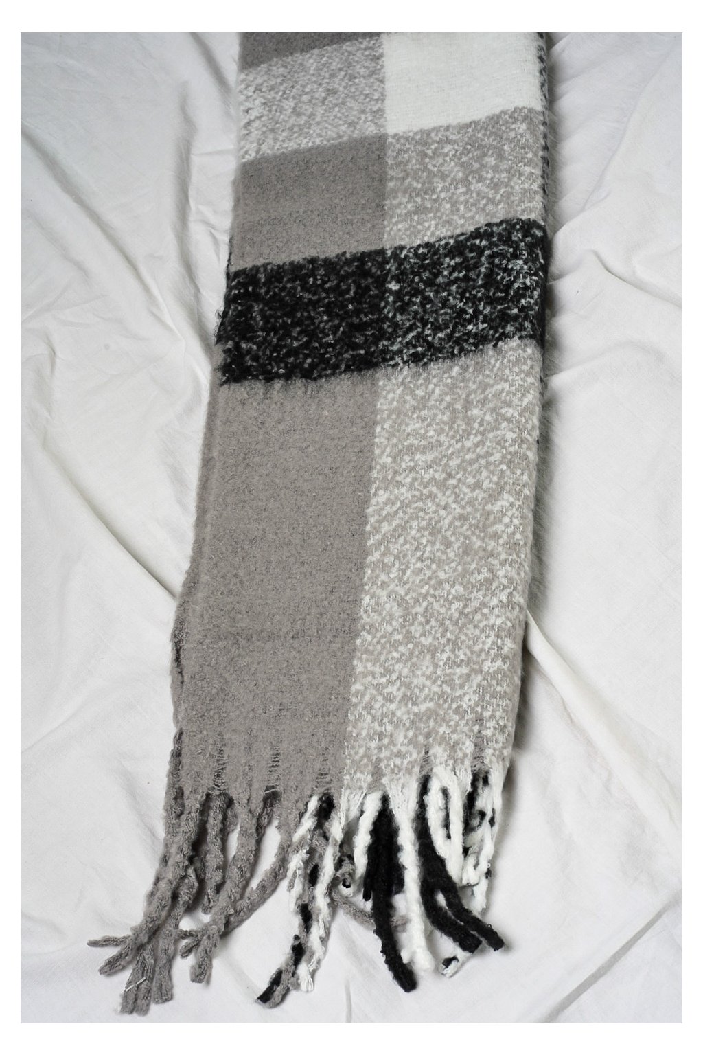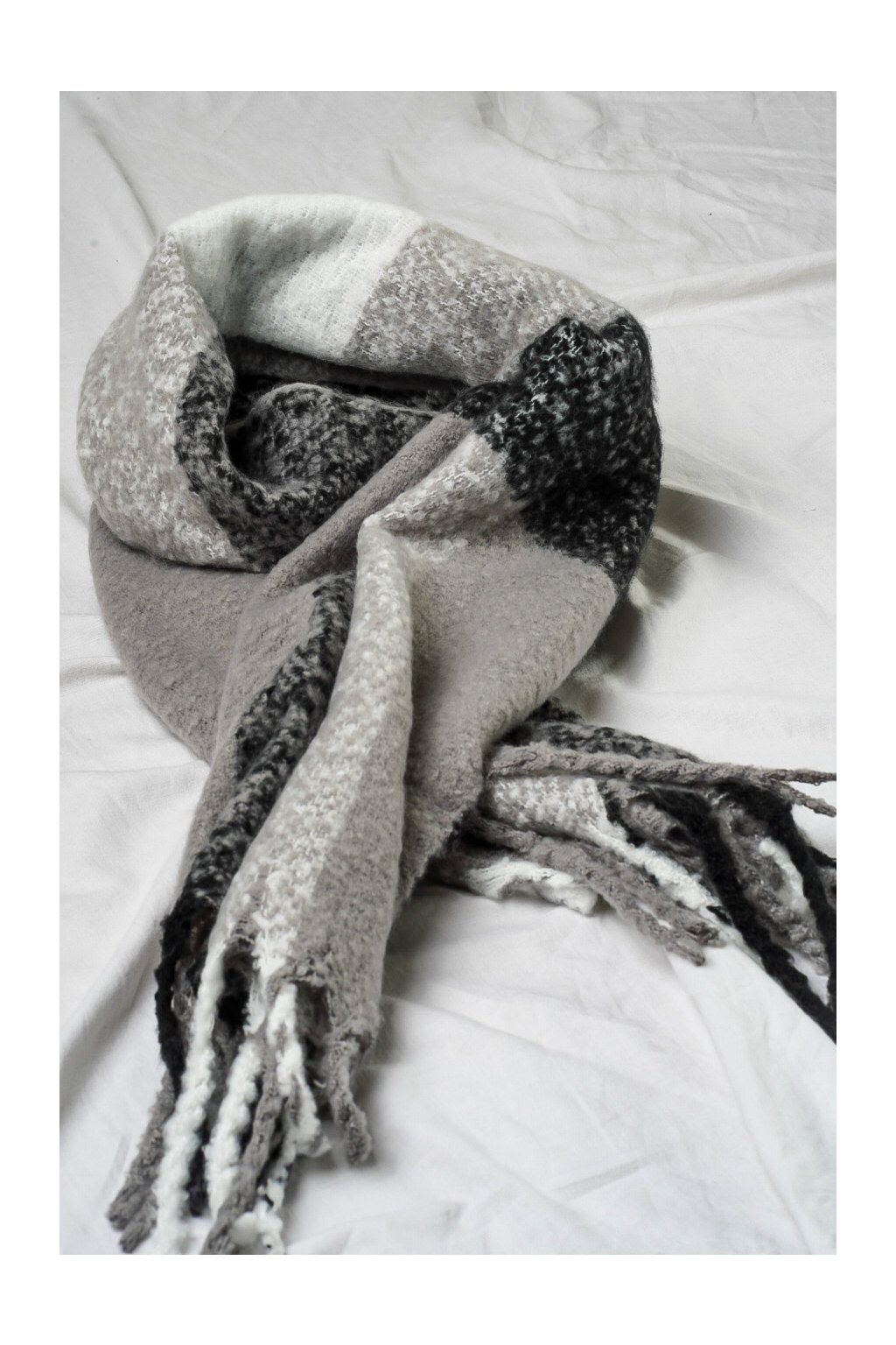 Dlhý viacfarebný kombinovaný šál v sivých tónoch z mäkkého príjemného materiálu na dotyk.