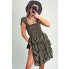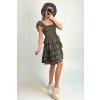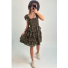 Šaty v A-strihu v etno štýle z príjemného ľahkého materiálu s prímesou hodvábu. Šaty sú s pohodlnou riasenou gumou cez prsia na volánikové ramienka. Pod prsiami pokračujú masivnou sukňou s volánmi