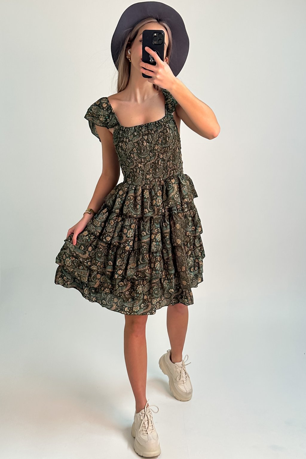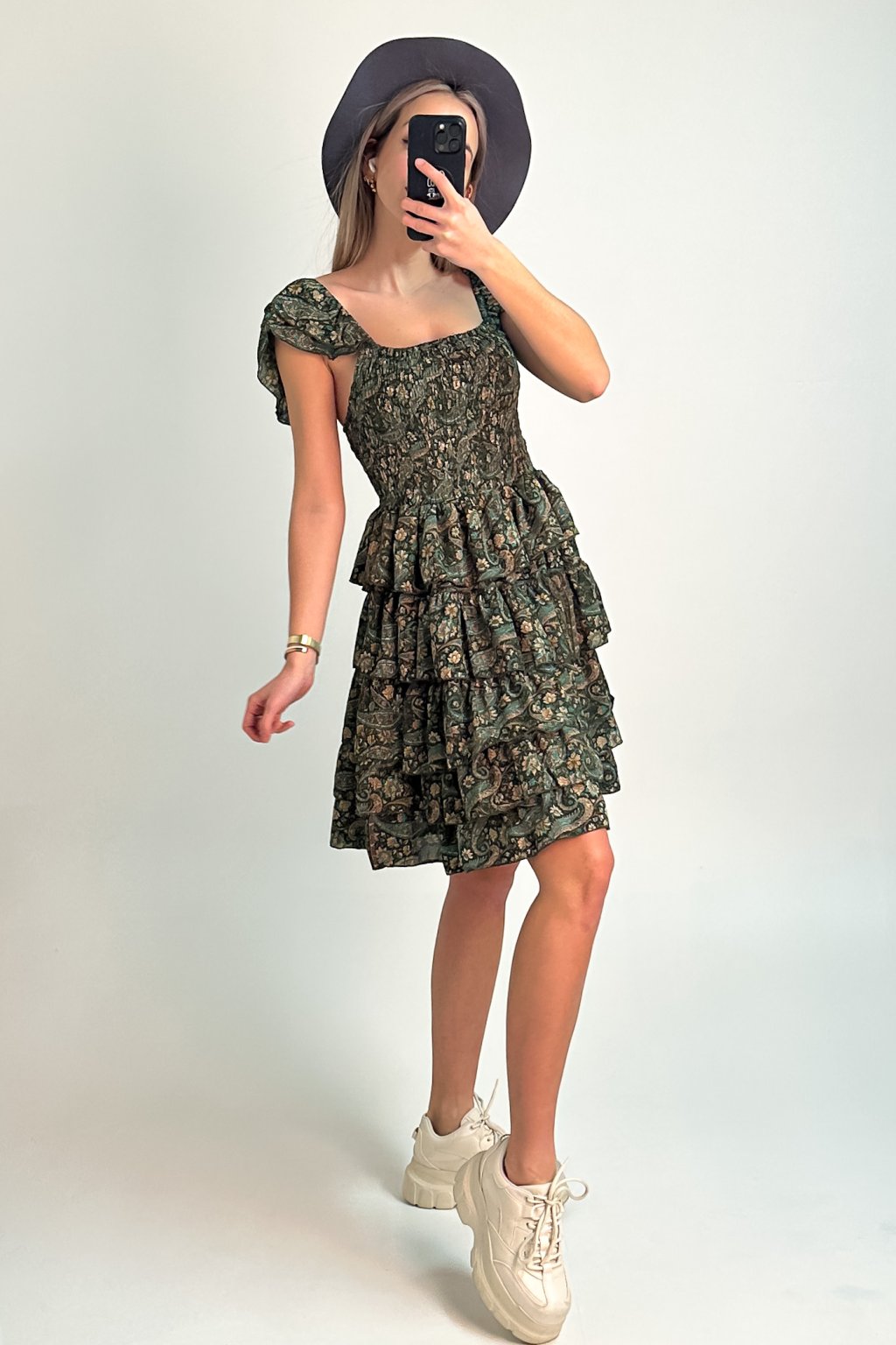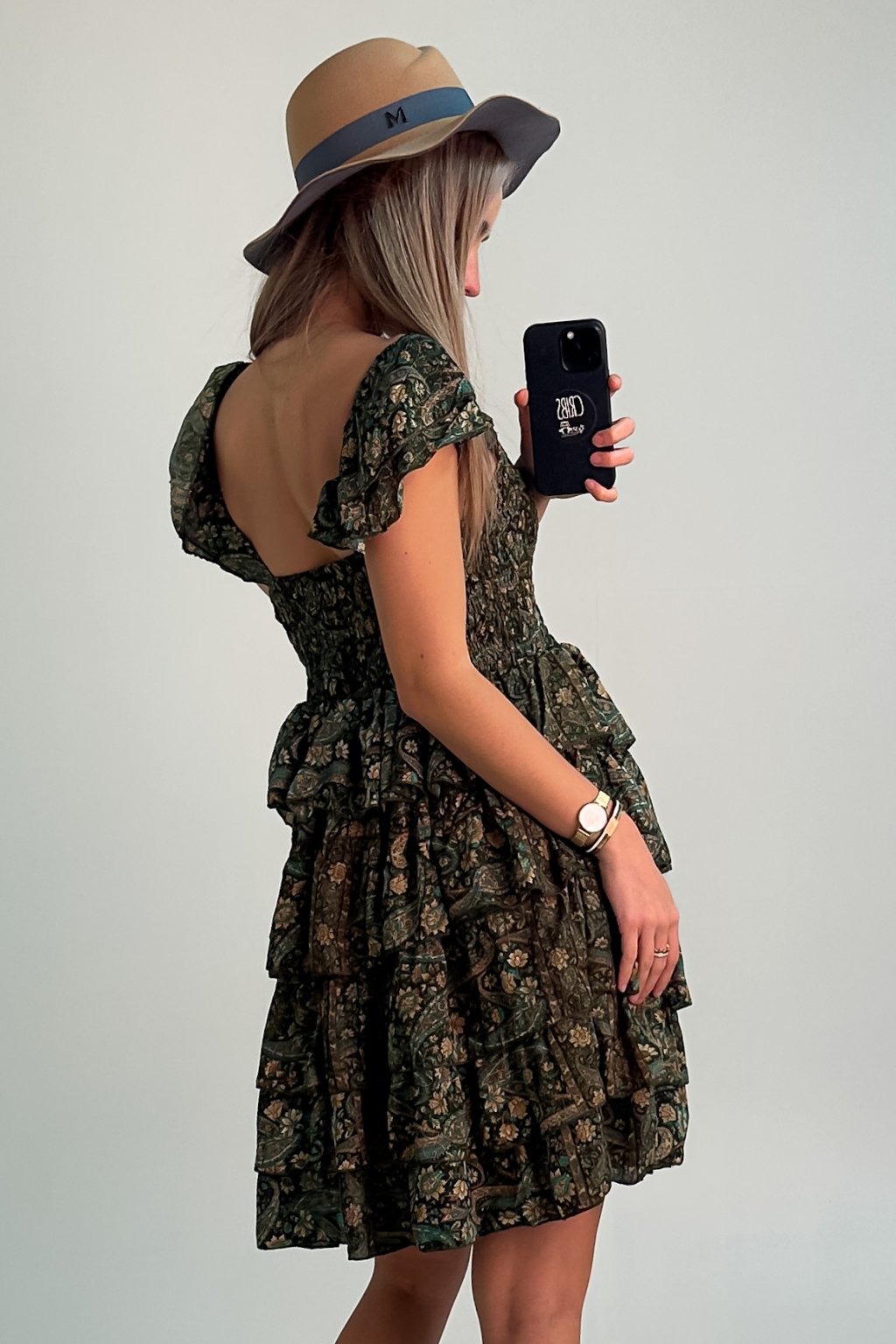 Šaty v A-strihu v etno štýle z príjemného ľahkého materiálu s prímesou hodvábu. Šaty sú s pohodlnou riasenou gumou cez prsia na volánikové ramienka. Pod prsiami pokračujú masivnou sukňou s volánmi
