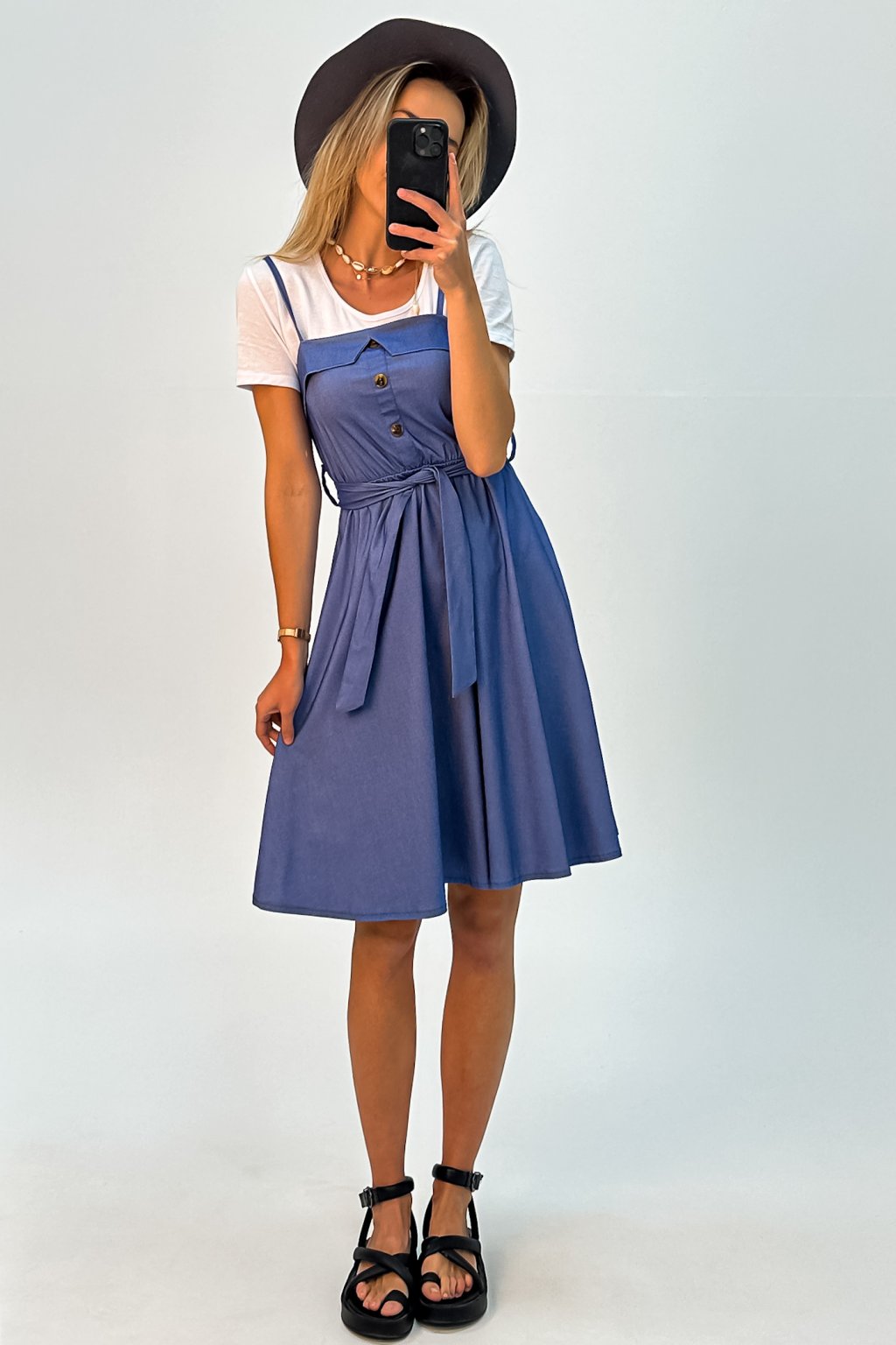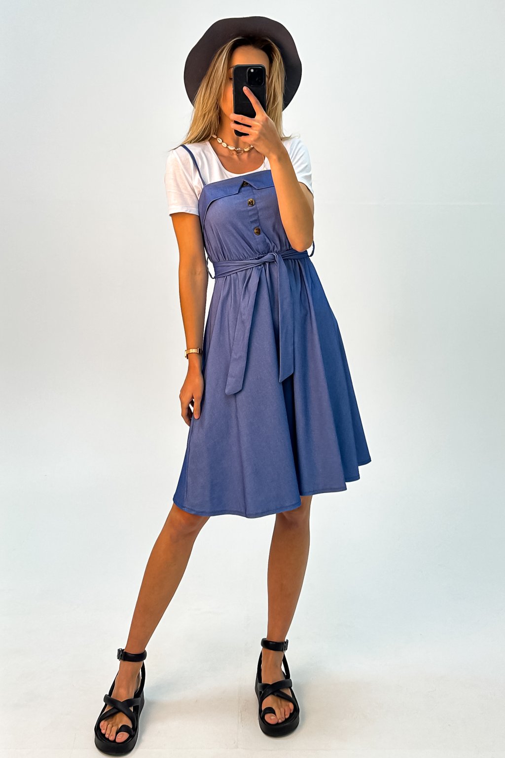 Šaty na ramienka s gumou v páse, prekladaným dekoltom a ozdobnými gombíkmi so sukňou v A-strihu. Materiál je podobný denimu a tričko je darček pre vás k týmto šatám ❤️