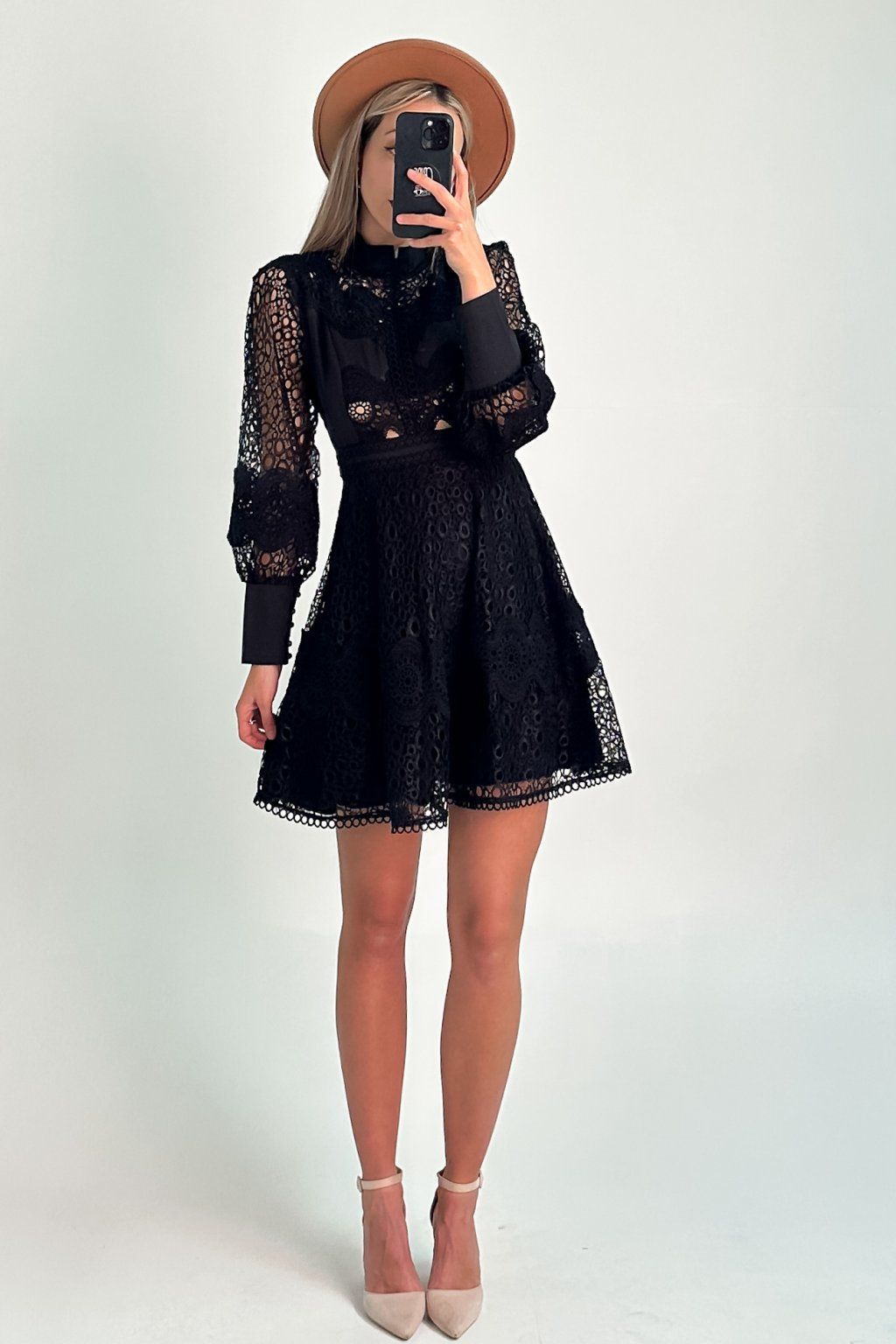 Priliehavé krajkované šaty so spodničkou v A-strihu, s puff rukávmi na gombíky a zipsom na zadnej strane