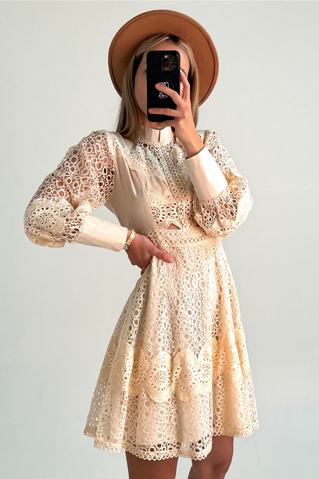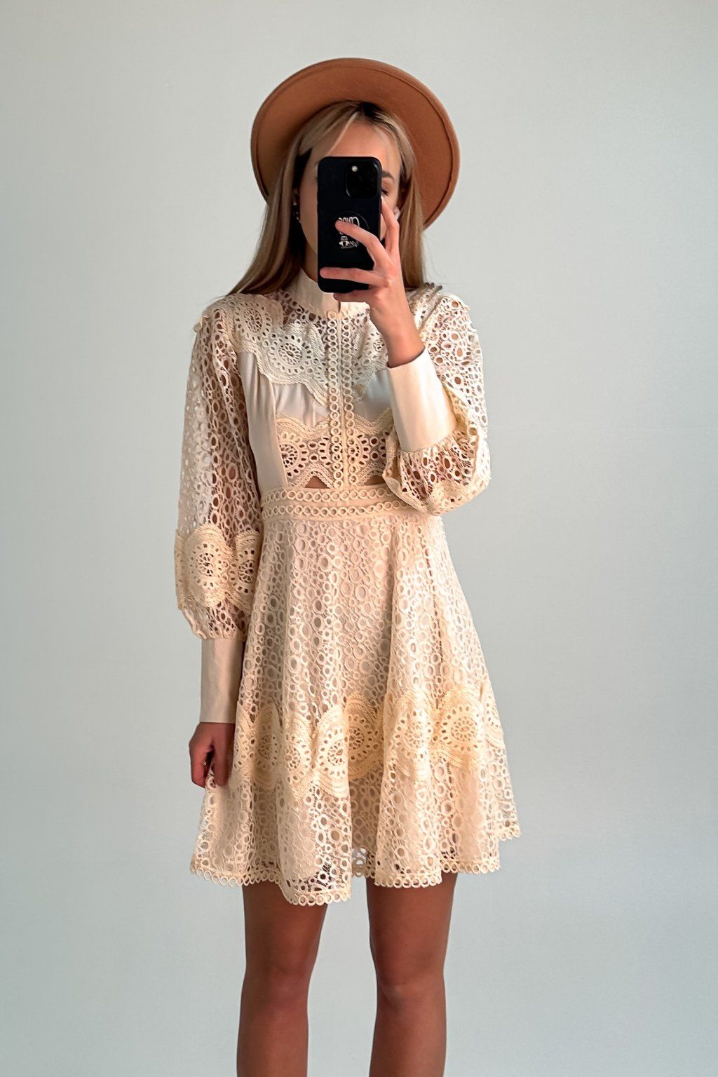 Priliehavé krajkované šaty so spodničkou v A-strihu, s puff rukávmi na gombíky a zipsom na zadnej strane