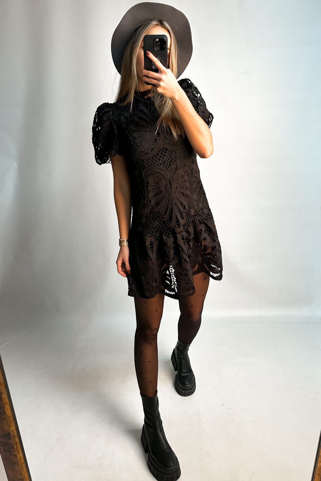 Šaty voľného strihu z masívnej krajky s puff rukávmi a podšívkou ukončené fodričkou.