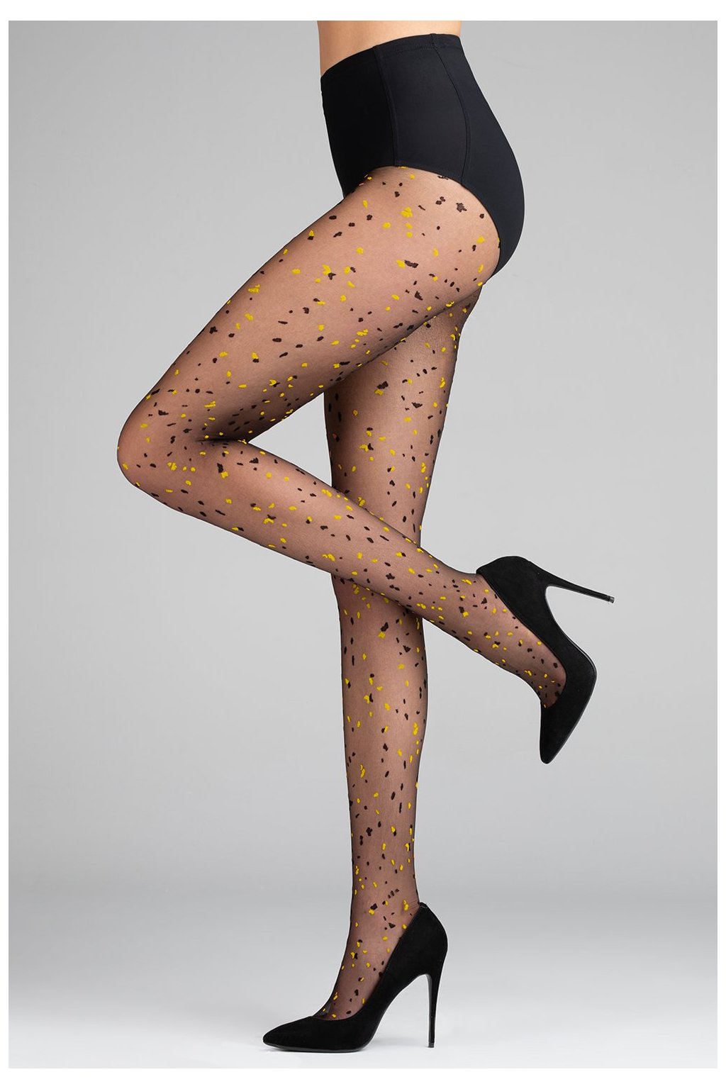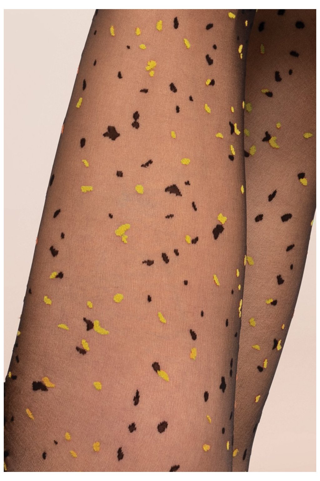 Vzorované silonky hrúbky 20den tvorí čierny priesvitný podklad, ktorý je posiaty čiernymi a žltými fliačikmi po celej ploche pančúch.