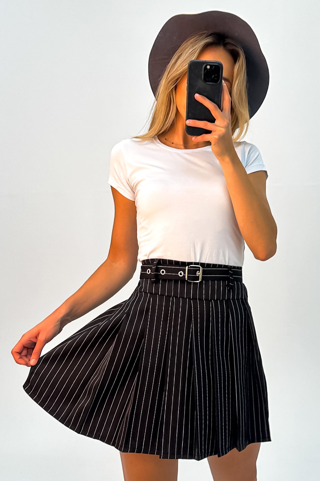 Sukňa v oblekobom štýle skladaná po celej dĺžke s nenápadným zipsom na bočnej strane a s opaskom.