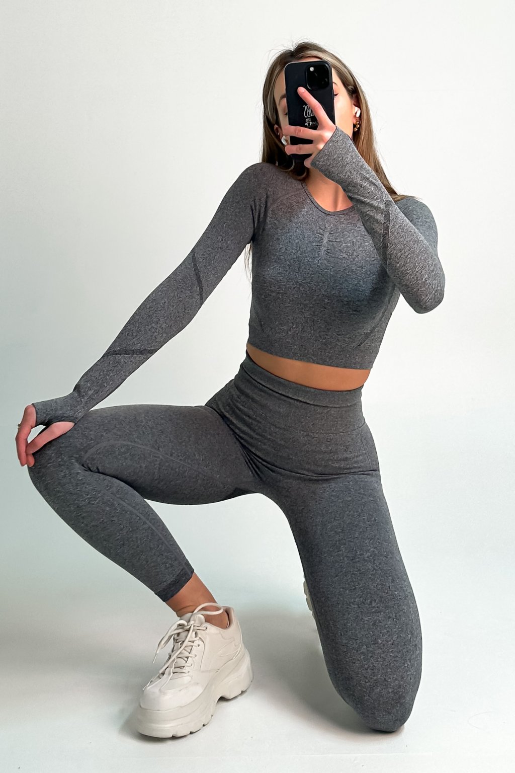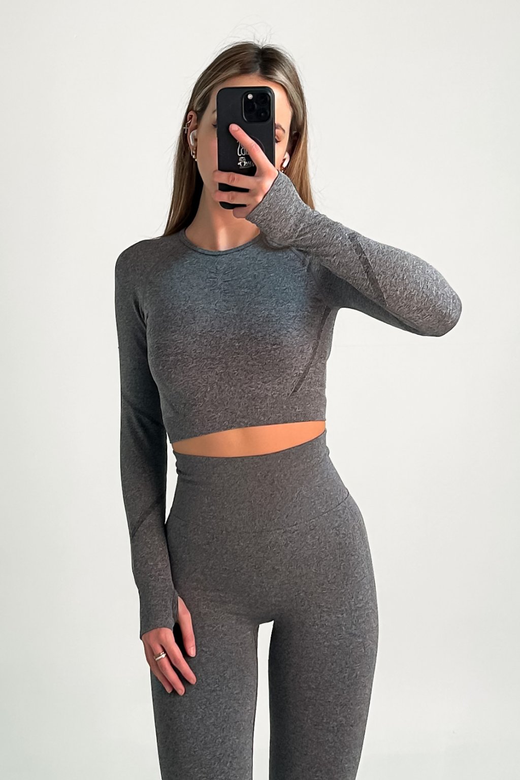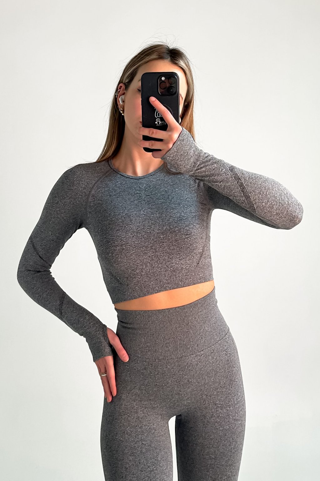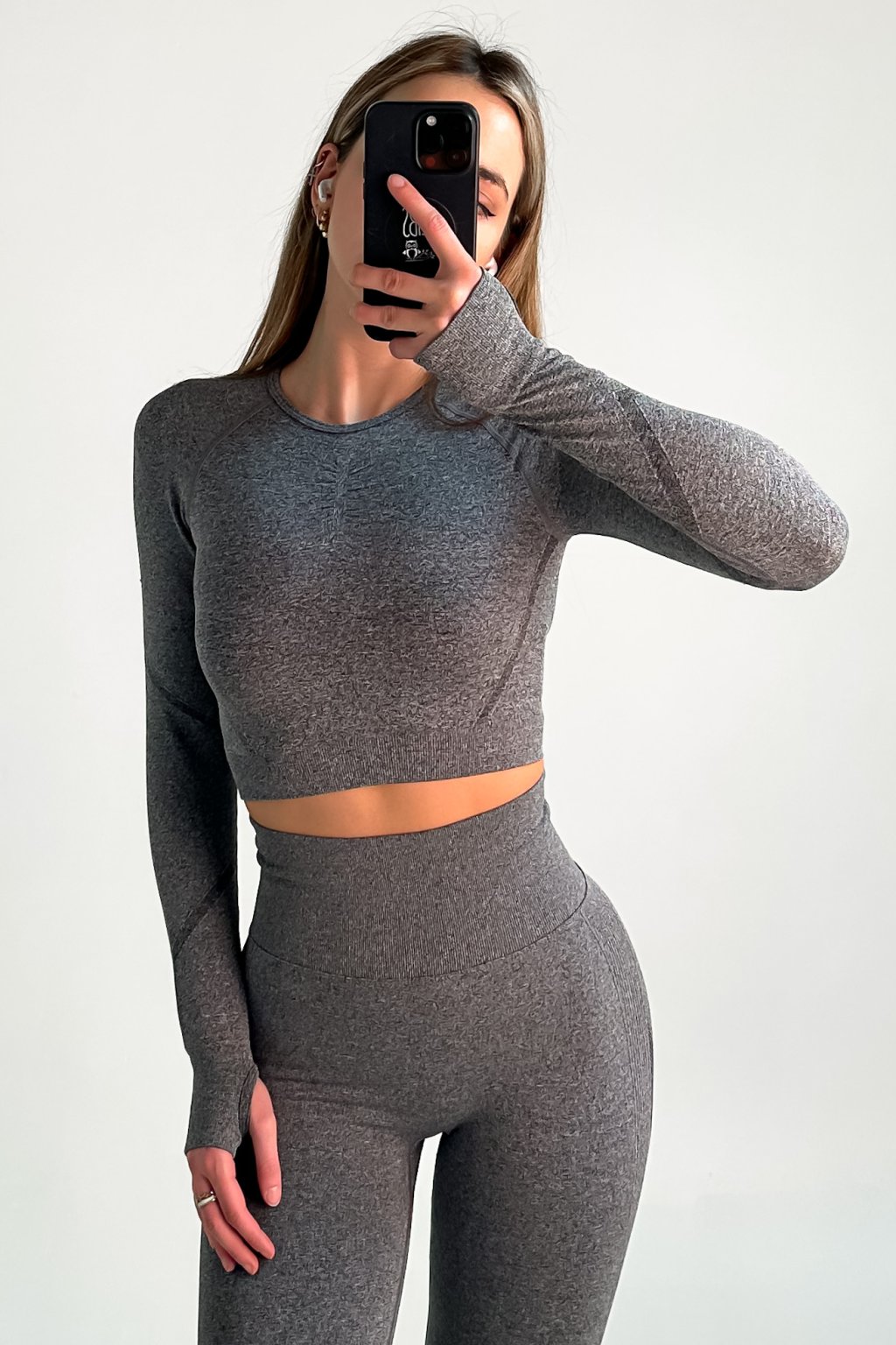 Športové tvarujúce tričko v crop strihu s dlhým rukávom s výrezmi na palcoch a riasením v dekolte.
