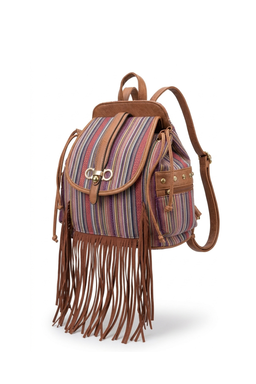 Farebný plátený ruksak lemovaný hnedou koženkou so zapínaním na magnet a sťahovacie šnúrky zdobený zlatými aplikáciami a hnedými strapcovým lemom.
