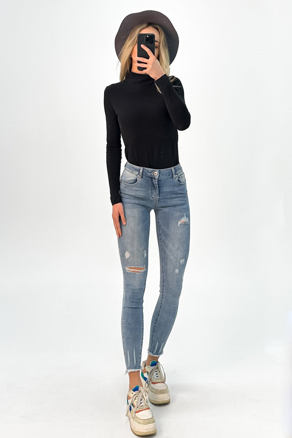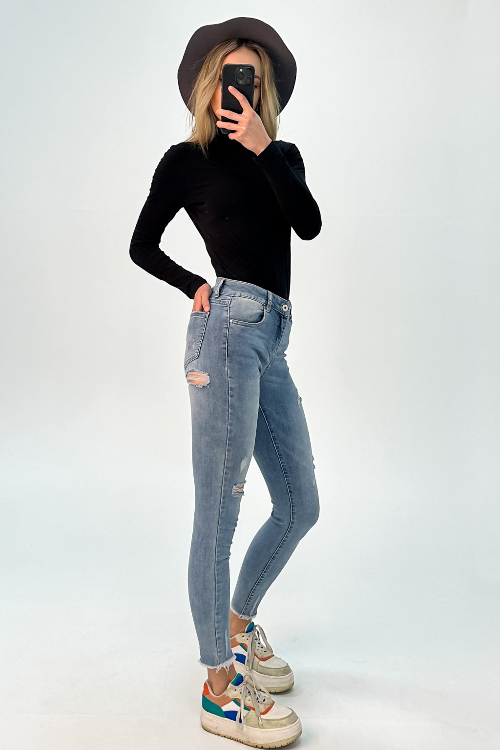 Svetlo modré rifle s tvarovaním na zadnej strane pre push up efekt.