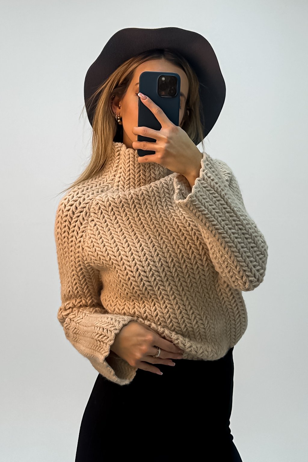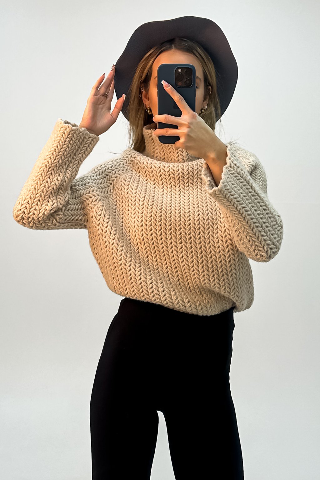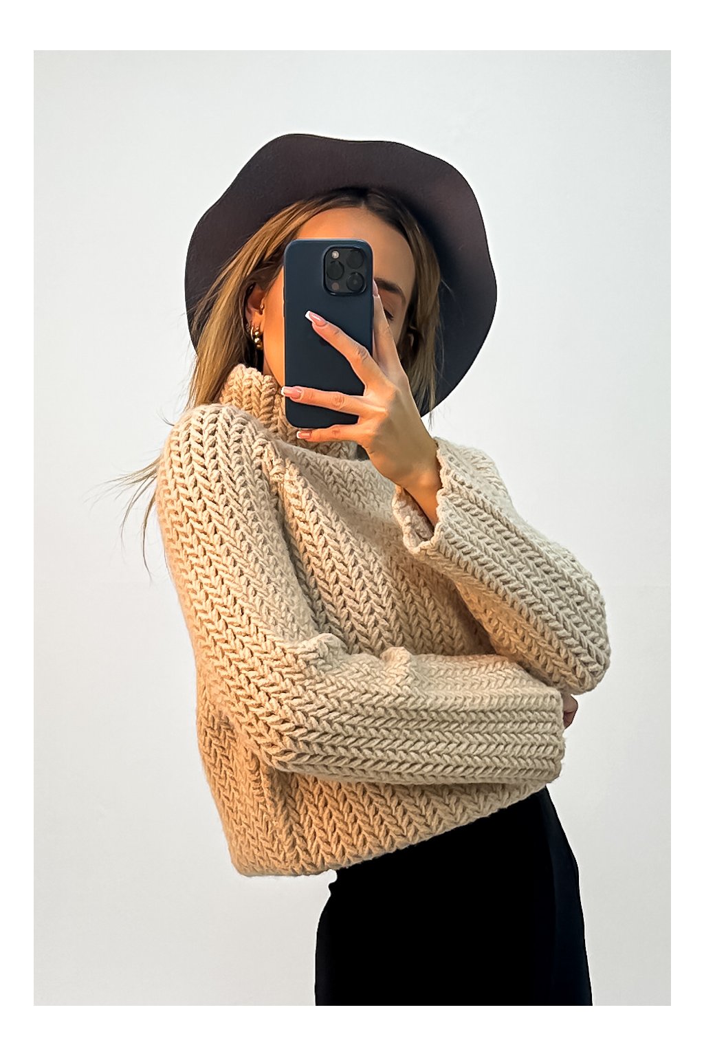 Hebký polorolákový sveter z kvalitného hrubého úpletu ku krku s voľnými rukávmi.