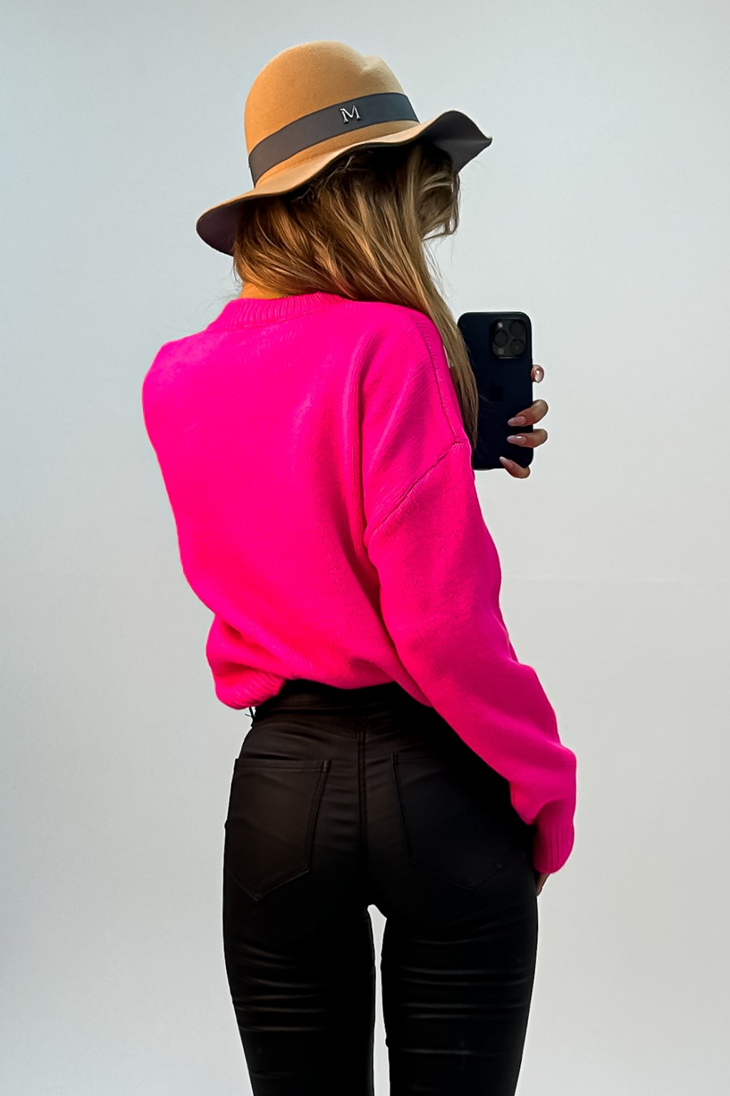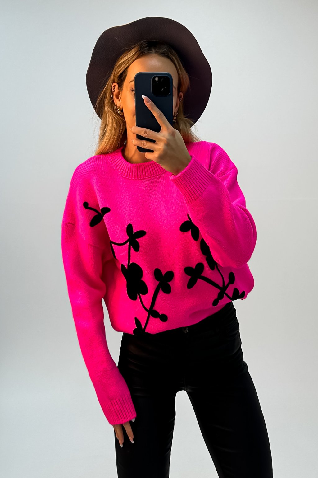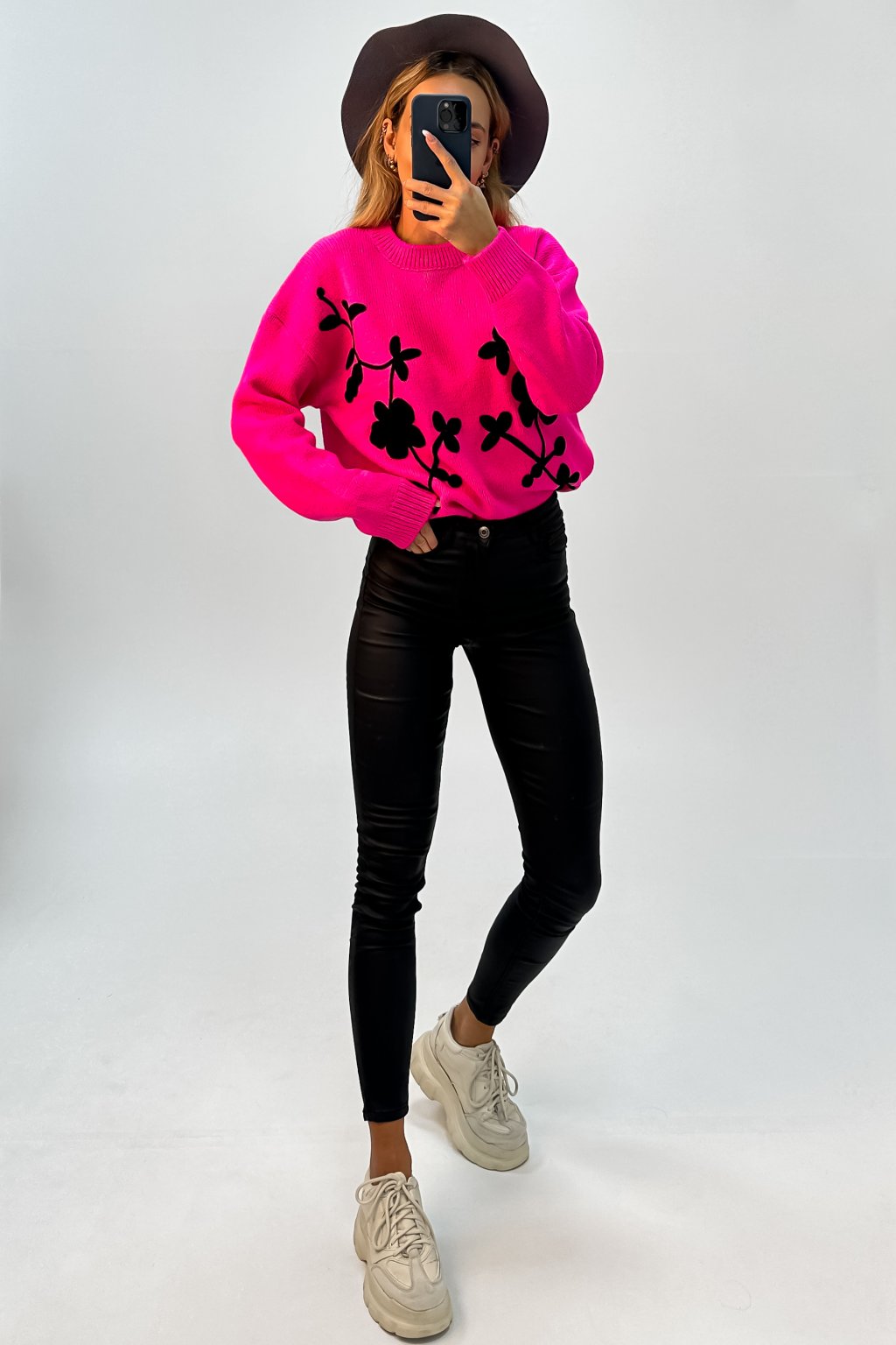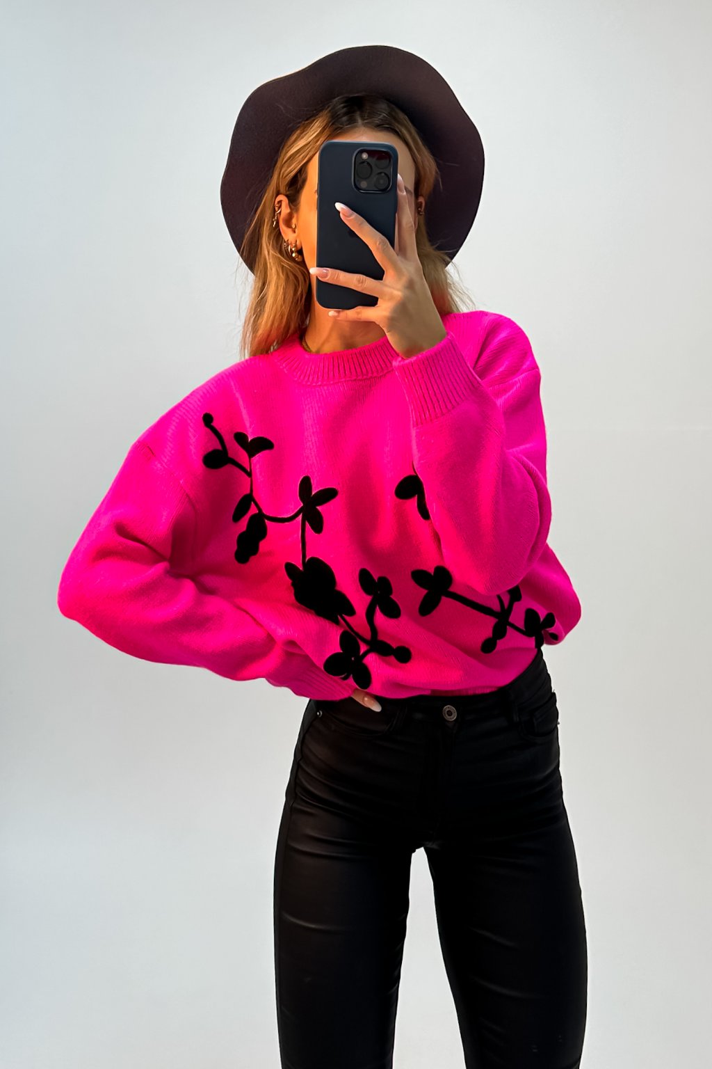 Úpletový oversize sveter ku krku s výšivkou ukončený patentmi