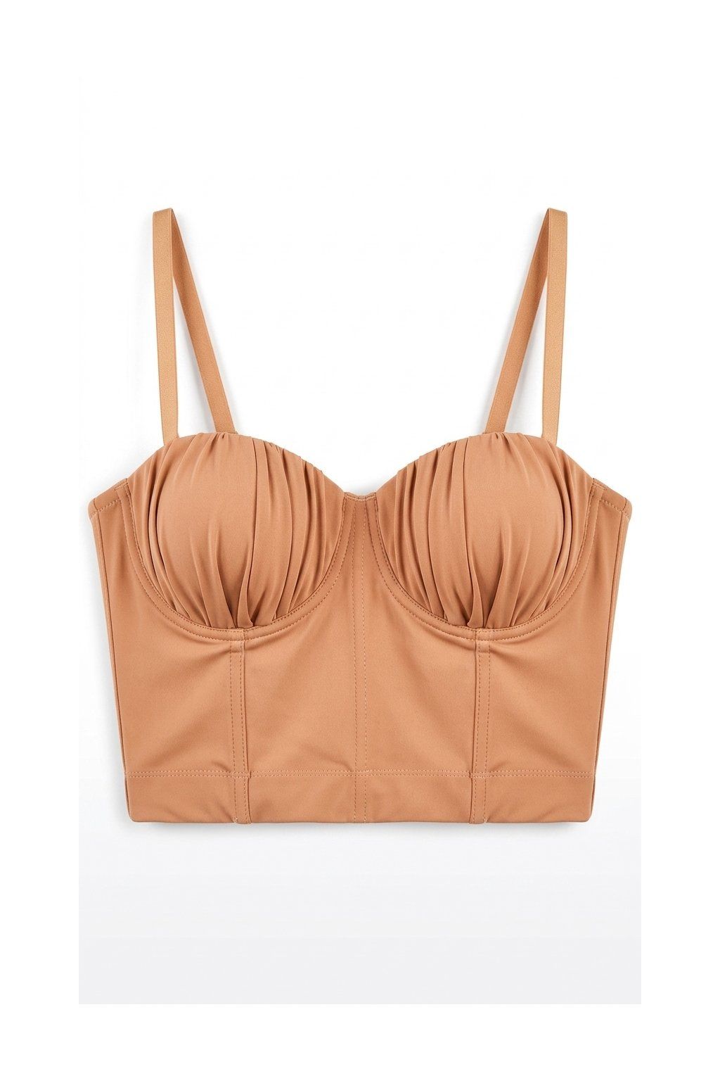 Korzetový bralet s kosticami v béžovej farbe, s odopinateľnými ramienkami. Štvorradové zapínanie so silikonovými pásmi na vnútornej strane pre pohodlné nosenie bez ramienok.