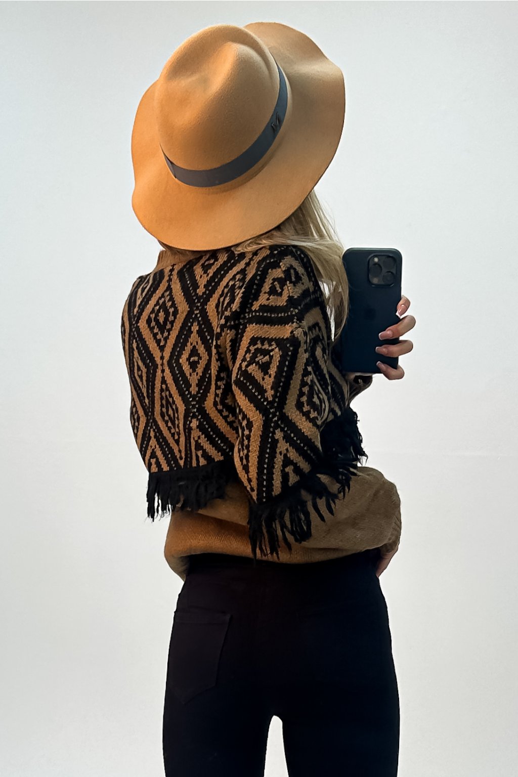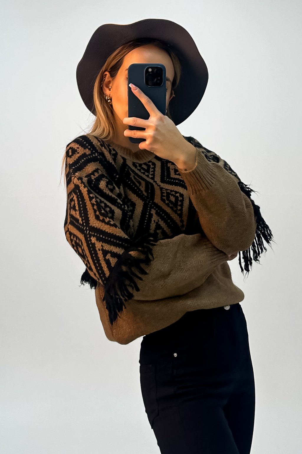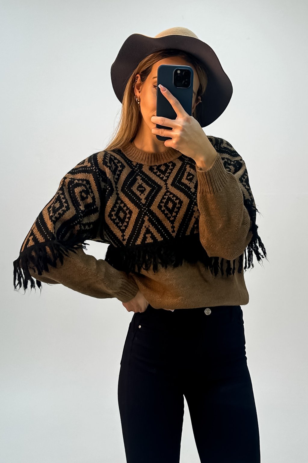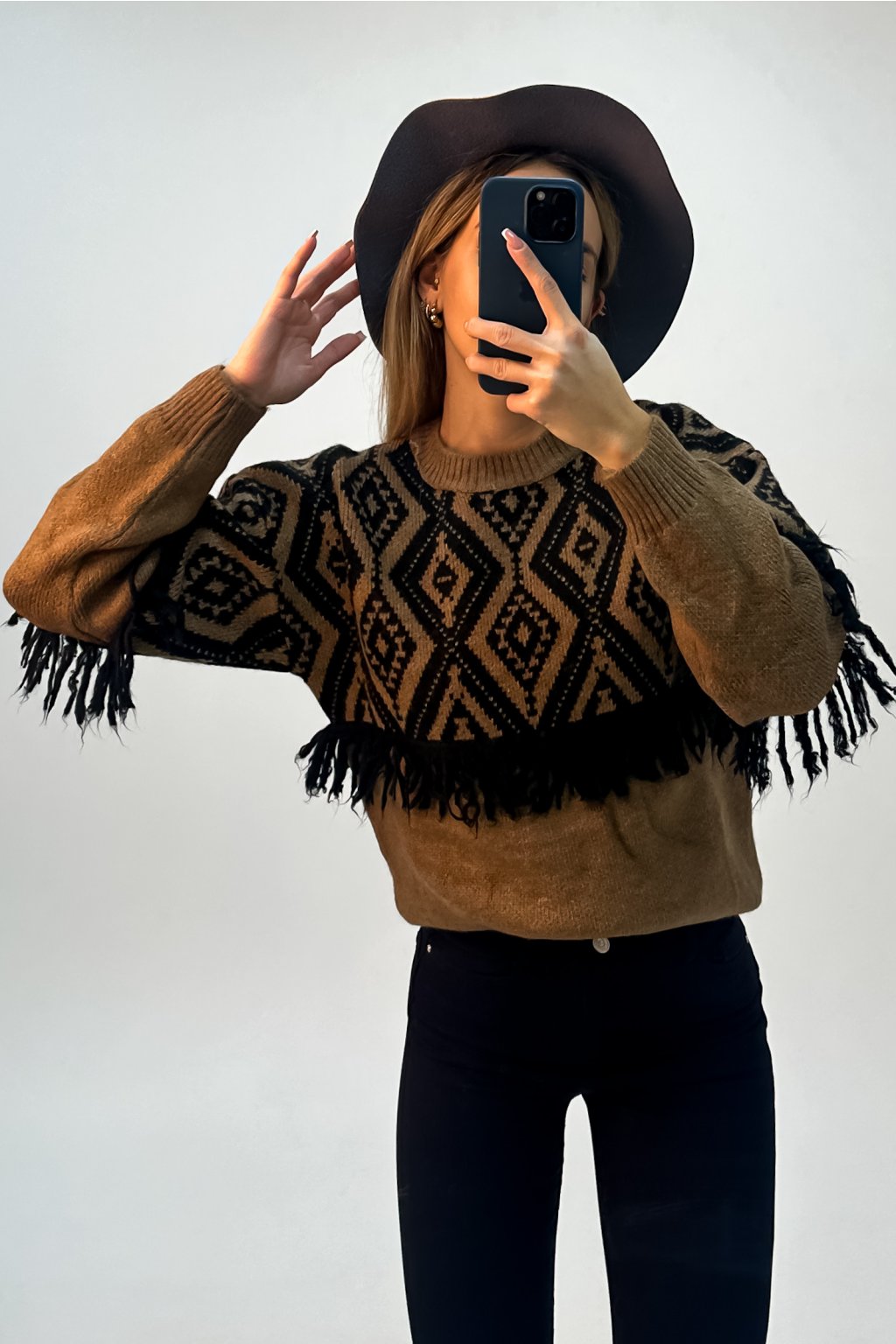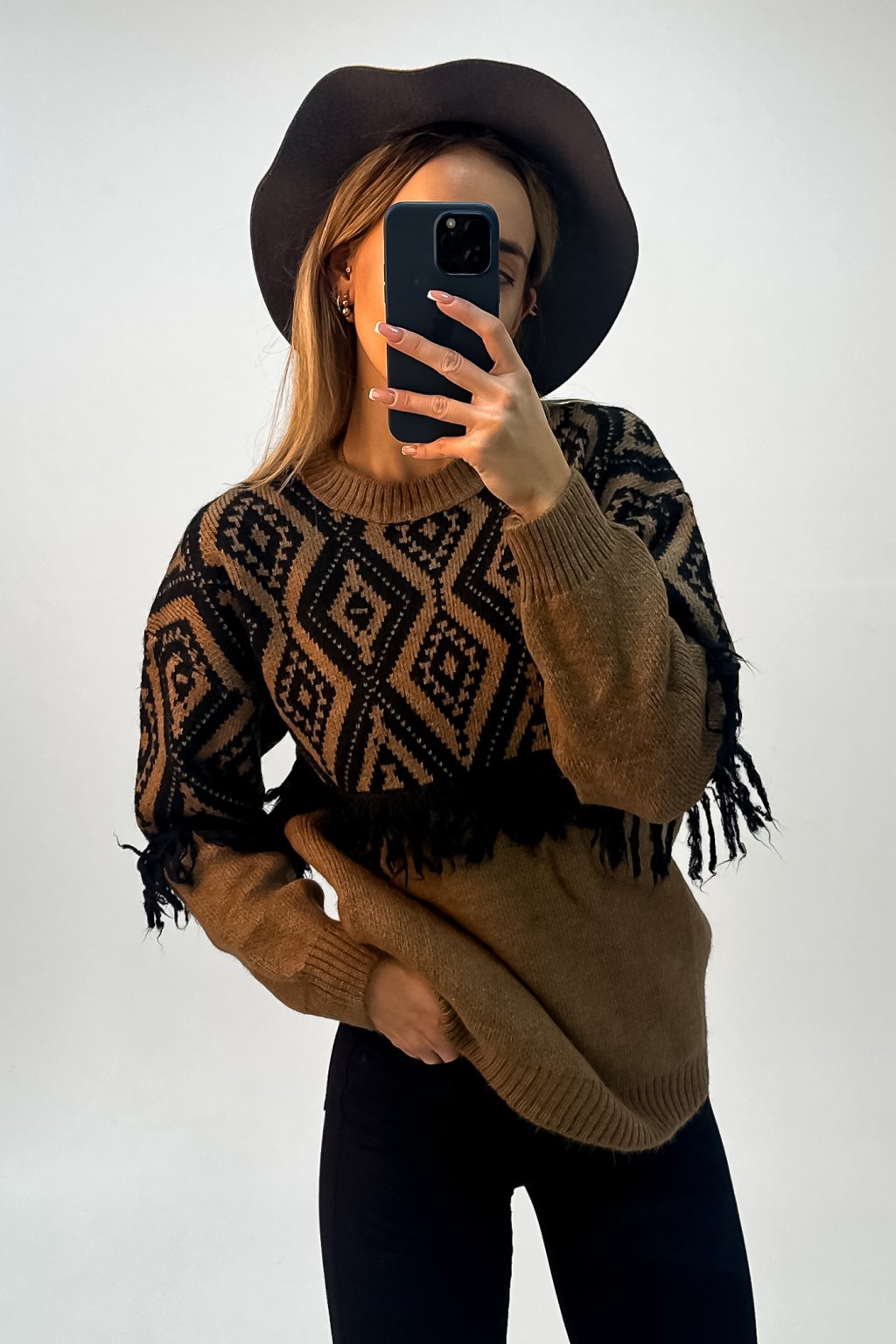 Teplý vzorovaný sveter vo voľnom strihu so strapcami hnedý