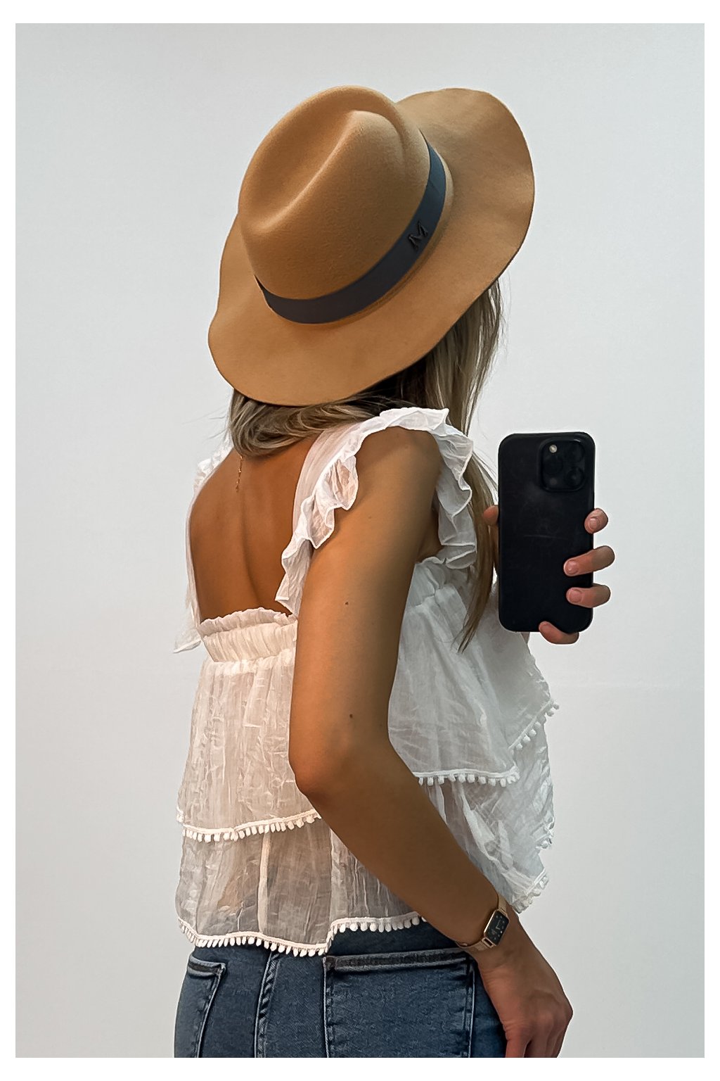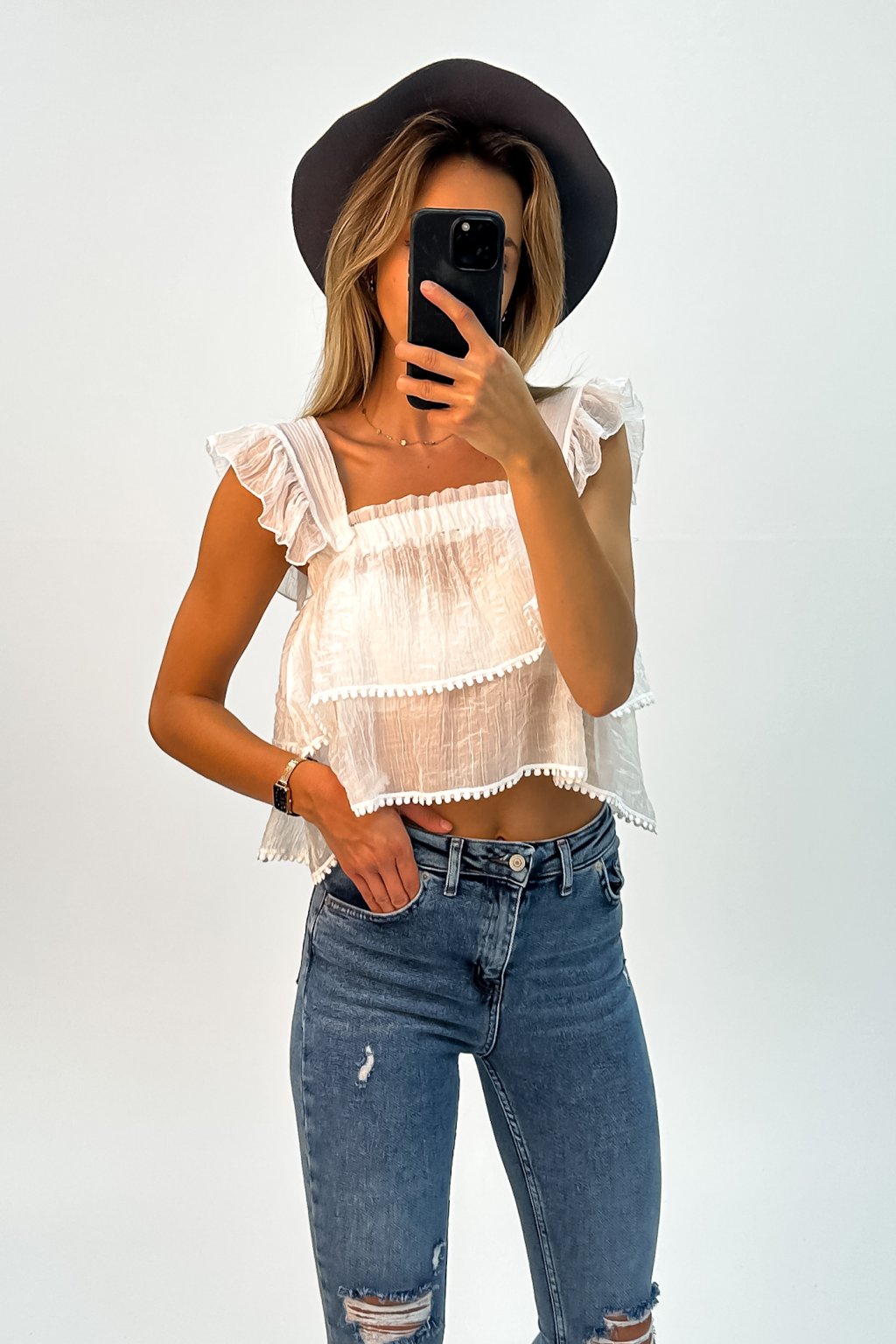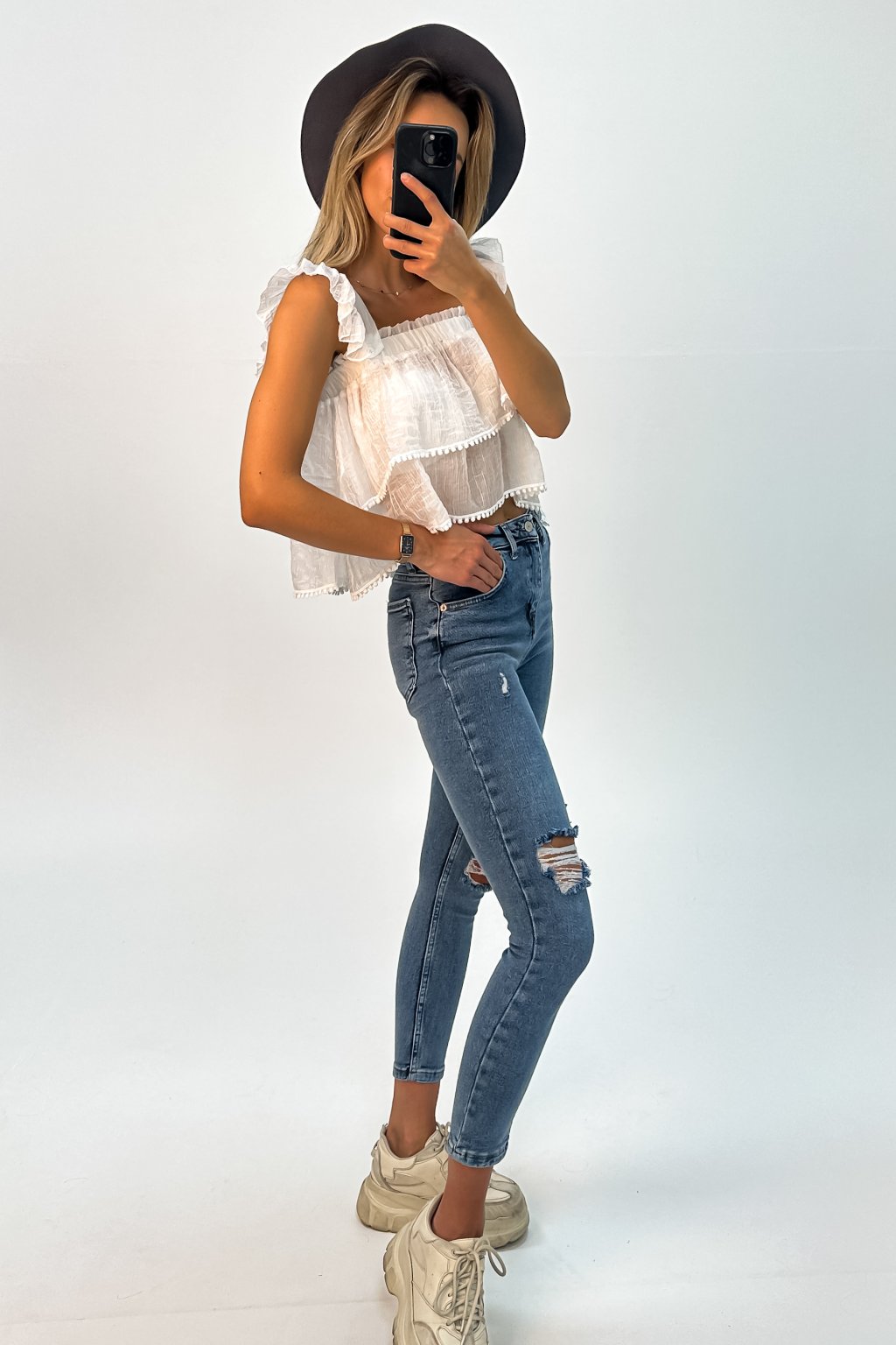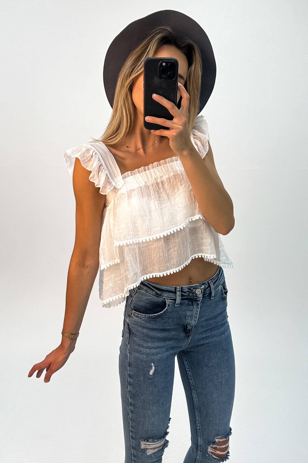 Priesvitný volánový crop-top vo voľnom strihu na ramienka spojenými s topom gombíkmi.