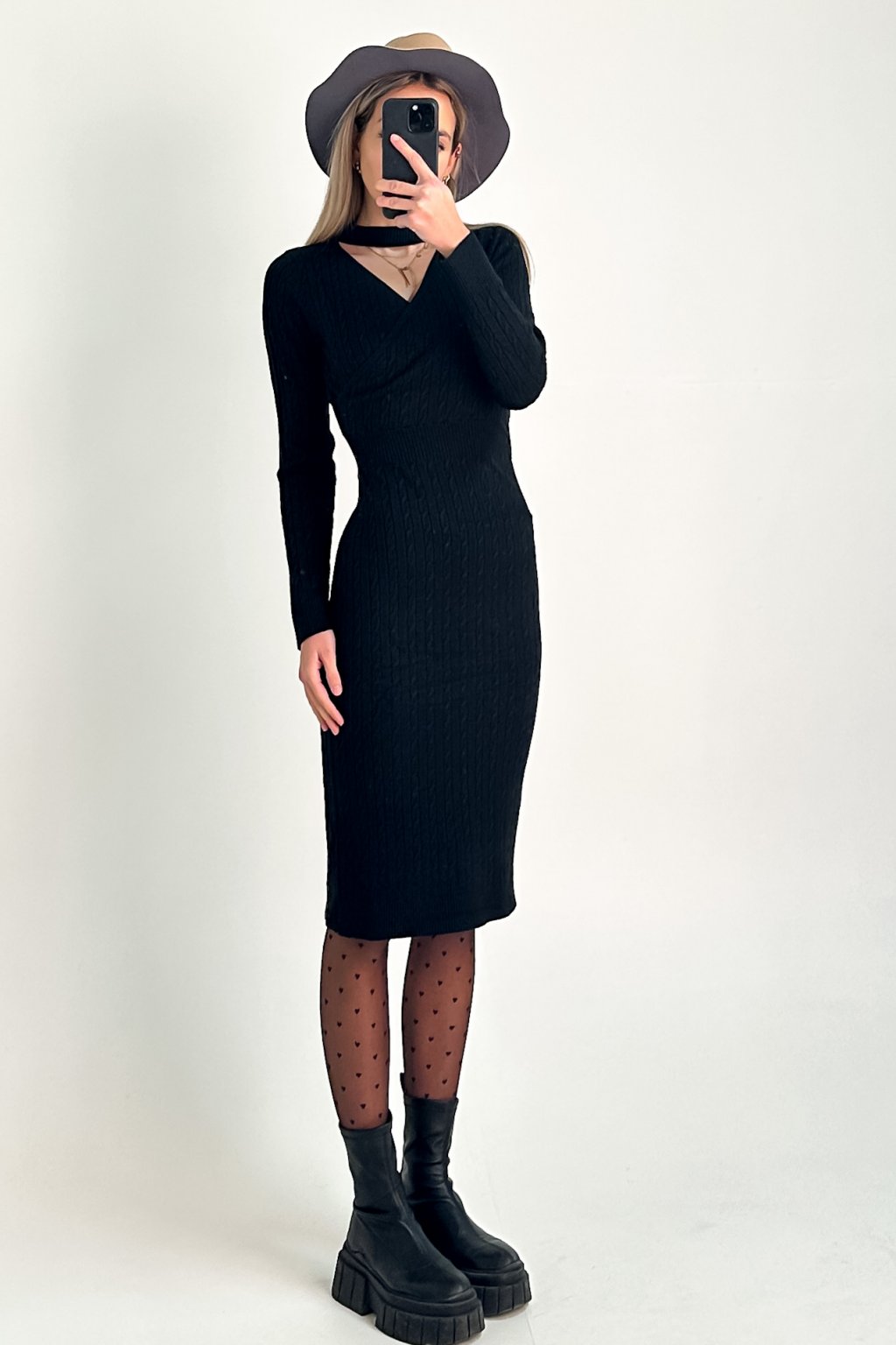 Šaty z jemného vzorovaného úpletu so stiahnutým tvarujúcim pásom a klasickým výstrihom do V, ktorý je zdobený choker-om