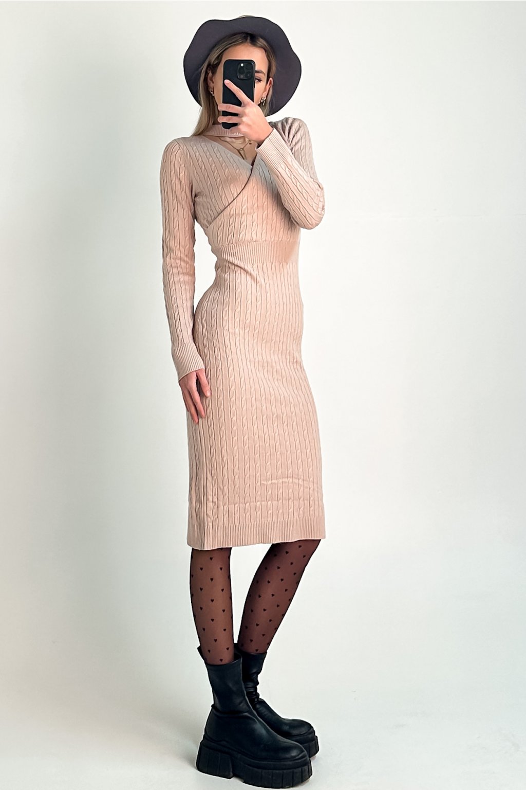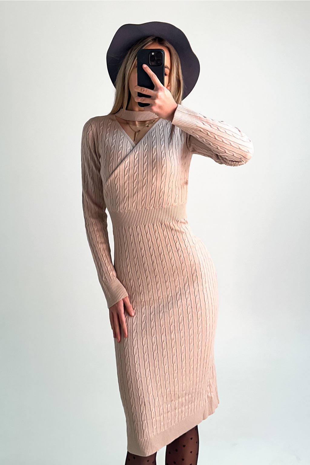 Šaty z jemného vzorovaného úpletu so stiahnutým tvarujúcim pásom a klasickým výstrihom do V, ktorý je zdobený choker-om