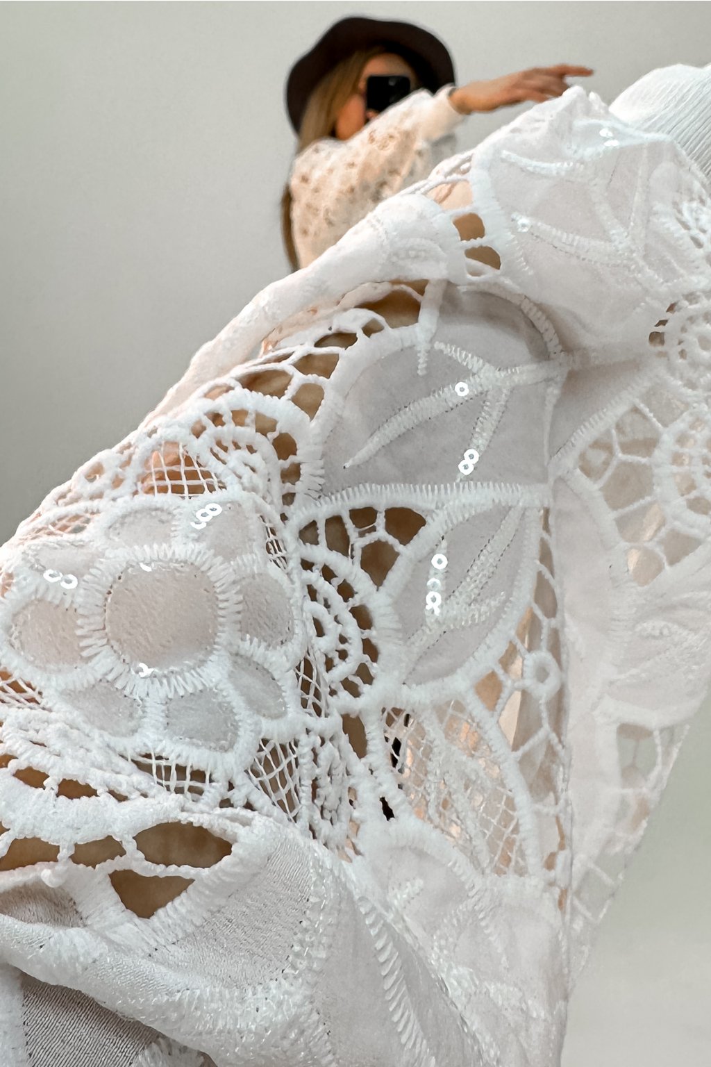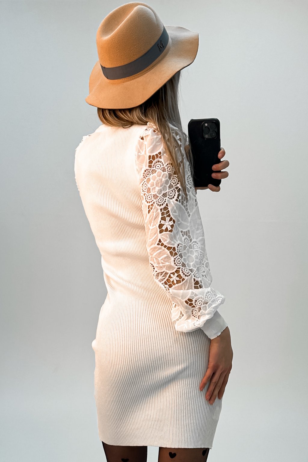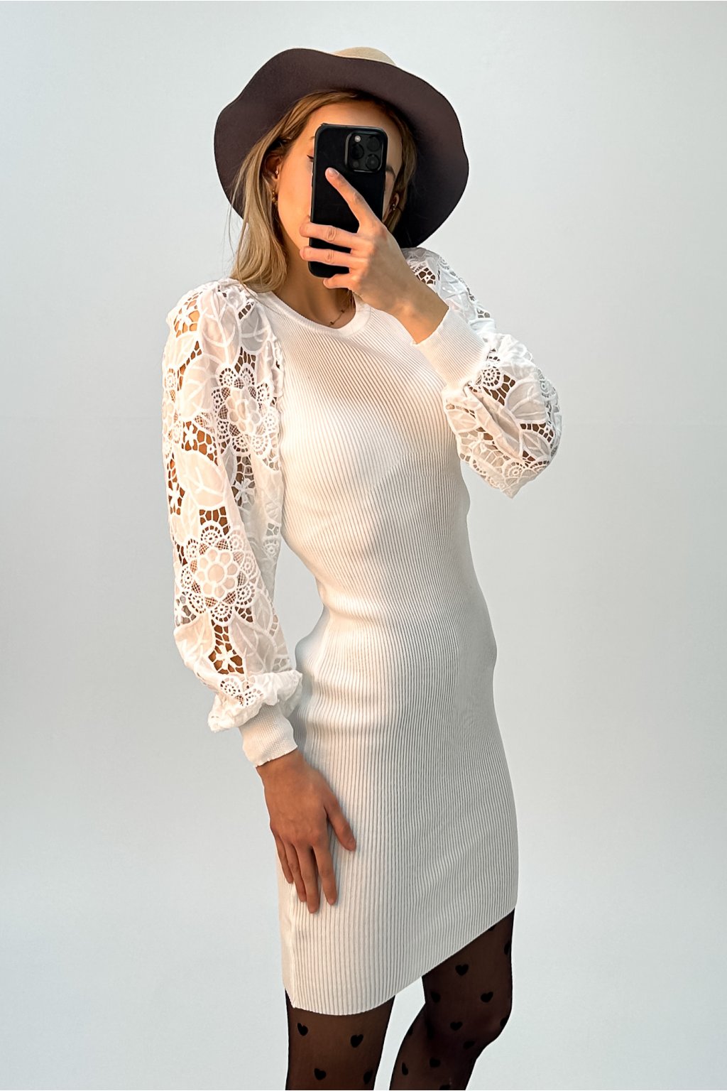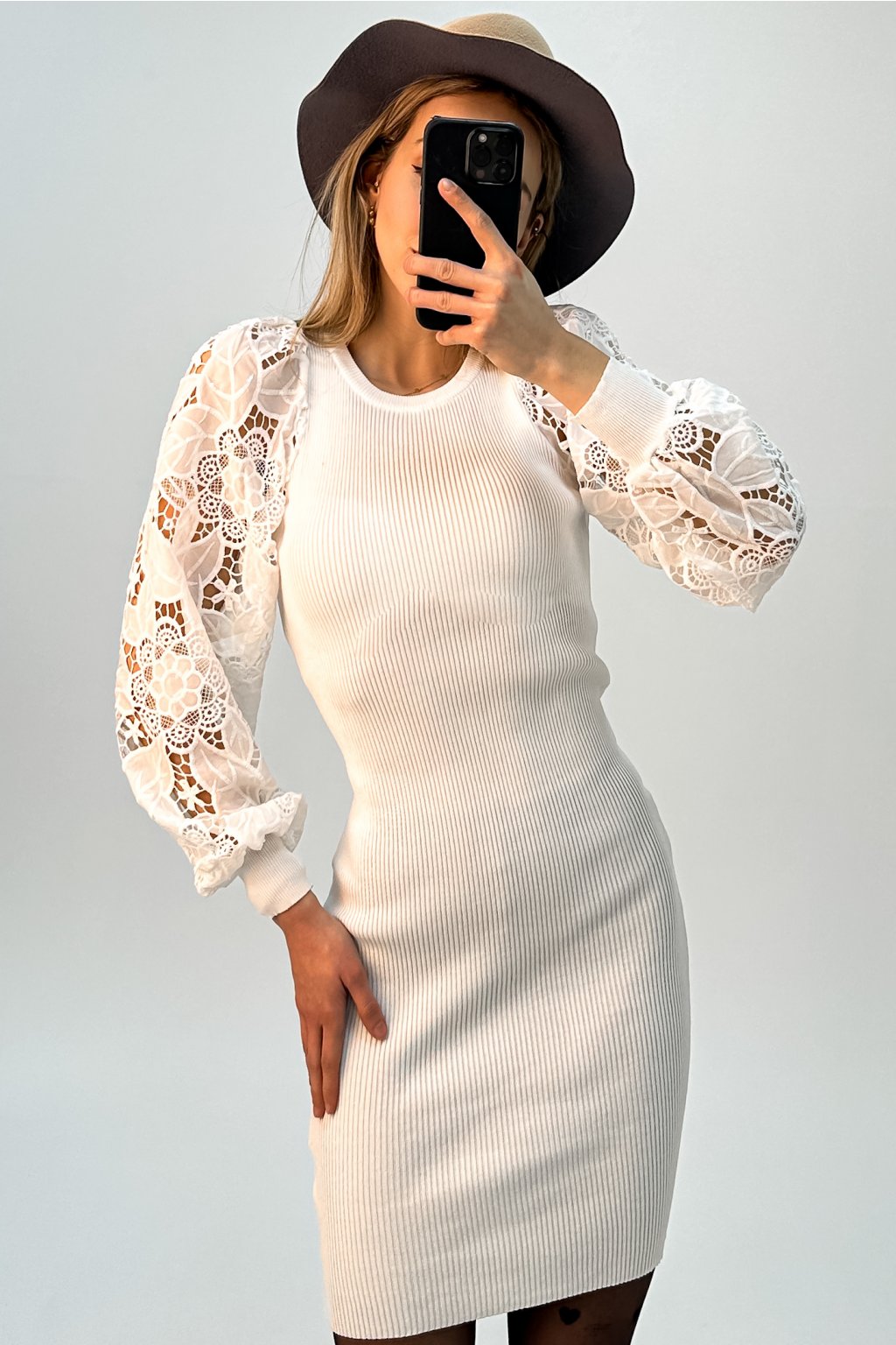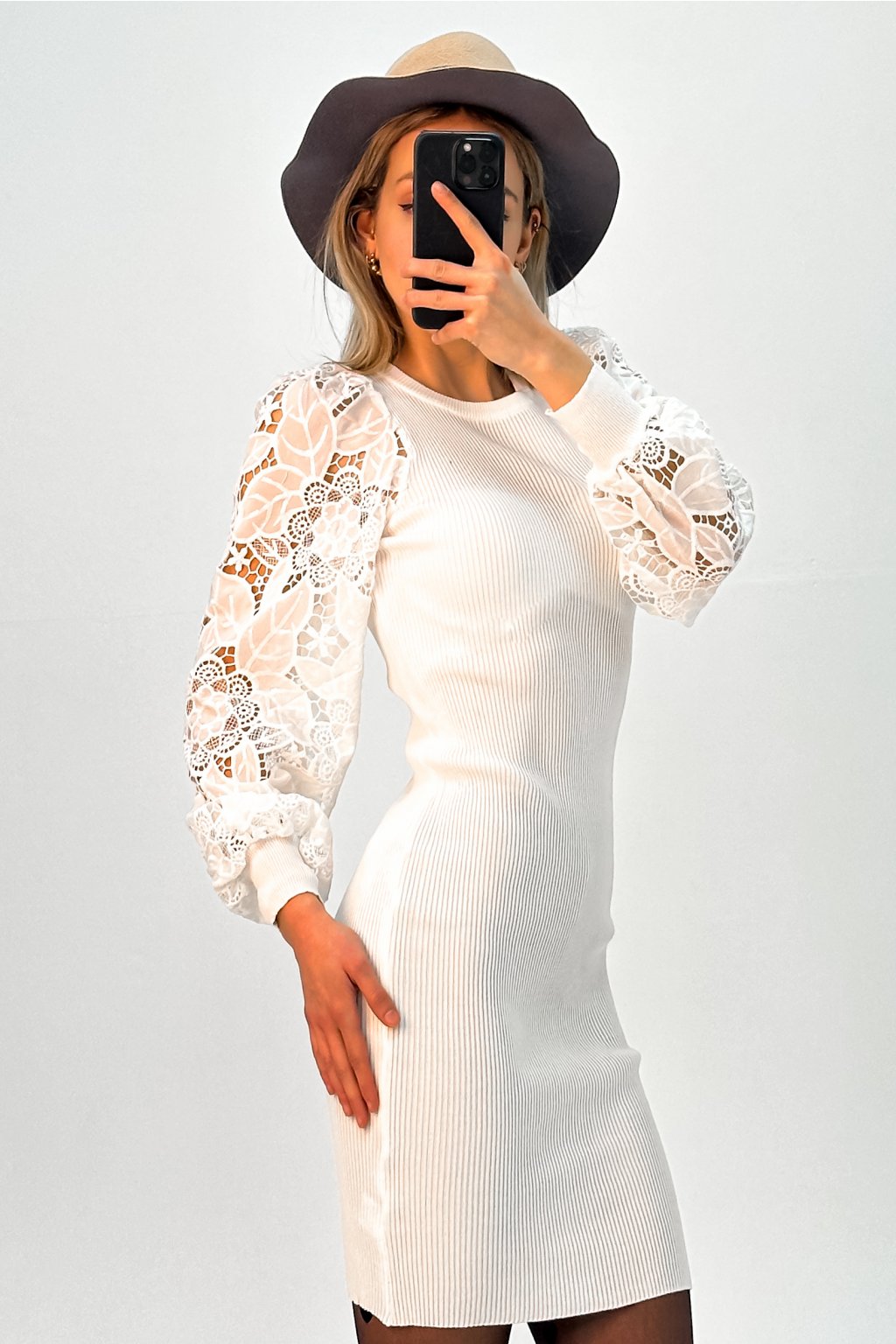 Obtiahnuté vrubkované a elastické úpletové šaty s puff rukávmi z krajky zdobené flitrami.