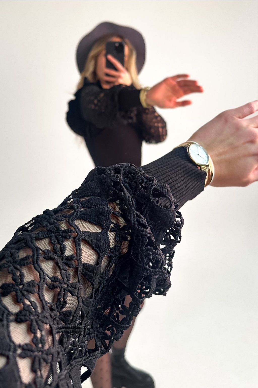 Úpletové šaty s volánikmi a puff rukávmi z týlu a krajky čierne