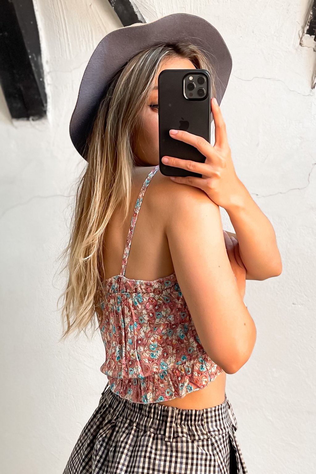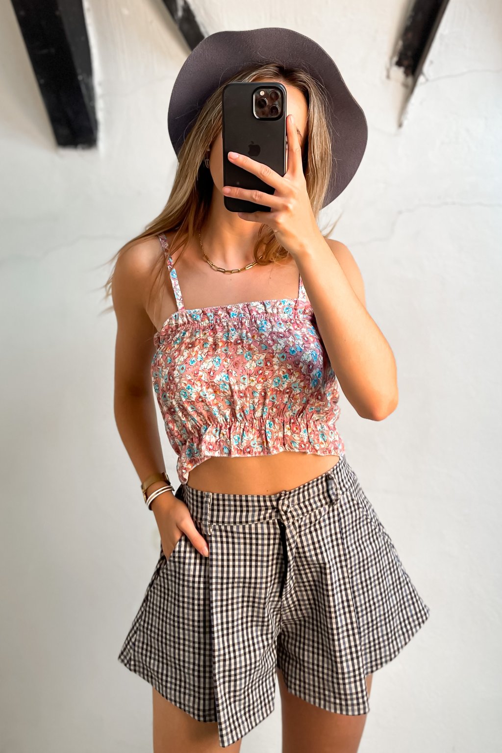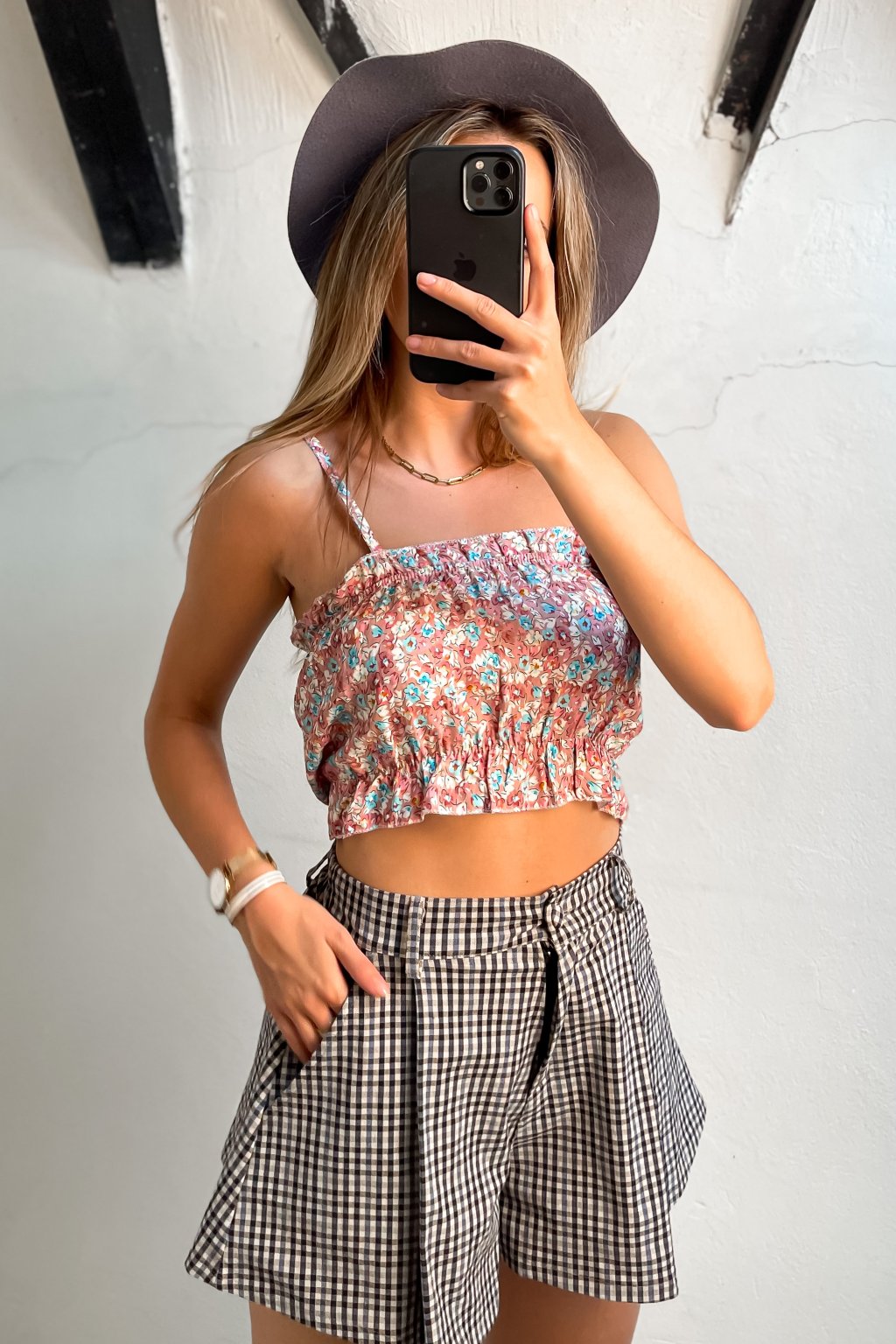 Crop-topový vŕšok s kvetinovým dizajnom z príjemného ľahkého materiálu lemovaný gumičkou.